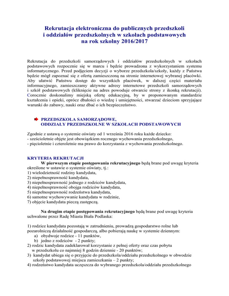 Rekrutacja elektroniczna do publicznych przedszkoli i oddziałów przedszkolnych w szkołach podstawowych na rok szkolny 2016/2017 Rekrutacja do przedszkoli samorządowych i oddziałów przedszkolnych w szkołach podstawowych rozpocznie się w marcu i będzie prowadzona z wykorzystaniem systemu informatycznego. Przed podjęciem decyzji o wyborze przedszkola/szkoły, każdy z Państwa będzie mógł zapoznać się z ofertą zamieszczoną na stronie internetowej wybranej placówki. Aby ułatwić Państwu dostęp do wszystkich placówek, w dalszej części materiału informacyjnego, zamieszczamy aktywne adresy internetowe przedszkoli samorządowych i szkół podstawowych (kliknięcie na adres powoduje otwarcie strony z ikonką rekrutacji). Corocznie doskonalimy miejską ofertę edukacyjną, by w proponowanym standardzie kształcenia i opieki, oprócz dbałości o wiedzę i umiejętności, stwarzać dzieciom sprzyjające warunki do zabawy, nauki oraz dbać o ich bezpieczeństwo. PRZEDSZKOLA SAMORZĄDOWE, ODDZIAŁY PRZEDSZKOLNE W SZKOŁACH PODSTAWOWYCH Zgodnie z ustawą o systemie oświaty od 1 września 2016 roku każde dziecko: - sześcioletnie objęte jest obowiązkiem rocznego wychowania przedszkolnego, - pięcioletnie i czteroletnie ma prawo do korzystania z wychowania przedszkolnego. KRYTERIA REKRUTACJI W pierwszym etapie postępowania rekrutacyjnego będą brane pod uwagę kryteria określone w ustawie o systemie oświaty, tj.: 1) wielodzietność rodziny kandydata, 2) niepełnosprawność kandydata, 3) niepełnosprawność jednego z rodziców kandydata, 4) niepełnosprawność obojga rodziców kandydata, 5) niepełnosprawność rodzeństwa kandydata, 6) samotne wychowywanie kandydata w rodzinie, 7) objęcie kandydata pieczą zastępczą. Na drugim etapie postępowania rekrutacyjnego będą brane pod uwagę kryteria uchwalone przez Radę Miasta Biała Podlaska: 1) rodzice kandydata pozostają w zatrudnieniu, prowadzą gospodarstwo rolne lub pozarolniczą działalność gospodarczą, albo pobierają naukę w systemie dziennym: a) obydwoje rodzice - 11 punktów, b) jedno z rodziców - 2 punkty; 2) rodzic kandydata zadeklarował korzystanie z pełnej oferty oraz czas pobytu w przedszkolu co najmniej 8 godzin dziennie - 20 punktów; 3) kandydat ubiega się o przyjęcie do przedszkola/oddziału przedszkolnego w obwodzie szkoły podstawowej miejsca zamieszkania – 2 punkty; 4) rodzeństwo kandydata uczęszcza do wybranego przedszkola/oddziału przedszkolnego - 15 punktów; 5) rodzeństwo kandydata uczęszcza do funkcjonującej w pobliżu szkoły lub żłobka - 10 punktów; 6) rodzic samotnie wychowujący dziecko pozostaje w zatrudnieniu, prowadzi gospodarstwo rolne lub pozarolniczą działalność gospodarczą, albo pobiera naukę w systemie dziennym - 11 punktów. REKRUTACJA KROK PO KROKU: Przedstawiamy Państwu informację na temat zasad prowadzonego naboru na rok 2016/2017. Dzieci kontynuujące edukację przedszkolną w dotychczasowym przedszkolu/oddziale przedszkolnym nie biorą udziału w rekrutacji. Rodzice składają jedynie deklarację o kontynuowaniu wychowania przedszkolnego, w terminie do 7 dni przed rozpoczęciem rekrutacji. Nabór na wolne miejsca w przedszkolu rozpocznie się marca 2016 r. Kandydaci, których rodzice ubiegają się o przyjęcie do przedszkola/oddziału przedszkolnego po raz pierwszy lub których rodzice zdecydują się na zmianę przedszkola/oddziału przedszkolnego, uczestniczą w postępowaniu rekrutacyjnym na rok szkolny 2016/2017 prowadzonym z wykorzystaniem systemu informatycznego. System zostanie uruchomiony 4 marca 2016 roku o godz. 8.00. Osoby, które nie mają dostępu do internetu lub będą miały kłopoty w korzystaniu z systemu otrzymają pomoc w przedszkolu/szkole podstawowej. Postępowanie rekrutacyjne prowadzone jest na wniosek rodzica. Formularz wniosku będzie dostępny do wypełnienia po zalogowaniu się do systemu informatycznego na stronie internetowej pod adresem: https://naborp-kandydat.vulcan.net.pl/bialapodlaska ........... lub przez stronę internetową przedszkola/szkoły podstawowej pierwszego wyboru. Rodzice będą zobowiązani do podania krok po kroku danych zgodnie z formularzem wniosku i wybrania trzech przedszkoli/szkół podstawowych wg własnych preferencji po zapoznaniu z pełną ofertą placówek. Osobista wizyta w przedszkolu/szkole podstawowej pierwszego wyboru będzie potrzebna, aby złożyć wypełniony wniosek (wydrukowany z systemu i podpisany) wraz z dokumentami i oświadczeniami potwierdzającymi spełnienie kryteriów. OFERTA WYCHOWANIA PRZEDSZKOLNEGO PRZEDSZKOLA SAMORZĄDOWE Przedszkole Samorządowe PS nr 3 im. Marii Kownackiej PS nr 6 ul. Łomaska 21 PS nr 7 ul. Waryńskiego 1 PS nr 10 ul. Nowa 20/24 PS nr 11 ul. Sidorska 20 PS nr 13 ul. Kazimierza Jagiellończyka 17 ul. Łukaszyńska 34 PS nr 14 lokalizacja ul. Warszawska 19c PS nr 15 im. Juliana Tuwima ul. Akademicka 8 SP Integracyjne nr 16 im. Jana Brzechwy PS nr 17 ul. Wesoła 21/23 ul. Zygmunta Starego 4 nr telefonu 83 341-64-16 83 341-64-17 83 341-64-62 83 341-64-63 83 341-64-32 83 341-64-33 83 341-64-65 83 341-64-66 83 341-67-35 83 341-67-36 83 341-64-77 83 341-64-78 83 341-64-67 83 341-64-68 83 341-67-67 83 341-67-68 83 341-67-69 83 341-64-69 83 341-64-70 83 341-64-38 83 341-64-39 strona internetowa www.przedszkole3bp.edu.pl www.przedszkole6bp.home.pl www.siodemeczka.edupage.org www.ps10.edubp.pl www.przedszkole11.info.pl www.przedszkole13.tau.pl www.p14.yum.pl www.przedszkolepietnastka.republika.pl www.p16bp.edu.pl www.p17bp.ugu.pl ODDZIAŁY PRZEDSZKOLNE W SZKOŁACH PODSTAWOWYCH Szkoła Podstawowa SP nr 1 im. ks. Stanisława Brzóski w Zespole Szkół Ogólnokształcących nr 3 SP nr 2 im. Bohaterskich Lotników Podlasia SP nr 3 im. Marii Konopnickiej lokalizacja nr telefonu ul. Narutowicza 41 83 341-64-75 83 343-80-14 SP nr 4 im. Kornela Makuszyńskiego SP z Oddziałami Integracyjnymi nr 5 im. Jana Kochanowskiego w Zespole Szkół z Oddziałami Integrac