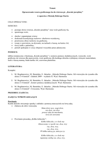 Temat: Opracowanie wzoru graficznego 6a do wiersza pt. „Korale jarzębiny” w oparciu o Metodę Dobrego Startu CELE OPERACYJNE: DZIECKO: • • poznaje słowa wiersza „Korale jarzębiny” oraz wzór graficzny 6a, spostrzega wzór, • • • • • • słucha i zapamiętuje wiersz doskonali koordynację ruchowo- słuchowo-wzrokową, przetwarza obraz ruchowy na graficzny, rysuje w powietrzu, na dywanie, na tackach z kaszą, na kartce A4, toczy kulki z palsteliny, potrafi spokojnie w ciszy obejrzeć wszystkie prace plastyczne. POMOCE: tablica tematyczna z ilustracją „Korale jarzębiny” z zestawu pomocy dydaktycznych, woreczki, wzór graficzny do wiersza dla nauczyciela, wzór graficzny dla każdego dziecka wyklejony różnymi materiałami, tacki z kaszą manną, biała kartka A4, czerwona plastelina. LITERATURA: Komplet: 1. M. Bogdanowicz, M. Barańska, E. Jakacka: „Metoda Dobrego Startu. Od wierszyka do rysunku dla dzieci 3-4 letnich”. Gdańsk 2009 – wydanie II. Wyd. Harmonia 2. M. Bogdanowicz, M. Barańska, E. Jakacka: „Metoda Dobrego Startu. Od wierszyka do rysunku dla dzieci 3-4 letnich”. Zestaw pomocy dydaktycznych. Wyd. Harmonia 3. M. Bogdanowicz, M. Barańska, E. Jakacka: „Metoda Dobrego Startu. Od wierszyka do rysunku dla dzieci 3-4 letnich”. Ćwiczenia. Wyd. Harmonia PRZEBIEG ZAJECIA: ZAJĘCIA WPROWADZAJĄCE Powitanie Każde dziecko otrzymuje opaskę i zakłada z pomocą nauczyciela na lewą rękę. • Zabawa do słów wierszyka Mam dwie ręce, nogi dwie, raz dwa, raz dwa prawa ręka do machania, lewa do ziewania • Powitanie piosenką „Kółko kółeczko”: Kółko kółeczko, a w kole my Klaszczemy w rączki raz, dwa, trzy raz, dwa, trzy, raz, dwa, trzy, W kółku tańczę ja, tańczysz ty. Kółko kółeczko, a w kole my tupniemy nóżką raz, dwa, trzy, raz, dwa, trzy, raz, dwa, trzy, tupię nóżką ja, tupiesz Ty. Kółko kółeczko, a w kole my teraz skaczemy raz, dwa, trzy, raz, dwa, trzy, raz, dwa, trzy, Teraz skaczę ja, skaczesz Ty. Ćwiczenia rozwijające orientację w schemacie ciała: • Zabawa „Lewa, prawa" lewa ręka wita się z głową: dzień dobry główko, lewa ręka wita się z brzuszkiem: dzień dobry brzuszku, prawa ręka wita się z szyją: dzień dobry szyjko, prawa ręka wita się z kolanem: dzień dobry kolano. Ćwiczenia kształtujące orientację w przestrzeni • Zabawa „Stań obok" Dzieci biegają swobodnie po sali. Na sygnał zatrzymują się i stają obok przedmiotu wymienionego przez nauczycielkę (np. obok stolika, obok tablicy, obok łóżeczka, obok biurka, itp.). Nauka wierszyka Nauczyciel mówi wierszyk: Nawlekam na nitkę czerwone korale, Bo mama w koralach wygląda wspaniale. Dzieci słuchają wierszyka, a potem powtarzają - najpierw po jednym wersie, a następnie cały wierszyk. Dzieci wyklaskują, wytupują mówiąc wiersz. Ćwiczenia językowe Osoba prowadząca pokazuje dzieciom kolorowy obrazek. Przyjrzyjcie się obrazkowi i powiedzcie: • Co widzicie na obrazku? (dziewczynkę, zajączka, jarzębinę, nitkę, itp.) • Co robi dziewczynka? (nawleka na nitkę jarzębinę) • Ile kulek jarzębiny nawlekła na nitkę? (trzy) • Ile korali trzyma w rękach? (1) • Ile jeszcze korali jarzębiny leży na stole? (5) • Ile korali jarzębiny leży na podłodze? (4) Demonstrowanie korali jarzębiny – nawlekanie na nitkę 3 korali jarzębiny. ZAJĘCIA WŁAŚCIWE Ćwiczenia ruchowe • Zabawa „Jarzębina” Dowolne ustawienie na dywanie – dzieci stoją prosto, unoszą wysoko ręce i wyobrażają sobie, że są drzewem jarzębiny, które szumią na wietrze. Podskakują, by zerwać z drzewa kilka korali jarzębiny. Kilka korali spadło na trawę - kucają i stukają palcami, piąstką w podłogę, naśladują odgłos spadających korali jarzębiny. Ćwiczenia ruchowo-słuchowe • dzieci mówią rytmicznie wierszyk i klaszczą, powtarzając wierszyk ponownie i uderzają dłońmi o nogi naprzemiennie, Na – wle – kam – na – ni – tkę – cze – rwo – ne – ko – ra – le Bo – ma – ma – w ko – ra – lach – wy – glą – da – wspa – nia – le. • Dzieci siadają do stolika - otrzymują woreczek z ryżem dla każdego z dzieci oraz osoby prowadzącej - wypowiadanie wierszyka z jednoczesnym dotykaniem woreczka, dzieci uderzają rytmicznie zaciśniętą piąstką, ugniatają rytmicznie woreczek mówiąc pierwszy wers wierszyka. 1 2 3 Na / wle/ kam // na / ni / tkę // cze / rwo / ne // ko / ra / le// Ćwiczenia ruchowo - słuchowo – wzrokowe Etap I: Prezentacja i omówienie budowy i sposobu rysowania wzoru • • prowadzący zadaje dzieciom pytania: co ten wzór wam przypomina?/korale jarzębiny/ gdzie taki sam wzór widzieliście? /dzieci wskazują kolorową ilustrację/ dzieci przyglądają się, w jaki sposób rysować wzór, jednocześnie rytmicznie mówiąc wierszyk; pokazuje miejsce od którego należy rozpocząć jego rysowanie i w jakim kierunku prowadzić rękę /od lewej do prawej/ 1 2 3 Na / wle/ kam // na / ni / tkę // cze / rwo / ne // ko / ra / le// Etap II: Uczenie się polisensoryczne • dzieci mówiąc rytmicznie wierszyk, dotykają palcem wskazującym wzór graficzny przedstawiający korale jarzębiny, wyklejony materiałami o różnej fakturze. Etap III: Odtwarzanie wzoru • tacki z kaszą - dzieci rysują wzór graficzny na tacce z kaszą mówiąc rytmicznie wierszyk „Korale jarzębiny”, 1 2 3 Na / wle/ kam // na / ni / tkę // cze / rwo / ne // ko / ra / le// • • • na białej kartce tworzą trzy kropki – korale jarzębiny- wyklejają plasteliną trzy kropki - następnie mówią rytmicznie wierszyk dotykają trzy kropki - korale jarzębiny, omówienie i ocena prac dzieci - ustna pochwała osoby prowadzącej, organizacja wystawki prac dzieci. ZAJĘCIA KOŃCOWE: • relaksacja: Dzieci kładą się na plecy na dywanie, próba oddychania przeponowego. Opracowała: Lidia Szołdra