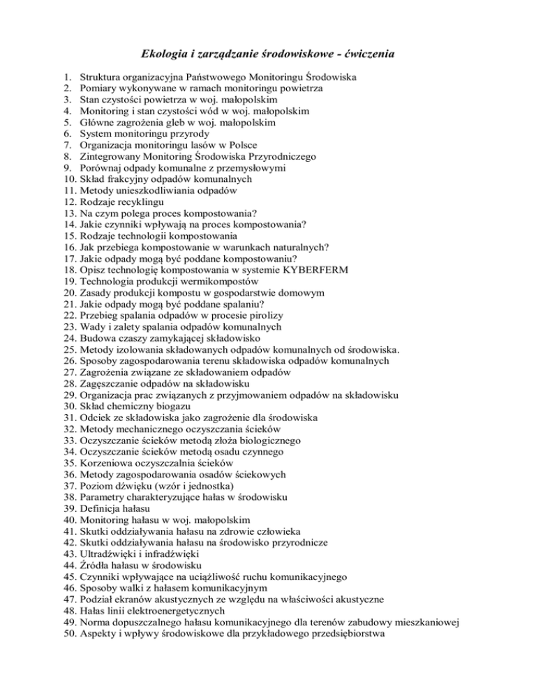 Ekologia i zarządzanie środowiskowe - ćwiczenia 1. Struktura organizacyjna Państwowego Monitoringu Środowiska 2. Pomiary wykonywane w ramach monitoringu powietrza 3. Stan czystości powietrza w woj. małopolskim 4. Monitoring i stan czystości wód w woj. małopolskim 5. Główne zagrożenia gleb w woj. małopolskim 6. System monitoringu przyrody 7. Organizacja monitoringu lasów w Polsce 8. Zintegrowany Monitoring Środowiska Przyrodniczego 9. Porównaj odpady komunalne z przemysłowymi 10. Skład frakcyjny odpadów komunalnych 11. Metody unieszkodliwiania odpadów 12. Rodzaje recyklingu 13. Na czym polega proces kompostowania? 14. Jakie czynniki wpływają na proces kompostowania? 15. Rodzaje technologii kompostowania 16. Jak przebiega kompostowanie w warunkach naturalnych? 17. Jakie odpady mogą być poddane kompostowaniu? 18. Opisz technologię kompostowania w systemie KYBERFERM 19. Technologia produkcji wermikompostów 20. Zasady produkcji kompostu w gospodarstwie domowym 21. Jakie odpady mogą być poddane spalaniu? 22. Przebieg spalania odpadów w procesie pirolizy 23. Wady i zalety spalania odpadów komunalnych 24. Budowa czaszy zamykającej składowisko 25. Metody izolowania składowanych odpadów komunalnych od środowiska. 26. Sposoby zagospodarowania terenu składowiska odpadów komunalnych 27. Zagrożenia związane ze składowaniem odpadów 28. Zagęszczanie odpadów na składowisku 29. Organizacja prac związanych z przyjmowaniem odpadów na składowisku 30. Skład chemiczny biogazu 31. Odciek ze składowiska jako zagrożenie dla środowiska 32. Metody mechanicznego oczyszczania ścieków 33. Oczyszczanie ścieków metodą złoża biologicznego 34. Oczyszczanie ścieków metodą osadu czynnego 35. Korzeniowa oczyszczalnia ścieków 36. Metody zagospodarowania osadów ściekowych 37. Poziom dźwięku (wzór i jednostka) 38. Parametry charakteryzujące hałas w środowisku 39. Definicja hałasu 40. Monitoring hałasu w woj. małopolskim 41. Skutki oddziaływania hałasu na zdrowie człowieka 42. Skutki oddziaływania hałasu na środowisko przyrodnicze 43. Ultradźwięki i infradźwięki 44. Źródła hałasu w środowisku 45. Czynniki wpływające na uciążliwość ruchu komunikacyjnego 46. Sposoby walki z hałasem komunikacyjnym 47. Podział ekranów akustycznych ze względu na właściwości akustyczne 48. Hałas linii elektroenergetycznych 49. Norma dopuszczalnego hałasu komunikacyjnego dla terenów zabudowy mieszkaniowej 50. Aspekty i wpływy środowiskowe dla przykładowego przedsiębiorstwa