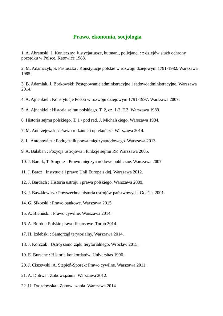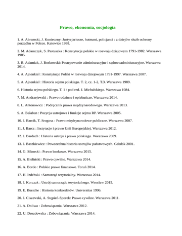 Prawo, ekonomia, socjologia 1. A. Abramski, J. Konieczny: Justycjariusze, hutmani, policjanci : z dziejów służb ochrony porządku w Polsce. Katowice 1988. 2. M. Adamczyk, S. Pastuszka : Konstytucje polskie w rozwoju dziejowym 1791-1982. Warszawa 1985. 3. B. Adamiak, J. Borkowski: Postępowanie administracyjne i sądowoadministracyjne. Warszawa 2014. 4. A. Ajnenkiel : Konstytucje Polski w rozwoju dziejowym 1791-1997. Warszawa 2007. 5. A. Ajnenkiel : Historia sejmu polskiego. T. 2, cz. 1-2, T.3. Warszawa 1989. 6. Historia sejmu polskiego. T. 1 / pod red. J. Michalskiego. Warszawa 1984. 7. M. Andrzejewski : Prawo rodzinne i opiekuńcze. Warszawa 2014. 8. L. Antonowicz : Podręcznik prawa międzynarodowego. Warszawa 2013. 9. A. Bałaban : Pozycja ustrojowa i funkcje sejmu RP. Warszawa 2005. 10. J. Barcik, T. Srogosz : Prawo międzynarodowe publiczne. Warszawa 2007. 11. J. Barcz : Instytucje i prawo Unii Europejskiej. Warszawa 2012. 12. J. Bardach : Historia ustroju i prawa polskiego. Warszawa 2009. 13. J. Baszkiewicz : Powszechna historia ustrojów państwowych. Gdańsk 2001. 14. G. Sikorski : Prawo bankowe. Warszawa 2015. 15. A. Bieliński : Prawo cywilne. Warszawa 2014. 16. A. Bordo : Polskie prawo finansowe. Toruń 2014. 17. H. Izdebski : Samorząd terytorialny. Warszawa 2014. 18. J. Korczak : Ustrój samorządu terytorialnego. Wrocław 2015. 19. E. Bursche : Historia konkordatów. Universitas 1996. 20. J. Ciszewski, A. Stępień-Sporek: Prawo cywilne. Warszawa 2011. 21. A. Doliwa : Zobowiązania. Warszawa 2012. 22. U. Drozdowska : Zobowiązania. Warszawa 2014. 23. K. Kuźniak, M. Marcinko : Organizacje międzynarodowe. Warszawa 2013. 24. J. Lipowicz, R. Mędrzycki, M. Szmigiero : Prawo administracyjne. Warszawa 2015. 25. Prawo administracyjne / Z. Cieślak i in. Warszawa 2013. 26. L. Dubel : Historia doktryn politycznych i prawnych do schyłku XX wieku. Warszawa 2012. 27. M. Muszyński : Unia Europejska. Warszawa 2012. 28. J. Ortega y Gaset : Bunt mas i inne pisma socjologiczne. Warszawa 1982. 29. J. Szacki : Historia myśli socjologicznej. Warszawa 2003. 30. P. Sztompka : Socjologia. Kraków 2012. 31. M. Sczaniecki : Powszechna historia państwa. 32. T. Bojarski : Polskie prawo wykroczeń. Warszawa 2012. 33. S. Waltoś : Proces karny. Warszawa 2013. 34. F. Skowrońska-Bocian : Prawo spadkowe. Warszawa 2014. 35. M. Królikowski : Prawo karne. Warszawa 2015. 36. B. Hołyst : Kryminalistyka. Warszawa 2007. 37. B. Hołyst : Kryminologia. Warszawa 2007. 38. M. Kuryłowicz : Rzymskie prawo prywatne. Warszawa 2013. 39. M. Iwanicz-Drozdowska : Bankowość. Warszawa 2013. 40. D. Begg : Makroekonomia. Warszawa 2007. 41. D. Begg : Mikroekonomia. Warszawa 2007. 42. Finanse / pod red. nauk. Janusza Ostaszewskiego. Warszawa 2010. 43. W. Dajczak : Prawo rzymskie. Warszawa 2014. 44. B. Kuźniak : Organizacje międzynarodowe. Warszawa 2013. 45. P. Cichoń : Historia administracji. Warszawa 2010. 46. R. Giuliani : Przywództwo. Warszawa 2003. 47. J. Kaczyński : Czas na zmiany. 48. I. Ihnatowicz i in. : Społeczeństwo polskie od X do XX w. 49. B. Wojciszke : Pedagogika społeczna. 50. Repetytorium maturalne WOS / red. K. Sikorski. Z serii: ABC Maturzysty. 51. D. Kenrick i in. : Psychologia społeczna. 52. S. Nowak : Metodologia badań społecznych. 53. Z. Kawęczyńska -Butrym : Migracje. 54. K. Thiele-Dohrmann : Psychologia plotki. 55. H. Kaelble : Społeczna historia Europy. 56. E. R. Babbie : Podstawy badań społecznych. 57. E. Nowicka : Świat człowieka – świat kultury. 58. K. Boo : Zawsze piękne. Językoznawstwo i teoria literatury 1. W. Doroszewski : Gramatyka opisowa języka polskiego. 2. W. Doroszewski : O kulturę słowa. 3. M. Głowiński : Poetyka i okolice. 4. M. Głowiński : Zarys teorii literatury. 5. Groteska / pod red. M. Głowińskiego. 6. Ironia / pod red. M. Głowińskiego. 7. L. Koj : Semiotyka dziś i wczoraj. 8. A. Wierzbicka : Kultura języka polskiego. 9. S. Jodłowski : Zasady pisowni polskiej i interpunkcji. Wrocław 1997. 10. S. Jodłowski : Podstawy polskiej składni. 11. Z. Klemensiewicz : Prawidła poprawnej wymowy polskiej. 12. Z. Klemensiewicz: Historia języka polskiego. 13. Z. Klemensiewicz : Składnia, stylistyka, pedagogika językowa. 14. Z. Klemensiewicz : Podstawowe wiadomości z gramatyki języka polskiego. 15. Z. Klemensiewicz : Gramatyka historyczna języka polskiego. 16. W. Kuraszkiewicz : Gramatyka historyczna języka polskiego. 17. W. Kuraszkiewicz : Pochodzenie polskiego języka literackiego. 18. Chrestomatia staropolska : teksty do roku 1543. Wrocław 2004. 19. H. Markiewicz : Zabawy literackie dawne i nowe. 20. H. Markiewicz : Z teorii literatury i badań literackich. 21. H. Markiewicz : Polskie teorie powieści: od początków do schyłku XX wieku. 22. H. Markiewicz : Główne problemy wiedzy o literaturze. 23. H. Markiewicz : Z dziejów polskiej wiedzy o literaturze. 24. M. R. Mayenowa : Poetyka teoretyczna. 25. M. R. Mayenowa: Tekst, język, poetyka. 26. M. Mikuta : Kultura żywego słowa. 27. J. Strutyński : Elementy gramatyki historycznej języka polskiego. 28. J. Strutyński : Gramatyka polska. 29. J. Antas : O kłamstwie i kłamaniu. 30. J. Culler : Teoria literatury. 31. J. Miodek : ABC polszczyzny. 32. J. Miodek: Rozmyślajcie nad mową! 33. J. Miodek: Ojczyzna polszczyzna. 34. J. Miodek : Rzecz o języku. 35. J. Heinz : Dzieje językoznawstwa w zarysie. 36. T. Adorno : Sztuka i sztuki. 37. T. Adorno : Osobowość autorytarna. 38. Arystoteles : Poetyka. 39. C. Stuart : Sztuka przemawiania i prezentacji. 40. J. Bralczyk : 444 zdania polskie. 41. J. Bralczyk : Polak potrafi. 42. J. Bralczyk: Świat przez słowa. 43. J. Bralczyk : Mówi się. 44. J. Bralczyk : O języku propagandy i polityki. 45. J. Bralczyk : Mój język prywatny. 46. J. Bralczyk : Język na sprzedaż. 47. O. Perlin : Język hiszpański dla początkujących. 48. C. Carpenter : Język francuski dla początkujących. 49. V. Bowles : Język włoski dla początkujących. 50. R