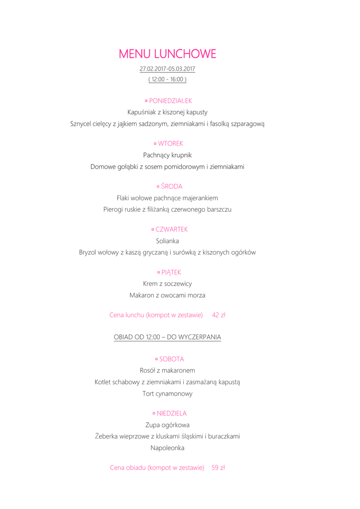 MENU LUNCHOWE 27.02.2017-05.03.2017 ( 12:00 - 16:00 ) ▫PONIEDZIAŁEK Kapuśniak z kiszonej kapusty Sznycel cielęcy z jajkiem sadzonym, ziemniakami i fasolką szparagową ▫WTOREK Pachnący krupnik Domowe gołąbki z sosem pomidorowym i ziemniakami ▫ŚRODA Flaki wołowe pachnące majerankiem Pierogi ruskie z filiżanką czerwonego barszczu ▫CZWARTEK Solianka Bryzol wołowy z kaszą gryczaną i surówką z kiszonych ogórków ▫PIĄTEK Krem z soczewicy Makaron z owocami morza Cena lunchu (kompot w zestawie) 42 zł OBIAD OD 12:00 – DO WYCZERPANIA ▫SOBOTA Rosół z makaronem Kotlet schabowy z ziemniakami i zasmażaną kapustą Tort cynamonowy ▫NIEDZIELA Zupa ogórkowa Żeberka wieprzowe z kluskami śląskimi i buraczkami Napoleonka Cena obiadu (kompot w zestawie) 59 zł