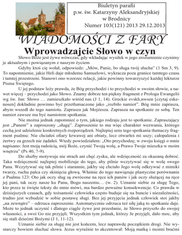 Biuletyn parafii p.w. św. Katarzyny Aleksandryjskiej w Brodnicy Numer 103(121) 2013 29.12.2013 WIADOMOŚCI Z FARY Wprowadzajcie Słowo w czyn Słowo Boże jest żywe wówczas, gdy wkładając wysiłek w jego zrozumienie czynimy je aktualnym i powiązanym z naszym życiem Gdyby ktoś cię wołał, odpowiedz: „Mów, Panie, bo sługa twój słucha” (1 Sm 3, 9). To napomnienie, jakie Heli daje młodemu Samuelowi, wykracza poza granice tamtego czasu i tamtej przestrzeni. Stanowi ono wzorzec relacji, jakie powinny towarzyszyć każdej lekturze Pisma Świętego. U jej podstaw leży prawda, że Bóg przychodzi i to przychodzi w swoim słowie, a nawet więcej – przychodzi jako Słowo. Znamy dobrze ten piękny fragment z Prologu Ewangelii wg św. Jan: Słowo … zamieszkało wśród nas (J 1, 14). Greckie evskh,nwsen [czytaj eskenosen] dokładnie powinno być przetłumaczone jako „rozbiło namiot”. Bóg mnie zaprasza, abym wszedł do tego namiotu. Zaprasza jak Mojżesza. Zaprasza na spotkanie ze sobą. Ten namiot zawsze ma być namiotem spotkania. Nie można jednak zapomnieć o tym, jakiego rodzaju jest to spotkanie. Zapraszający jest „Panem” a zaproszony „sługą”. Zaproszenie to ma więc charakter wezwania, którego cechą jest udzielenie konkretnych rozporządzeń. Najlepiej sens tego spotkania tłumaczy fragment psalmu: Nie chciałeś ofiary krwawej ani obiaty, lecz otwarłeś mi uszy; całopalenia i żertwy za grzech nie żądałeś. Wtedy powiedziałem: „Oto przychodzę; w zwoju księgi o mnie napisano: Jest moją radością, mój Boże, czynić Twoją wolę, a Prawo Twoje mieszka w moim wnętrzu” (Ps 40, 7-9). Do służby motywuje nie strach ani chęć zysku, ale wdzięczność za okazaną dobroć. Taka wdzięczność najlepiej mobilizuje do tego, aby pilnie wczytywać się w wolę swego Pana. Wczytywać się tak pilnie i starannie, jakby się chciało Jego wolę odkrywać z mimiki twarzy, ruchu palca czy skinięcia głową. Właśnie do tego nawiązuje plastyczne porównanie z Psalmu 123: Oto jak oczy sług są zwrócone na ręce ich panów i jak oczy służącej na ręce jej pani, tak oczy nasze ku Panu, Bogu naszemu… (w. 2). Uznanie siebie za sługę Tego, kto przez te święte teksty do mnie mówi, ma bardzo poważne konsekwencje. Co prawda w dzisiejszych czasach, gdy tożsamość człowieka często buduje się na buncie i niezależności, trudno jest wzbudzić w sobie postawę sługi. Bez jej przyjęcia jednak człowiek stoi jakby „na zewnątrz” – odrzuca zaproszenie. Automatycznie odrzuca też siłę jaką to spotkanie daje. Może to jednak uczynić i dlatego ciągle żywe jest przesłanie, że Słowo przyszło do swojej własności, a swoi Go nie przyjęli. Wszystkim tym jednak, którzy Je przyjęli, dało moc, aby się stali dziećmi Bożymi (J 1, 11-12). Uznanie siebie za sługę nie jest końcem, lecz naprawdę początkiem drogi. Nie wystarczy bowiem słuchać słowa. Jezus wyraźnie to akcentował: Moją matką i moimi braćmi są ci, którzy słuchają słowa Bożego i wypełniają je (Łk 8, 21), każdego więc, kto tych słów moich słucha i wypełnia je, można porównać z człowiekiem roztropnym, który dom swój zbudował na skale (…) Każdego zaś, kto tych słów moich słucha, a nie wypełnia ich, można porównać z człowiekiem nierozsądnym, który dom swój zbudował na piasku (Mt 7, 24.26) i wreszcie Nie każdy, który Mi mówi: „Panie, Panie!”, wejdzie do królestwa niebieskiego, lecz ten, kto spełnia wolę mojego Ojca, który jest w niebie (Mt 7, 21). Słuchanie słowa jest tylko drogą, wprowadzanie go w życie – celem. Często spotykamy się z zachętami, aby Pismo Święte czytać całymi rozdziałami. Znane są różnego rodzaju tabele, dzięki którym możemy całą Biblię przeczytać w przeciągu roku. Czy w perspektywie powyżej cytowanych słów Jezusa ma to sens? Ma! Pod warunkiem, że czytamy nie po to, aby zaspakajać swoją ciekawość, czyli aby „wiedzieć”, lecz czynimy to, aby „rozumieć” i przez to zrozumienie całości odkrywać wymowę poszczególnych fragmentów. Jezus mówi przecież do saduceuszów: Czyż nie dlatego jesteście w błędzie, że nie rozumiecie Pisma ani mocy Bożej? (Mk 12,24). Gdy ktoś czytając Biblię ogranicza się do tego, aby „wiedzieć”, tak naprawdę redukuje ją do zamkniętego, więcej nawet, martwego dzieła. Można zachwycać się z filologicznego punktu widzenia poszczególnymi metaforami, przypowieściami, alegoriami, opowiadaniami znajdującymi się w Biblii nawet wówczas, gdy jest się niewierzącym. Podziw ten przypomina jednak zachwyt kogoś, komu na zajęciach w prosektorium udało się wypreparować kawałek tkanki i odkryć jej fenomenalną budowę. Słowo Boże jest żywe wówczas, gdy wkładając wysiłek w jego zrozumienie czynimy je aktualnym i powiązanym z naszym życiem. Czytając więc nawet większe biblijne passusy nie możemy zapominać, że słowa te stanowią list, jaki Ten, który JEST wysyła aktualnie do tych, których kocha. Pamiętając o tym, może zdziwimy się, że samo czytanie będzie nas zmieniało – bo przecież, kto z kim przestaje… Celem listu, jaki Ojciec wysyła do nas jest to, abyśmy stali się do Niego podobni w doczesności – Bądźcie wy doskonali, jak doskonały jest Ojciec wasz niebieski (Mt 5, 48), Bądźcie miłosierni, jak Ojciec wasz jest miłosierny (Łk 6, 36), jak również w wieczności – Umiłowani, obecnie jesteśmy dziećmi Bożymi, ale jeszcze się nie ujawniło, czym będziemy. Wiemy, że gdy się objawi, będziemy do Niego podobni, bo ujrzymy Go takim, jakim jest (1 J 3, 2). Do tego celu nie dojdziemy jednak, gdy kontakt ze Słowem Bożym będzie bardzo „powierzchowny”. Poznając naszą ludzką kondycję duchową, odkrywamy fakt, że jesteśmy słabi i chorzy, więcej nawet, panuje w nas bardzo wiele letalnych dolegliwości. Bóg wysyła lekarstwo do tych, których kocha, i Jego Słowo jes