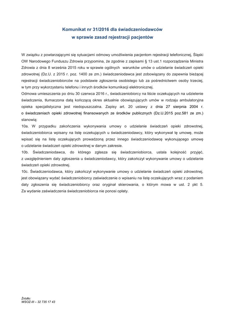 Komunikat nr 31/2016 dla świadczeniodawców w sprawie zasad rejestracji pacjentów W związku z powtarzającymi się sytuacjami odmowy umożliwienia pacjentom rejestracji telefonicznej, Śląski OW Narodowego Funduszu Zdrowia przypomina, że zgodnie z zapisami § 13 ust.1 rozporządzenia Ministra Zdrowia z dnia 8 września 2015 roku w sprawie ogólnych warunków umów o udzielanie świadczeń opieki zdrowotnej (Dz.U. z 2015 r. poz. 1400 ze zm.) świadczeniodawca jest zobowiązany do zapewnia bieżącej rejestracji świadczeniobiorców na podstawie zgłoszenia osobistego lub za pośrednictwem osoby trzeciej, w tym przy wykorzystaniu telefonu i innych środków komunikacji elektronicznej. Odmowa umieszczenia po dniu 30 czerwca 2016 r., świadczeniobiorcy na liście oczekujących na udzielenie świadczenia, tłumaczona datą kończącą okres aktualnie obowiązujących umów w rodzaju ambulatoryjna opieka specjalistyczna jest niedopuszczalna. Zapisy art. 20 ustawy z dnia 27 sierpnia 2004 r. o świadczeniach opieki zdrowotnej finansowanych ze środków publicznych (Dz.U.2015 poz.581 ze zm.) stanowią: 10a. W przypadku zakończenia wykonywania umowy o udzielanie świadczeń opieki zdrowotnej, świadczeniobiorca wpisany na listę oczekujących u świadczeniodawcy, który wykonywał tę umowę, może wpisać się na listę oczekujących prowadzoną przez innego świadczeniodawcę wykonującego umowę o udzielanie świadczeń opieki zdrowotnej w danym zakresie. 10b. Świadczeniodawca, do którego zgłasza się świadczeniobiorca, ustala kolejność przyjęć, z uwzględnieniem daty zgłoszenia u świadczeniodawcy, który zakończył wykonywanie umowy o udzielanie świadczeń opieki zdrowotnej. 10c. Świadczeniodawca, który zakończył wykonywanie umowy o udzielanie świadczeń opieki zdrowotnej, jest obowiązany wydać świadczeniobiorcy zaświadczenie o wpisaniu na listę oczekujących wraz z podaniem daty zgłoszenia się świadczeniobiorcy oraz oryginał skierowania, o którym mowa w ust. 2 pkt 5. Za wydanie zaświadczenia świadczeniobiorca nie ponosi opłaty. Źródło: WSOZ-III – 32 735 17 43