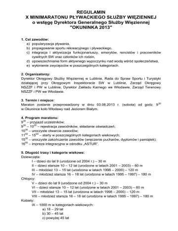 REGULAMIN X MINIMARATONU PŁYWACKIEGO SŁUŻBY WIĘZIENNEJ o wstęgę Dyrektora Generalnego Służby Więziennej "OKUNINKA 2013" 1. Cel zawodów: a) popularyzacja pływania, b) propagowanie sportu rekreacyjnego i pływackiego, c) integracja i aktywizacja funkcjonariuszy, emerytów, rencistów i pracowników cywilnych SW oraz członków ich rodzin, d) upowszechnianie form aktywnego wypoczynku nad wodą wśród społeczeństwa, e) wyłonienie zwycięzców w poszczególnych kategoriach. 2. Organizatorzy: Dyrektor Okręgowy Służby Więziennej w Lublinie, Rada do Spraw Sportu i Turystyki działającej przy Okręgowym Inspektoracie SW w Lublinie, Zarząd Okręgowy NSZZF i PW w Lublinie, Dyrektor Zakładu Karnego we Włodawie, Zarząd Terenowy NSZZF i PW we Włodawie. 3. Termin i miejsce: Maraton zostanie przeprowadzony w dniu 03.08.2013 r. (sobota) od godz. 9 30 w Okunince koło Włodawy nad Jeziorem Białym. 4. Program maratonu: 930 – przyjazd uczestników; 930 – 1030 – rejestracja zawodników, składanie oświadczeń; 1030 – uroczyste otwarcie zawodów; 1100 – 1500 – starty w poszczególnych kategoriach wiekowych; 1530 – uroczyste zakończenie zawodów (wręczenie pucharów, dyplomów i pamiątek); 1600 – impreza integracyjna w ośrodku „ASTUR”. 5. Długość trasy i kategorie wiekowe: Dziewczęta: I – dzieci do lat 9 (urodzone od 2004 r.) – 30 m II – dzieci starsze 10 – 12 lat (urodzone w latach 2001 – 2003) – 60 m III – młodzież 13 – 15 lat (urodzona w latach 1998 – 2000) – 120 m IV – młodzież starsza 16 – 18 lat (urodzona w latach 1995 – 1997) – 180 m Chłopcy: V – dzieci do lat 9 (urodzone od 2004 r.) – 30 m VI – dzieci starsze 10 – 12 lat (urodzone w latach 2001 – 2003) – 60 m VII – młodzież 13 – 15 lat (urodzona w latach 1998 – 2000) – 120 m VIII – młodzież starsza 16 – 18 lat (urodzona w latach 1995 – 1997) – 180 m Kobiety: IX – 1000 m w kategoriach wiekowych: a) 18 – 29 lat b) 30 – 45 lat c) powyżej 45 lat Mężczyźni: X – 1500 m w kategoriach wiekowych: a) 18 – 29 lat b) 30 – 45 lat c) powyżej 45 lat 6. Harmonogram startów: a) start do maratonu grupy I, dystans 30 m, początek godz. 1100, b) start do maratonu grupy II, dystans 60 m, początek godz. 1115, c) start do maratonu grupy III, dystans 120 m, początek godz. 1130, d) start do maratonu grupy IV, dystans 180 m, początek godz. 1145, e) start do maratonu grupy V, dystans 30 m, początek godz. 1200, f) start do maratonu grupy VI, dystans 60 m, początek godz. 1215, g) start do maratonu grupy VII, dystans 120 m, początek godz. 1230, h) start do maratonu grupy VIII, dystans 180 m, początek godz. 12 45, i) start do maratonu grupy IX, dystans 1000 m, początek godz. 1300, j) start do maratonu grupy X, dystans 1500 m, początek godz. 1400. 7. Program techniczny: a) obsługę maratonu pływackiego i utrzymanie bezpieczeństwa zapewniają funkcjonariusze ZK Włodawa, WOPR Chełm oraz płetwonurkowie z klubu nurkowego „Hydrozagadka”, b) organizator zapewnia ubezpieczenie zawodnikom, c) uczestnicy maratonu zobowiązani są: przerwać wyścig na podstawie decyzji lekarza lub sędziego, podpisać własnoręcznie oświadczenie stwierdzające, że startują na własną odpowiedzialność i nie będą rościli żadnych pretensji do organizatorów z tytułu ewentualnego uszczerbku na zdrowiu, podporządkować się decyzjom komisji sędziowskiej lub lekarskiej, przedłożyć przed startem zaświadczenie lekarskie o zdolności do udziału w zawodach, d) uczestnicy, którzy nie ukończyli 18 lat zobowiązani są posiadać pisemną zgodę rodziców na udział w maratonie (druk oświadczenia do pobrania w punkcie organizacyjnym zawodów), e) startujący ma prawo we własnym zakresie pokryć powierzchnię ciała substancją zabezpieczającą przed obniżeniem temperatury ciała w wodzie oraz używać okularów wodoszczelnych. 8. Uczestnictwo: W minimaratonie mogą brać udział funkcjonariusze, emeryci, renciści i pracownicy cywilni Służby Więziennej oraz członkowie ich rodzin (dzieci i rodzice). 9. Zgłoszenia: Zgłoszenia do udziału w maratonie należy kierować w formie elektronicznej na adres e-mail: [email protected] do 5 lipca 2013 r. na załączonym do regulaminu formularzu zgłoszeniowym. Istnieje możliwość zapewnienia noclegu po uzgodnieniu warunków z kierownikiem działu kwatermistrzowskiego kpt. Jackiem Zarczukiem tel. (82) 572 68 23. 10. Zasady finansowania: a) organizatorzy pokrywają koszty związane z organizacją zawodów, b) opłata startowa wynosi 20 zł od osoby dorosłej (zwalnia się z opłaty startowej dzieci i młodzież do lat 18), c) organizator zapewnia uczestnikom gorący posiłek oraz napoje. 11. Postanowienia końcowe: a) wszyscy zawodnicy otrzymają okolicznościowe upominki, b) za rzeczy osobiste uczestników w razie zaginięcia organizatorzy nie ponoszą odpowiedzialności, c) informacji dotyczących maratonu udzielają: por. Krzysztof Jeleński – /082/ 572 68 30, kpt. Jacek Zarczuk – /082/ 572 68 23, d) we wszystkich sprawach nie ujętych niniejszym regulaminem decyduje sędzia główny w porozumieniu z organizatorem, e) organizator zastrzega sobie prawo do dokonania zmian w regulaminie. FORMULARZ ZGŁOSZENIA X MINIMARATON PŁYWACKI SŁUŻBY WIĘZIENNEJ o wstęgę Dyrektora Generalnego Służby Więziennej OKUNINKA nad J. Białym – 3 sierpnia 2013 r. Imię: .................................................................................. Nazwisko: .................................................................................. Data urodzenia: .................................................................................. Nazwa jednostki penitencjarnej: .................................................................................. Nr telefonu kontaktowego: .................................................................................. Adres e-mail: ...................................
