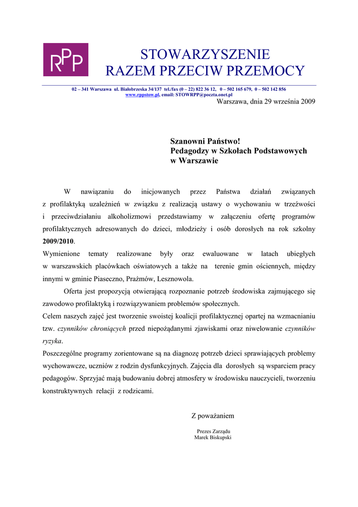 RPP STOWARZYSZENIE RAZEM PRZECIW PRZEMOCY 02 – 341 Warszawa ul. Białobrzeska 34/137 tel./fax (0 – 22) 822 36 12, 0 – 502 165 679, 0 – 502 142 856 www.rppstow.pl, email: [email protected] Warszawa, dnia 29 września 2009 Szanowni Państwo! Pedagodzy w Szkołach Podstawowych w Warszawie W nawiązaniu do inicjowanych przez Państwa działań związanych z profilaktyką uzależnień w związku z realizacją ustawy o wychowaniu w trzeźwości i przeciwdziałaniu alkoholizmowi przedstawiamy w załączeniu ofertę programów profilaktycznych adresowanych do dzieci, młodzieży i osób dorosłych na rok szkolny 2009/2010. Wymienione tematy realizowane były oraz ewaluowane w latach ubiegłych w warszawskich placówkach oświatowych a także na terenie gmin ościennych, między innymi w gminie Piaseczno, Prażmów, Lesznowola. Oferta jest propozycją otwierającą rozpoznanie potrzeb środowiska zajmującego się zawodowo profilaktyką i rozwiązywaniem problemów społecznych. Celem naszych zajęć jest tworzenie swoistej koalicji profilaktycznej opartej na wzmacnianiu tzw. czynników chroniących przed niepożądanymi zjawiskami oraz niwelowanie czynników ryzyka. Poszczególne programy zorientowane są na diagnozę potrzeb dzieci sprawiających problemy wychowawcze, uczniów z rodzin dysfunkcyjnych. Zajęcia dla dorosłych są wsparciem pracy pedagogów. Sprzyjać mają budowaniu dobrej atmosfery w środowisku nauczycieli, tworzeniu konstruktywnych relacji z rodzicami. Z poważaniem Prezes Zarządu Marek Biskupski Osoby realizujące programy: a) Marek Biskupski wykształcenie wyższe zawód pedagog, trener warsztatów psychospołecznych b) Kinga Frąckiewicz wykształcenie wyższe zawód psycholog c) Urszula Kruczkowska wykształcenie wyższe zawód pedagog d) Sylwia Wydra wykształcenie wyższe zawód pedagog e) Kacper Pilczuk wykształcenie wyższe – psycholog f) Karolina Toruńska wykształcenie wyższe, pedagog g) Katarzyna Gałecka wykształcenie wyższe, psycholog h) Anna Krawcewicz wykształcenie wyższe, pedagog i) Joanna Stanczewska wykształcenie wyższe, pedagog j) Elżbieta Krzyżanowska terapeuta uzależnień. k) Krystyna Stando wykształcenie wyższe, psycholog l) Agnieszka Przecławska - Frączek wykształcenie wyższe, psycholog, terapeuta m) Jolanta Gałecka - wykształcenie wyższe, pedagog, trener. n) Aleksandra Szygendowska wykształcenie wyższe zawód psycholog o) Beata Janiczek – Lasota – wykształcenie wyższe, pedagog p) Krzysztof Nowak – policjant, specjalista ds. uzależnień i prewencji kryminalnej Kosztorys zajęć programów dla uczniów (zajęcia profilaktyczne): 52 zł/ godz. dydaktyczną x 2 osoby prowadzące (koszty osobowe) + 30 zł od klasy koszty materiałowe. Kosztorys zajęć programów dla nauczycieli (zajęcia warsztatowe - dwóch prowadzących): 2 x 52 zł/ godz. dydaktyczną x 2 osoby prowadzące (koszty osobowe) + 30 zł od grupy – koszty materiałowe. Wykłady dydaktyczne dla rodziców – 120 zł/ godz. + 30 zł koszty materiałowe od grupy. OFERTA l.p. 1. 2. 3. 4. 5. Charakterystyka uczestników Nazwa programu Czas trwania Koszt programu dla klasy 342 zł Uczniowie klas I – III Bezpieczne zachowania w różnego 3 godziny szkoły podstawowej rodzaju sytuacjach. Jakie czynniki powodują, że dziecku może stać się krzywda? Jakie doświadczenia mają z tym dzieci? Co jest groźniejsze: obcy pies, czy domowe urządzenie elektryczne? A może pozostawione przez tatę chemikalia? Uczniowie klas I – III Jak nie stać się ofiarą przestępstwa w 3 godziny 342 zł szkoły podstawowej szkole, na ulicy, w domu. Kim jest obcy? Kogo powinniście się bać, do kogo można się zwrócić o pomoc? Uczniowie klas I – III Sytuacje zagrażające bezpieczeństwu 3 godziny 342 zł szkoły podstawowej dziecka – zajęcia podsumowujące Zobaczmy, co zapamiętaliście po dwóch zajęciach – przećwiczmy to w scenkach, zróbmy na koniec razem plakat. Uczniowie klas II – V Zajęcia integracyjne dla klas II – V szkoły podstawowej Zajęcia integrujące klasę z wychowawcą, podstawy dobrej komunikacji, czyszczenie konfliktów. Klasy IV – VI szkoły Nasza klasa w kryzysie - zajęcia podstawowej poprawiające relacje rówieśnicze. 6 godzin 654 zł 6 godzin 654 zł Klasy III – VI szkoły Sposoby radzenia sobie z konfliktem. 6 godzin Jak rozwiązywać konflikty bez użycia podstawowej przemocy? Procedura wchodzenia po drabinie może nam w tym pomóc. Uruchomimy uczniowskie doświadczenie do zwycięskiego przechodzenia przez konflikt, tak aby nie było stron pokonanych. 654 zł Kiedy jest tak źle, że nikt z nikim nie chce już rozmawiać, a uczniowie przychodzą do szkoły bez przyjemności – w grupie klasowej jest kryzys. Po nazwaniu sytuacji możemy się nią zająć. Tak, aby nie było pokonanych. 6. 7. 8. 9. Klasy IV – VI szkoły Rzecz o tolerancji 3 godziny podstawowej Stereotypy dotyczące narodowości, rasy, wyznania, przekonań. Można za to zostać pobitym, można też porozmawiać w klasie, gdzie „nie lubią czarnych, żydów i pedałów”. Klasy IV – VI szkoły Alkohol jako czynnik sprawczy w 4 godziny podstawowej patologii zachowań młodzieży. Szkody alkoholowe – kto i kiedy je ponosi? Jak szybko uzależnia się młody człowiek? Czy zdąży się uzależnić, zanim zniszczy przyszłość sobie, lub komuś? Co to znaczy mądre picie? Czy alkohol pomaga się bawić? Mity i rzeczywistość. 342 zł 4 godziny 446 zł Klasy IV – VI szkoły podstawowej Jak nie stać się ofiarą przemocy i przestępstw? O unikaniu sytuacji, w których niebezpieczeństwa można było uniknąć. Uczestnicy korzystają z własnych doświadczeń bycia ofiarą, analizują i ćwiczą sytuacje, aby następnym razem wyjść cało z opresji. 10. Klasy IV – VI szkoły Zajęcia z komunikacji 8 godzin podstawowej interpersonalnej w klasach IV - VI Skrócony trening asertywności dla 10 – 13 latków. Łagodnie, stanowczo, zdecydowanie. Dbamy o