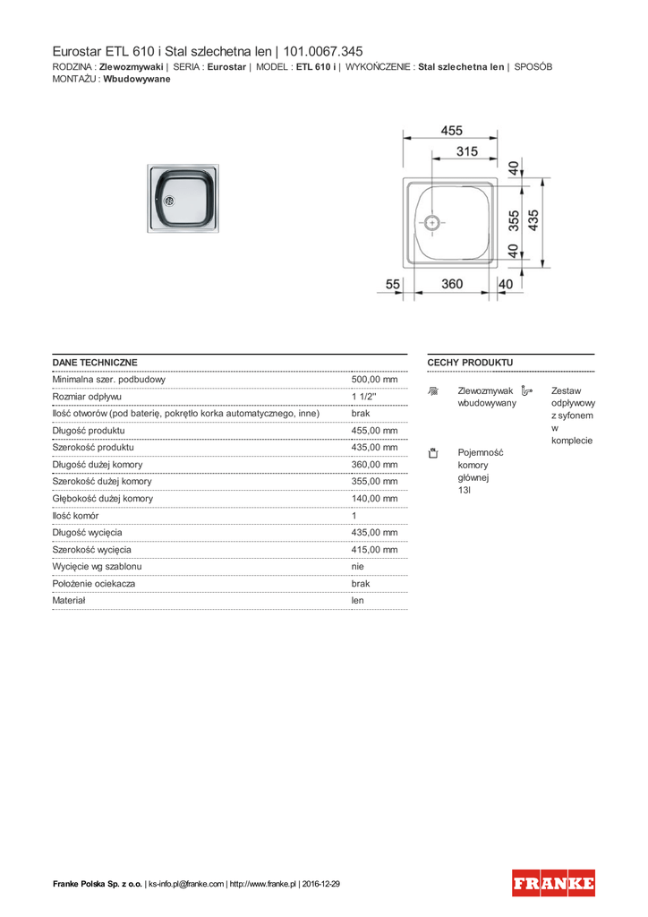 Eurostar ETL 610 i Stal szlechetna len | 101.0067.345 RODZINA : Zlewozmywaki | SERIA : Eurostar | MODEL : ETL 610 i | WYKOŃCZENIE : Stal szlechetna len | SPOSÓB MONTAŻU : Wbudowywane DANE TECHNICZNE CECHY PRODUKTU Minimalna szer. podbudowy 500,00 mm Rozmiar odpływu 1 1/2'' Ilość otworów (pod baterię, pokrętło korka automatycznego, inne) brak Długość produktu 455,00 mm Szerokość produktu 435,00 mm Długość dużej komory 360,00 mm Szerokość dużej komory 355,00 mm Głębokość dużej komory 140,00 mm Ilość komór 1 Długość wycięcia 435,00 mm Szerokość wycięcia 415,00 mm Wycięcie wg szablonu nie Położenie ociekacza brak Materiał len Franke Polska Sp. z o.o. | [email protected] | http://www.franke.pl | 2016-12-29 Zlewozmywak wbudowywany Pojemność komory głównej 13l Zestaw odpływowy z syfonem w komplecie Eurostar ETL 610 i Stal szlechetna len | 101.0067.345 RODZINA : Zlewozmywaki | SERIA : Eurostar | MODEL : ETL 610 i | WYKOŃCZENIE : Stal szlechetna len | SPOSÓB MONTAŻU : Wbudowywane POLECANE PRODUKTY 115.0029.709 115.0029.707 Franke Polska Sp. z o.o. | [email protected] | http://www.franke.pl | 2016-12-29