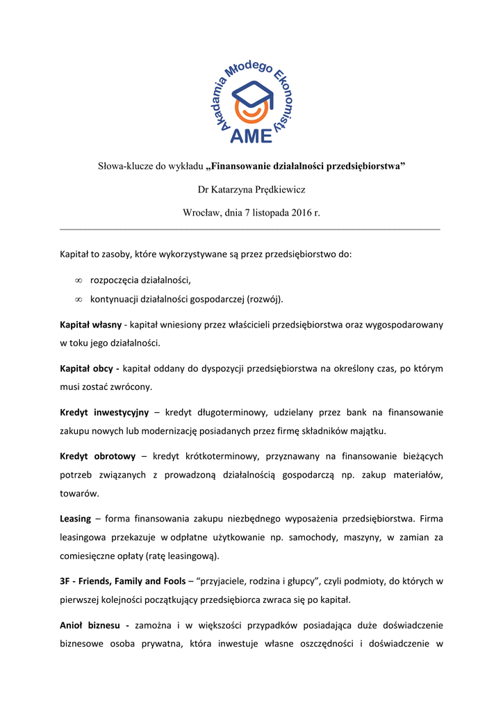 Słowa-klucze do wykładu „Finansowanie działalności przedsiębiorstwa” Dr Katarzyna Prędkiewicz Wrocław, dnia 7 listopada 2016 r. ___________________________________________________________________________ Kapitał to zasoby, które wykorzystywane są przez przedsiębiorstwo do: • rozpoczęcia działalności, • kontynuacji działalności gospodarczej (rozwój). Kapitał własny - kapitał wniesiony przez właścicieli przedsiębiorstwa oraz wygospodarowany w toku jego działalności. Kapitał obcy - kapitał oddany do dyspozycji przedsiębiorstwa na określony czas, po którym musi zostać zwrócony. Kredyt inwestycyjny – kredyt długoterminowy, udzielany przez bank na finansowanie zakupu nowych lub modernizację posiadanych przez firmę składników majątku. Kredyt obrotowy – kredyt krótkoterminowy, przyznawany na finansowanie bieżących potrzeb związanych z prowadzoną działalnością gospodarczą np. zakup materiałów, towarów. Leasing – forma finansowania zakupu niezbędnego wyposażenia przedsiębiorstwa. Firma leasingowa przekazuje w odpłatne użytkowanie np. samochody, maszyny, w zamian za comiesięczne opłaty (ratę leasingową). 3F - Friends, Family and Fools – “przyjaciele, rodzina i głupcy”, czyli podmioty, do których w pierwszej kolejności początkujący przedsiębiorca zwraca się po kapitał. Anioł biznesu - zamożna i w większości przypadków posiadająca duże doświadczenie biznesowe osoba prywatna, która inwestuje własne oszczędności i doświadczenie w przedsięwzięcia będące w bardzo wczesnych fazach rozwoju w zamian za udziały w tych przedsięwzięciach. Fundusz venture capital – fundusz inwestycyjny, który gromadzi środki od wielu inwestorów, a następnie inwestuje je w przedsiębiorstwa o wysokim potencjale rozwoju, które jednocześnie obarczone są znacznym ryzykiem. Dotacja - Bezzwrotna pomoc finansowa udzielona przedsiębiorstwu. Dotacje mogą być udzielane dla przedsiębiorstw rozpoczynających działalność lub na konkretny projekt (np. wprowadzenie nowego, nieznanego lub ulepszonego produktu/usługi). Model biznesowy – najprościej „na czym firma zarabia”. Model biznesowy odpowiada między innymi na pytania: (1) do kogo kierowany jest produkt, (2) jakie korzyści osiągną klienci korzystając z produktu, (3) w jaki sposób dostarczymy produkt klientowi, (4) w jaki sposób kształtować cenę produktu. Określenie przejrzystego modelu biznesowego jest niezbędnym krokiem przed próbą pozyskania inwestora. Badanie spółki (ang. due diligence) Dogłębna analiza i ocena wszystkich obszarów funkcjonowania spółki, która ma się stać przedmiotem inwestycji funduszu venture capital. Start-up to przedsiębiorstwo w początkowym etapie rozwoju, które poszukuje rentownego, skalowalnego i powtarzalnego modelu biznesowego. Jedną z metod finansowania projektów rozpoczynanych jako start-up jest korzystanie z funduszy venture capital lub z pomocy aniołów biznesu. Faza zasiewu (ang. seed stage) – etap przed założeniem przedsiębiorstwa, kiedy istnieją potencjalnie zyskowne pomysły, które wymagają oceny, dalszego rozwoju.