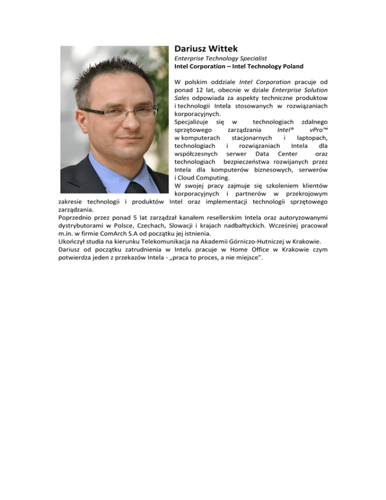 Dariusz Wittek Enterprise Technology Specialist Intel Corporation – Intel Technology Poland W polskim oddziale Intel Corporation pracuje od ponad 12 lat, obecnie w dziale Enterprise Solution Sales odpowiada za aspekty techniczne produktow i technologii Intela stosowanych w rozwiązaniach korporacyjnych. Specjalizuje się w technologiach zdalnego sprzętowego zarządzania Intel® vPro™ w komputerach stacjonarnych i laptopach, technologiach i rozwiązaniach Intela dla współczesnych serwer Data Center oraz technologiach bezpieczeństwa rozwijanych przez Intela dla komputerów biznesowych, serwerów i Cloud Computing. W swojej pracy zajmuje się szkoleniem klientów korporacyjnych i partnerów w przekrojowym zakresie technologii i produktów Intel oraz implementacji technologii sprzętowego zarządzania. Poprzednio przez ponad 5 lat zarządzał kanałem resellerskim Intela oraz autoryzowanymi dystrybutorami w Polsce, Czechach, Slowacji i krajach nadbałtyckich. Wcześniej pracował m.in. w firmie ComArch S.A od początku jej istnienia. Ukończył studia na kierunku Telekomunikacja na Akademii Górniczo-Hutniczej w Krakowie. Dariusz od początku zatrudnienia w Intelu pracuje w Home Office w Krakowie czym potwierdza jeden z przekazów Intela - „praca to proces, a nie miejsce”.