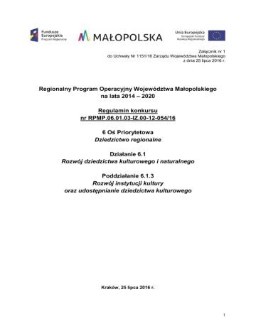 Załącznik nr 1 do Uchwały Nr 1151/16 Zarządu Województwa Małopolskiego z dnia 25 lipca 2016 r. Regionalny Program Operacyjny Województwa Małopolskiego na lata 2014 – 2020 Regulamin konkursu nr RPMP.06.01.03-IZ.00-12-054/16 6 Oś Priorytetowa Dziedzictwo regionalne Działanie 6.1 Rozwój dziedzictwa kulturowego i naturalnego Poddziałanie 6.1.3 Rozwój instytucji kultury oraz udostępnianie dziedzictwa kulturowego Kraków, 25 lipca 2016 r. 1 Spis treści ROZDZIAŁ 1 POSTANOWIENIA OGÓLNE ........................................................................................... 3 1.1 Zakres obowiązywania Regulaminu ........................................................................................ 3 1.2 Wykaz skrótów i definicji .......................................................................................................... 3 1.3 Terminy i doręczenia ................................................................................................................ 7 1.4 Instytucja Organizująca Konkurs oraz forma i sposób udzielania informacji w kwestiach dotyczących konkursu .............................................................................................................. 8 1.5 System e-RPO ......................................................................................................................... 9 1.6 Wymagania dotyczące wniosku o dofinansowanie projektu .................................................. 10 ROZDZIAŁ 2 KONKURS ...................................................................................................................... 11 2.1 Termin naboru wniosków o dofinansowanie projektów ......................................................... 11 2.2 Przedmiot konkursu ............................................................................................................... 12 2.3 Warunki uczestnictwa ............................................................................................................ 13 2.4 Dofinansowanie projektów ..................................................................................................... 14 2.3 Kwalifikowalność wydatków ................................................................................................... 16 2.6 Pomoc de minimis i pomoc publiczna .................................................................................... 17 2.7 Zgodność z wytycznymi specyficznymi .................................................................................. 19 ROZDZIAŁ 3 PROCEDURA WYBORU PROJEKTÓW ....................................................................... 19 3.1 Ocena wniosku o dofinansowanie projektu............................................................................ 19 3.2 Informacje kierowane do Wnioskodawcy ............................................................................... 22 3.3 Podanie do publicznej wiadomości wyników konkursu .......................................................... 23 ROZDZIAŁ 4 PROCEDURA ODWOŁAWCZA ..................................................................................... 23 ROZDZIAŁ 5 REALIZACJA PROJEKTU ............................................................................................. 23 5.1 Umowa / Uchwała .................................................................................................................. 23 5.2 Działania informacyjne i promocyjne ..................................................................................... 24 ROZDZIAŁ 6 POSTANOWIENIA KOŃCOWE ..................................................................................... 24 ROZDZIAŁ 7 ZAŁĄCZNIKI DO REGULAMINU ................................................................................... 25 Załącznik nr 1 Kryteria oceny. ....................................................................................................... 25 Załącznik nr 2 Wzór wniosku o dofinansowanie projektu. ............................................................ 25 Załącznik nr 3 Instrukcja wypełniania wniosku o dofinansowanie projektu. ................................. 25 Załącznik nr 4a Szczegółowe wymogi w zakresie przygotowania analizy finansowej i ekonomicznej dla projektów ubiegających się o dofinansowanie w ramach Regionalnego Programu Operacyjnego Województwa Małopolskiego na lata 2014 – 2020 (RPO WM). .... 25 Załącznik nr 4b Szczegółowe wymogi w zakresie przygotowania analizy finansowej dla projektów nieinwestycyjnych ubiegających się o dofinansowanie w ramach Regionalnego Programu Operacyjnego Województwa Małopolskiego na lata 2014 – 2020 (RPO WM)...................... 25 Załącznik nr 5 Regulamin KOP. .................................................................................................... 25 Załącznik nr 6a Umowa o dofinansowanie Projektu. ...................................................................... 25 Załącznik nr 6b Uchwała ZWM w sprawie podjęcia decyzji o dofinansowaniu Projektu, dla którego Beneficjentem jest Województwo Małopolskie wraz załącznikiem pn. Zasady realizacji projektów dla których Beneficjentem jest Województwo Małopolskie w ramach Regionalnego Programu Operacyjnego Województwa Małopolskiego na lata 2014 – 2020. ...................... 25 Załącznik nr 7 Procedura odwoławcza wraz ze wzorem protestu. ............................................... 25 Załącznik nr 8 Definicje wskaźników dla konkursu. ...................................................................... 25 2 ROZDZIAŁ 1 POSTANOWIENIA OGÓLNE 1.1 Zakres obowiązywania Regulaminu §1 1. 2. Regulamin niniejszego konkursu, zwany dalej Regulaminem, określa przedmiot i zasady konkursu, przeprowadzanego w celu przyznania dofinansowania dla projektów, na podstawie złożonych wniosków o dofinansowanie projektów, które realizują 6 Oś priorytetową Dziedzictwo regionalne, działanie 6.1 Rozwój dziedzictwa k