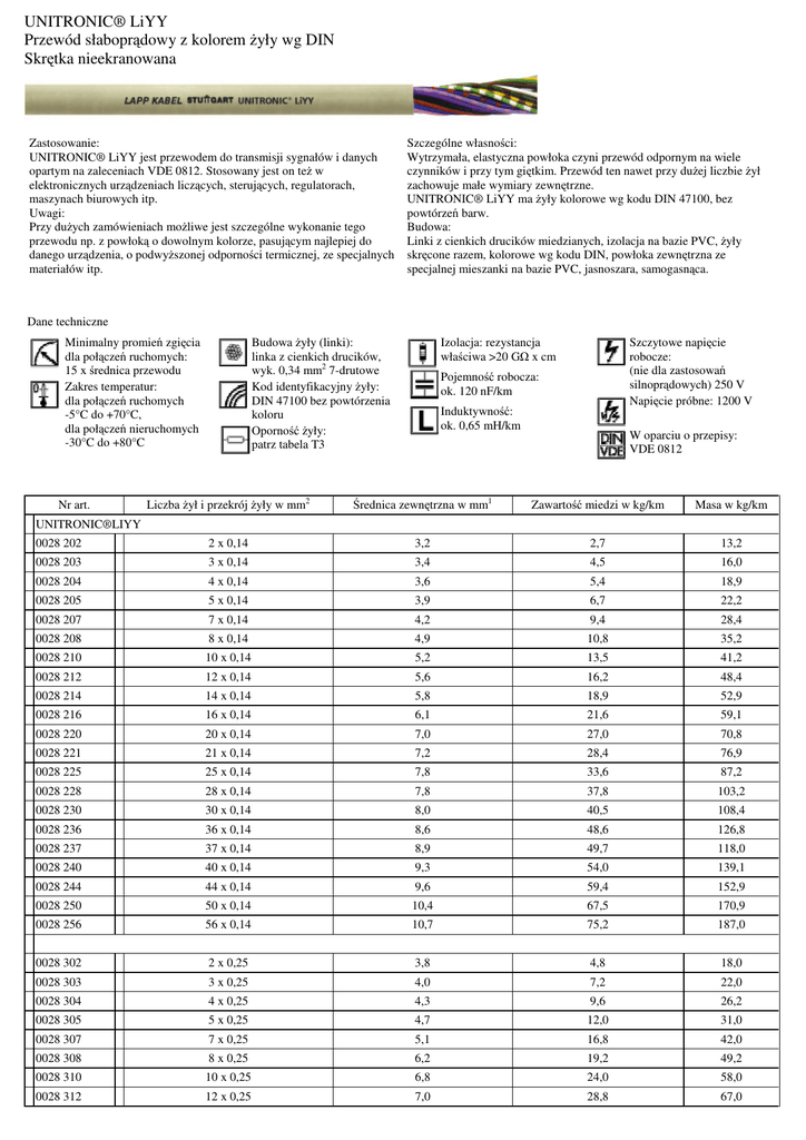 UNITRONIC® LiYY Przewód słaboprądowy z kolorem żyły wg DIN Skrętka nieekranowana Zastosowanie: UNITRONIC® LiYY jest przewodem do transmisji sygnałów i danych opartym na zaleceniach VDE 0812. Stosowany jest on też w elektronicznych urządzeniach liczących, sterujących, regulatorach, maszynach biurowych itp. Uwagi: Przy dużych zamówieniach możliwe jest szczególne wykonanie tego przewodu np. z powłoką o dowolnym kolorze, pasującym najlepiej do danego urządzenia, o podwyższonej odporności termicznej, ze specjalnych materiałów itp. Szczególne własności: Wytrzymała, elastyczna powłoka czyni przewód odpornym na wiele czynników i przy tym giętkim. Przewód ten nawet przy dużej liczbie żył zachowuje małe wymiary zewnętrzne. UNITRONIC® LiYY ma żyły kolorowe wg kodu DIN 47100, bez powtórzeń barw. Budowa: Linki z cienkich drucików miedzianych, izolacja na bazie PVC, żyły skręcone razem, kolorowe wg kodu DIN, powłoka zewnętrzna ze specjalnej mieszanki na bazie PVC, jasnoszara, samogasnąca. Dane techniczne Minimalny promień zgięcia dla połączeń ruchomych: 15 x średnica przewodu Zakres temperatur: dla połączeń ruchomych -5°C do +70°C, dla połączeń nieruchomych -30°C do +80°C Budowa żyły (linki): linka z cienkich drucików, wyk. 0,34 mm2 7-drutowe Kod identyfikacyjny żyły: DIN 47100 bez powtórzenia koloru Oporność żyły: patrz tabela T3 Izolacja: rezystancja właściwa >20 GΩ x cm Szczytowe napięcie robocze: (nie dla zastosowań silnoprądowych) 250 V Napięcie próbne: 1200 V Pojemność robocza: ok. 120 nF/km Induktywność: ok. 0,65 mH/km W oparciu o przepisy: VDE 0812 Liczba żył i przekrój żyły w mm2 Średnica zewnętrzna w mm1 Zawartość miedzi w kg/km Masa w kg/km 0028 202 2 x 0,14 3,2 2,7 13,2 0028 203 3 x 0,14 3,4 4,5 16,0 0028 204 4 x 0,14 3,6 5,4 18,9 0028 205 5 x 0,14 3,9 6,7 22,2 0028 207 7 x 0,14 4,2 9,4 28,4 0028 208 8 x 0,14 4,9 10,8 35,2 0028 210 10 x 0,14 5,2 13,5 41,2 0028 212 12 x 0,14 5,6 16,2 48,4 0028 214 14 x 0,14 5,8 18,9 52,9 0028 216 16 x 0,14 6,1 21,6 59,1 0028 220 20 x 0,14 7,0 27,0 70,8 0028 221 21 x 0,14 7,2 28,4 76,9 0028 225 25 x 0,14 7,8 33,6 87,2 0028 228 28 x 0,14 7,8 37,8 103,2 0028 230 30 x 0,14 8,0 40,5 108,4 0028 236 36 x 0,14 8,6 48,6 126,8 0028 237 37 x 0,14 8,9 49,7 118,0 0028 240 40 x 0,14 9,3 54,0 139,1 0028 244 44 x 0,14 9,6 59,4 152,9 0028 250 50 x 0,14 10,4 67,5 170,9 0028 256 56 x 0,14 10,7 75,2 187,0 0028 302 2 x 0,25 3,8 4,8 18,0 0028 303 3 x 0,25 4,0 7,2 22,0 0028 304 4 x 0,25 4,3 9,6 26,2 0028 305 5 x 0,25 4,7 12,0 31,0 0028 307 7 x 0,25 5,1 16,8 42,0 0028 308 8 x 0,25 6,2 19,2 49,2 0028 310 10 x 0,25 6,8 24,0 58,0 0028 312 12 x 0,25 7,0 28,8 67,0 Nr art. UNITRONIC®LIYY 0028 314 14 x 0,25 7,3 33,6 75,3 0028 316 16 x 0,25 7,7 38,4 84,3 0028 318 18 x 0,25 8,1 43,2 93,0 0028 320 20 x 0,25 8,6 48,0 102,0 0028 325 25 x 0,25 9,6 60,0 134,0 0028 330 30 x 0,25 10,3 72,0 155,0 0028 332 32 x 0,25 10,7 76,8 164,0 0028 336 36 x 0,25 11,1 86,4 182,2 0028 337 37 x 0,25 11,4 88,8 185,0 0028 340 40 x 0,25 12,0 96,1 200,0 0028 350 50 x 0,25 12,9 120,0 257,1 0028 361 61 x 0,25 13,7 146,4 305,2 0028 402 2 x 0,34 4,2 6,6 22,2 0028 403 3 x 0,34 4,4 9,8 31,0 0028 404 4 x 0,34 4,8 13,1 43,2 0028 405 5 x 0,34 5,5 16,3 53,8 0028 407 7 x 0,34 5,9 22,8 62,0 0028 408 8 x 0,34 7,1 26,1 73,1 0028 410 10 x 0,34 7,6 32,6 82,0 0028 412 12 x 0,34 7,8 39,2 102,0 0028 414 14 x 0,34 8,2 45,7 109,0 0028 416 16 x 0,34 8,7 52,0 127,0 0028 420 20 x 0,34 9,6 65,2 159,3 0028 421 21 x 0,34 10,4 69,0 167,0 0028 425 25 x 0,34 11,2 81,6 190,0 0028 430 30 x 0,34 11,6 98,0 226,0 0028 432 32 x 0,34 12,1 104,4 245,0 0028 436 36 x 0,34 12,5 118,0 284,0 0028 440 40 x 0,34 13,5 131,0 317,0 0028 450 50 x 0,34 15,0 163,0 407,0 0028 502 2 x 0,5 4,7 9,6 40,0 0028 503 3 x 0,5 5,0 14,4 47,0 0028 504 4 x 0,5 5,6 19,2 56,0 0028 505 5 x 0,5 6,1 24,0 65,0 0028 507 7 x 0,5 6,9 33,6 82,0 0028 508 8 x 0,5 8,0 38,4 90,0 0028 510 10 x 0,5 8,6 48,0 117,0 0028 512 12 x 0,5 8,9 58,0 133,0 0028 516 16 x 0,5 10,2 77,0 170,0 0028 520 20 x 0,5 11,4 96,0 214,0 0028 525 25 x 0,5 12,3 120,0 265,0 0028 530 30 x 0,5 13,2 144,0 304,0 0028 540 40 x 0,5 15,8 192,0 392,0 0028 602 2 x 0,75 5,1 14,4 48,0 0028 603 3 x 0,75 5,6 21,6 57,0 0028 604 4 x 0,75 6,1 28,8 69,0 0028 605 5 x 0,75 6,9 36,0 78,0 0028 607 7 x 0,75 7,5 50,0 112,0 0028 608 8 x 0,75 8,7 58,0 126,0 0028 610 10 x 0,75 9,4 72,0 149,0 0028 612 12 x 0,75 10,1 86,0 176,0 0028 616 16 x 0,75 11,2 115,0 218,0 0028 620 20 x 0,75 12,4 144,0 274,0 0028 625 25 x 0,75 14,0 180,0 285,0 0028 630 30 x 0,75 14,9 216,0 393,0 0028 702 2 x 1,0 5,6 19,2 55,0 0028 703 3 x 1,0 5,9 29,0 70,0 0028 705 5 x 1,0 7,3 48,0 98,0 0028 802 2 x 1,5 6,8 29,0 74,0 0028 803 3 x 1,5 7,2 43,0 89,0 0028 804 4 x 1,5 7,8 58,0 105,0 1) – wartość przybliżona