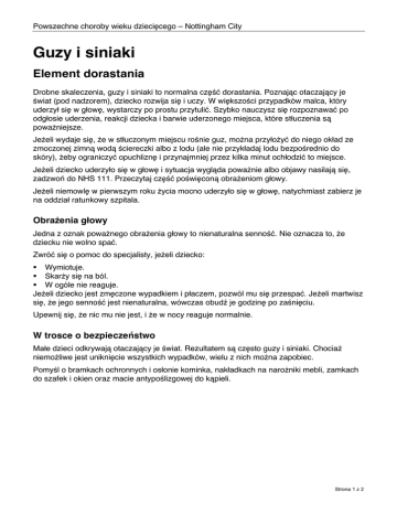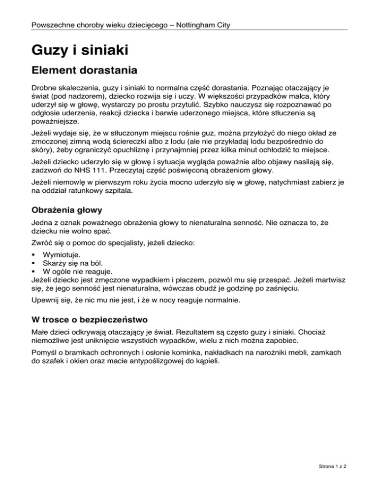 Powszechne choroby wieku dziecięcego – Nottingham City Guzy i siniaki Element dorastania Drobne skaleczenia, guzy i siniaki to normalna część dorastania. Poznając otaczający je świat (pod nadzorem), dziecko rozwija się i uczy. W większości przypadków malca, który uderzył się w głowę, wystarczy po prostu przytulić. Szybko nauczysz się rozpoznawać po odgłosie uderzenia, reakcji dziecka i barwie uderzonego miejsca, które stłuczenia są poważniejsze. Jeżeli wydaje się, że w stłuczonym miejscu rośnie guz, można przyłożyć do niego okład ze zmoczonej zimną wodą ściereczki albo z lodu (ale nie przykładaj lodu bezpośrednio do skóry), żeby ograniczyć opuchliznę i przynajmniej przez kilka minut ochłodzić to miejsce. Jeżeli dziecko uderzyło się w głowę i sytuacja wygląda poważnie albo objawy nasilają się, zadzwoń do NHS 111. Przeczytaj część poświęconą obrażeniom głowy. Jeżeli niemowlę w pierwszym roku życia mocno uderzyło się w głowę, natychmiast zabierz je na oddział ratunkowy szpitala. Obrażenia głowy Jedna z oznak poważnego obrażenia głowy to nienaturalna senność. Nie oznacza to, że dziecku nie wolno spać. Zwróć się o pomoc do specjalisty, jeżeli dziecko: Wymiotuje. Skarży się na ból. W ogóle nie reaguje. Jeżeli dziecko jest zmęczone wypadkiem i płaczem, pozwól mu się przespać. Jeżeli martwisz się, że jego senność jest nienaturalna, wówczas obudź je godzinę po zaśnięciu. Upewnij się, że nic mu nie jest, i że w nocy reaguje normalnie. W trosce o bezpieczeństwo Małe dzieci odkrywają otaczający je świat. Rezultatem są często guzy i siniaki. Chociaż niemożliwe jest uniknięcie wszystkich wypadków, wielu z nich można zapobiec. Pomyśl o bramkach ochronnych i osłonie kominka, nakładkach na narożniki mebli, zamkach do szafek i okien oraz macie antypoślizgowej do kąpieli. Strona 1 z 2 Powszechne choroby wieku dziecięcego – Nottingham City 1 Moje dziecko dość mocno uderzyło się w głowę. Dostało okład z zimnego ręcznika. 2 Jest zmęczone. Zasnęło. To normalne po stresującym przeżyciu. 3 Regularnie sprawdzaj, czy nic mu nie jest i czy zachowuje się normalnie. Jeżeli się martwisz, zadzwoń pod numer NHS 111 albo skontaktuj się z pielęgniarką lub lekarzem. Jeżeli to niemożliwe, zabierz dziecko na oddział ratunkowy szpitala. Strona 2 z 2