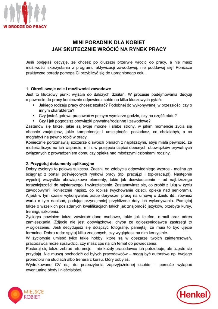MINI PORADNIK DLA KOBIET JAK SKUTECZNIE WRÓCIĆ NA RYNEK PRACY Jeśli podjęłaś decyzję, że chcesz po dłuższej przerwie wrócić do pracy, a nie masz możliwości skorzystania z programu aktywizacji zawodowej, nie poddawaj się! Poniższe praktyczne porady pomogą Ci przybliżyć się do upragnionego celu. 1. Określ swoje cele i możliwości zawodowe Jest to kluczowy punkt wyjścia do dalszych działań. W procesie podejmowania decyzji o powrocie do pracy koniecznie odpowiedz sobie na kilka kluczowych pytań: Jakiego rodzaju pracy chcesz szukać? Podobnej do wykonywanej w przeszłości czy o innym charakterze? Czy jesteś gotowa pracować w pełnym wymiarze godzin, czy na część etatu? Czy i jak pogodzisz obowiązki prywatne/rodzinne i zawodowe? Zastanów się także, jakie są twoje mocne i słabe strony, w jakim momencie życia się obecnie znajdujesz, jakie kompetencje i umiejętności posiadasz, co chciałabyś, a co mogłabyś na pewno robić w pracy. Koniecznie porozmawiaj szczerze o swoich planach z najbliższymi, abyś miała pewność, że możesz liczyć na ich wsparcie, m.in. w przejęciu części obecnych obowiązków prywatnych związanych z prowadzeniem domu czy opieką nad młodszymi członkami rodziny. 2. Przygotuj dokumenty aplikacyjne Dobry życiorys to połowa sukcesu. Zacznij od zdobycia odpowiedniego wzorca - można go ściągnąć z portali poświęconych rynkowi pracy (np. pracuj.pl i top-praca.pl). Następnie wypełnij wszystkie obowiązkowe elementy, takie jak doświadczenie – od najbliższego teraźniejszości do najstarszego, i wykształcenie. Zastanawiasz się, co zrobić z luką w życiu zawodowym? Koniecznie napisz, co robiłaś (wychowanie dzieci, opieka nad seniorami). A jeśli w tym czasie wykonywałaś prace dorywcze, pracę na umowę o dzieło itd., również warto o tym napisać, podając przynajmniej przybliżone daty ich wykonywania. Pamiętaj także o wszelkich posiadanych kwalifikacjach takich jak znajomość języków, przebyte kursy, treningi, szkolenia. Życiorys powinien także zawierać dane osobowe, takie jak telefon, e-mail oraz adres zamieszkania. Zdjęcie nie jest obowiązkowe, chyba że ogłoszeniodawca zastrzegł to w ogłoszeniu. Jeśli decydujesz się dołączyć fotografię, pamiętaj, że musi to być ujęcie formalne. Dobra rada: spytaj kilku znajomych, czy wyglądasz na nim korzystnie. W życiorysie umieść tylko takie hobby, które są w obszarze twoich zainteresowań, pracodawca może sprawdzić, czy masz coś na ich temat do powiedzenia. Postaraj się także zebrać referencje – nie każdy pracodawca ich potrzebuje, ale często się przydają. Nie muszą pochodzić od byłych pracodawców – mogą być autorstwa np. twojego promotora na studiach albo trenera z kursu, który odbyłaś. Wydrukowane CV daj do przeczytania zaprzyjaźnionej osobie – pomoże wyłapać ewentualne błędy i nieścisłości. 3. Bądź pro aktywna szukając ogłoszeń Z gotowym CV możesz zacząć przeglądać ogłoszenia o pracę. Obecnie najbogatszym źródłem ogłoszeń jest Internet, począwszy od portali z ogłoszeniami (pracuj.pl, infopraca.pl, jobpilot.pl, gowork.pl), przez strony agencji doradztwa personalnego, po strony mediów np. gazeta praca.pl, na których również ogłaszają się pracodawcy. Odwiedź także strony firm, które interesują cię jako potencjalni pracodawcy – często publikują one listy dostępnych wakatów. Poinformuj szerokie grono znajomych o swoich planach, poproś o kontakt, jeśli znajomi będą słyszeli lub zobaczą ciekawe ogłoszenie. Możesz także sama wysłać życiorys do firmy, która cię interesuje albo zadzwonić do jej działu kadr z pytaniem o ewentualną możliwość zatrudnienia. Warto także, abyś stworzyła własny profil zawodowy na portalach społeczności zawodowych takich jak np. profeo.pl, linkedin.pl czy goldenline.pl. Pamiętaj również, że im mniejszy pracodawca, tym krótsza ścieżka dotarcia. Jeśli szukasz pracy np. w sklepie lub zakładzie fryzjerskim, warto rozejrzeć się po osiedlu, okolicy i popytać osobiście w tych punktach usługowych, a nawet zostawić od razu swoje cv. Udaj się również do urzędu pracy albo zarejestruj w nim przez Internet. 4. Przygotuj się dobrze do rozmowy kwalifikacyjnej Jeśli dostałaś telefon z zaproszeniem na rozmowę, zachowaj spokój. Koniecznie zapisz datę, godzinę, dokładny adres spotkania oraz nazwisko i stanowisko osoby, z którą się spotkasz. Koniecznie przygotuj się merytorycznie. Odwiedź stronę internetową potencjalnego pracodawcy, przypomnij sobie treść ogłoszenia i wymagania wobec kandydata. Zastanów się, jakie trudne pytania mogą ci być postawione i koniecznie przemyśl odpowiedzi. Warto przeprowadzić próbę rozmowy kwalifikacyjnej z najbliższą przyjaciółką czy partnerem. Pamiętaj o zrobieniu dobrego pierwszego wrażenia! Ważny jest dobór stroju adekwatnego do miejsca i okoliczności. Więcej porad dotyczących stroju możesz zaczerpnąć z Internetu. 5. Zachowaj pozytywne nastawienie Rzadko która osoba dostaje pracę po pierwszej rozmowie kwalifikacyjnej. Nie zrażaj się pierwszymi porażkami, zachowaj pozytywne nastawienie. Najważniejsza jest wiara w to, że znajdziesz pracę. Pamiętaj, że każdemu z nas, z różnych przyczyn, może trafić się dłuższa przerwa w pracy i nie powinien to być powód do kompleksów. Pozytywne nastawienie i motywacją są twoimi sprzymierzeńcami i wartością dodaną w procesie rekrutacyjnym. Poradnik opracowała Grażyna Rembelska, psychoterapeutka i doradca personalny z kilkunastoletnim doświadczeniem w obszarze rekrutacji oraz doboru personelu, absolwentka Wydziału Psychologii na Uniwersytecie Warszawskim, współpracownik Fundacji Miejsce Kobiet, gdzie współprowadzi kursy i szkolenia dla Kobiet powracających na rynek pracy. Więcej na www.anigra.pl
