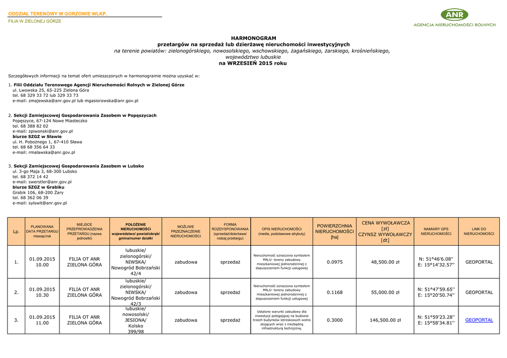 ODDZIAŁ TERENOWY W GORZOWIE WLKP. FILIA W ZIELONEJ GÓRZE HARMONOGRAM przetargów na sprzedaż lub dzierżawę nieruchomości inwestycyjnych na terenie powiatów: zielonogórskiego, nowosolskiego, wschowskiego, żagańskiego, żarskiego, krośnieńskiego, województwo lubuskie na WRZESIEŃ 2015 roku Szczegółowych informacji na temat ofert umieszczonych w harmonogramie można uzyskać w: 1. Filii Oddziału Terenowego Agencji Nieruchomości Rolnych w Zielonej Górze ul. Lwowska 25, 65-225 Zielona Góra tel. 68 329 33 72 lub 329 33 73 e-mail: [email protected] lub [email protected] 2. Sekcji Zamiejscowej Gospodarowania Zasobem w Popęszycach Popęszyce, 67-124 Nowe Miasteczko tel. 68 388 82 02 e-mail: [email protected] biurze SZGZ w Sławie ul. H. Pobożnego 1, 67-410 Sława tel. 68 68 356 64 33 e-mail: [email protected] 3. Sekcji Zamiejscowej Gospodarowania Zasobem w Lubsko ul. 3-go Maja 3, 68-300 Lubsko tel. 68 372 14 42 e-mail: [email protected] biurze SZGZ w Grabiku Grabik 106, 68-200 Żary tel. 68 362 06 39 e-mail: [email protected] Lp. 1. 2. 3. PLANOWANA DATA PRZETARGU miesiąc/rok 01.09.2015 10.00 01.09.2015 10.30 01.09.2015 11.00 MIEJSCE PRZEPROWADZENIA PRZETARGU (nazwa jednostki) POŁOŻENIE NIERUCHOMOŚCI województwo/ powiat/obręb/ gmina/numer działki FILIA OT ANR ZIELONA GÓRA lubuskie/ zielonogórski/ NIWSKA/ Nowogród Bobrzański 42/4 FILIA OT ANR ZIELONA GÓRA FILIA OT ANR ZIELONA GÓRA lubuskie/ zielonogórski/ NIWSKA/ Nowogród Bobrzański 42/3 lubuskie/ nowosolski/ JESIONA/ Kolsko 399/98 MOŻLIWE PRZEZNACZENIE NIERUCHOMOŚCI zabudowa zabudowa zabudowa CENA WYWOŁAWCZA POWIERZCHNIA [zł] NIERUCHOMOŚCI CZYNSZ WYWOŁAWCZY [ha] [dt] FORMA ROZDYSPONOWANIA (sprzedaż/dzierżawa/ rodzaj przetargu) OPIS NIERUCHOMOŚCI (media, podstawowe atrybuty) sprzedaż Nieruchomość oznaczona symbolem MN,U- tereny zabudowy mieszkaniowej jednorodzinnej z dopuszczeniem funkcji usługowej 0.0975 sprzedaż Nieruchomość oznaczona symbolem MN,U- tereny zabudowy mieszkaniowej jednorodzinnej z dopuszczeniem funkcji usługowej sprzedaż Ustalone warunki zabudowy dla inwestycji polegającej na budowie trzech budynków letniskowych wolno stojących wraz z niezbędną infrastrukturą technjczną. NAMIARY GPS NIERUCHOMOŚCI LINK DO NIERUCHOMOŚCI 48,500.00 zł N: 51°46'6.08'' E: 15°14'32.57'' GEOPORTAL 0.1168 55,000.00 zł N: 51°47'59.65'' E: 15°20'50.74'' GEOPORTAL 0.3000 146,500.00 zł N: 51°59'23.28'' E: 15°58'34.81'' GEOPORTAL sprzedaż Ustalone warunki zabudowy dla inwestycji polegającej na budowie trzech budynków letniskowych wolno stojących wraz z niezbędną infrastrukturą technjczną. 0.3000 146,500.00 zł N: 51°59'23.28'' E: 15°58'34.81'' GEOPORTAL sprzedaż Ustalone warunki zabudowy dla inwestycji polegającej na budowie trzech budynków letniskowych wolno stojących wraz z niezbędną infrastrukturą technjczną. 0.3000 146,500.00 zł N: 51°59'23.28'' E: 15°58'34.81'' GEOPORTAL sprzedaż Ustalone warunki zabudowy dla inwestycji polegającej na budowie trzech budynków letniskowych wolno stojących wraz z niezbędną infrastrukturą technjczną. 0.3000 146,500.00 zł N: 51°59'23.28'' E: 15°58'34.81'' GEOPORTAL sprzedaż Ustalone warunki zabudowy dla inwestycji polegającej na budowie trzech budynków letniskowych wolno stojących wraz z niezbędną infrastrukturą technjczną. 0.3000 146,500.00 zł N: 51°59'23.28'' E: 15°58'34.81'' GEOPORTAL zabudowa sprzedaż Ustalone warunki zabudowy dla inwestycji polegającej na budowie trzech budynków letniskowych wolno stojących wraz z niezbędną infrastrukturą technjczną. 0.3000 146,500.00 zł N: 51°59'23.28'' E: 15°58'34.81'' GEOPORTAL SZGZ w POPĘSZYCACH lubuskie/ nowosolski/ STUDZIENIEC/ Kożuchów/ 187/4 niezabudowana strefa osadniczo-rolna sprzedaż ustny nieograniczony Położona w sąsiedztwie działek zabudowanych 0.3048 15,200.00 zł N: 51°48`2.37` E:15°34`15.49` GEOPORTAL SZGZ w POPĘSZYCACH lubuskie/ nowosolski/ MIROCIN DOLNY/ Kożuchów/ 57/7 niezabudowana teren zainwestowania wiejskiego sprzedaż ustny nieograniczony Położona w sąsiedztwie działek zabudowanych 0.0400 3,000.00 zł N: 51°46`56.7` E:15°32`42.26` GEOPORTAL SZGZ w POPĘSZYCACH lubuskie/ nowosolski/ MIROCIN DOLNY/ Kożuchów/ 57/8 niezabudowana teren zainwestowania wiejskiego sprzedaż ustny nieograniczony Położona w sąsiedztwie działek zabudowanych 0.3400 21,300.00 zł N: 51°46`57.37` E:15°32`42.04` GEOPORTAL SZGZ w POPĘSZYCACH lubuskie/ żagański/ CHICHY/ Małomice/ 171/4, 171/3, 173/2 niezabudowana strefa mieszkaniowogospodarcza sprzedaż ustny nieograniczony Położone pośród działek zabudowanych 0.2300 26,300.00 zł N:51 36'56.65` E:150 29`5.95 GEOPORTAL SZGZ w POPĘSZYCACH lubuskie/ żagański/ NOWA KOPERNIA/ Szprotawa/ 171 niezabudowana funkcja rozwoju zabudowy mieszkaniowej sprzedaż ustny nieograniczony Położona pośród użytków rolnych i działek zabudowanych 0.2000 26,400.00 zł N: 51˚32`2.85` E: 15˚34`17.92` GEOPORTAL SZGZ w POPĘSZYCACH lubuskie/ żagański/ DZIKOWICE/ Szprotawa/ 614 niezabudowana strefa rozwoju zabudowy mieszkaniowej sprzedaż ustny nieograniczony Do zabudowań ok. 100 m 1.5000 74,200.00 zł N:51035'37.68` 0 E:15 36`2.9 GEOPORTAL 4. 01.09.2015 11.30 FILIA OT ANR ZIELONA GÓRA 5. 01.09.2015 12.00 FILIA OT ANR ZIELONA GÓRA 6. 01.09.2015 12.30 FILIA OT ANR ZIELONA GÓRA 7. 01.09.2015 13.00 FILIA OT ANR ZIELONA GÓRA 8. 01.09.2015 13.30 FILIA OT ANR ZIELONA GÓRA 9. 10. 11. 12. 13. 14. 01.09.2015 8.00 01.09.2015 9.00 01.09.2015 9.30 01.09.2015 11.00 01.09.2015 12.00 01.09.2015 13.00 lubuskie/ nowosolski/ JESIONA/ Kolsko 399/101 lubuskie/ nowosolski/ JESIONA/ Kolsko 399/102 lubuskie/ nowosolski/ JESIONA/ Kolsko 399/104 lubuskie/ nowosolski/ JESIONA/ Kolsko 399/105 lubuskie/ nowosolski/ JESIONA/ Kolsko 399/106 zabudowa zabudowa zabudowa zabudowa 0 15. 16. 17. 18. 01.09.2015 14.30 02.09.2015 10.00 02.09.2015 11.30 02.09.2015 12.00 SZGZ w POPĘSZYCACH lubuskie/ nowosolski/ DROGOMIL/ Bytom Odrzański/