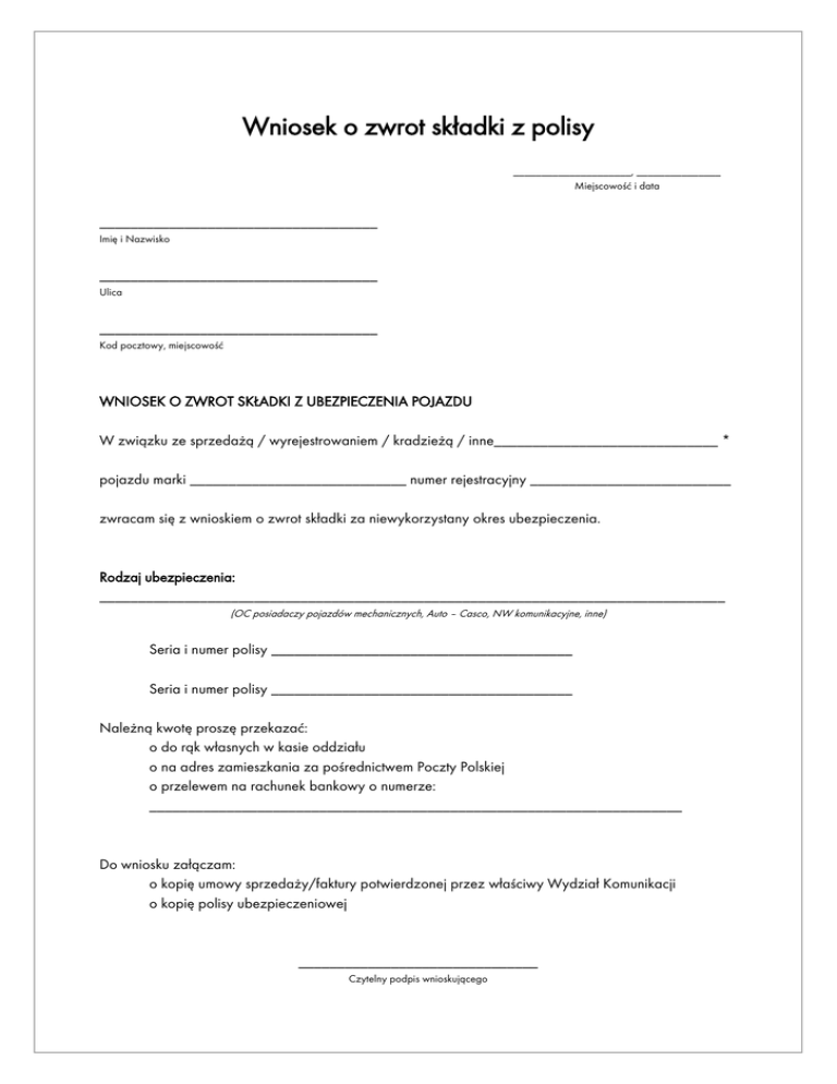Wniosek o zwrot składki z polisy _____________________, _______________ Miejscowość i data ____________________________________ Imię i Nazwisko ____________________________________ Ulica ____________________________________ Kod pocztowy, miejscowość WNIOSEK O ZWROT SKŁADKI Z UBEZPIECZENIA POJAZDU W związku ze sprzedażą / wyrejestrowaniem / kradzieżą / inne_____________________________ * pojazdu marki ____________________________ numer rejestracyjny __________________________ zwracam się z wnioskiem o zwrot składki za niewykorzystany okres ubezpieczenia. Rodzaj ubezpieczenia: _________________________________________________________________________________ (OC posiadaczy pojazdów mechanicznych, Auto – Casco, NW komunikacyjne, inne) Seria i numer polisy _______________________________________ Seria i numer polisy _______________________________________ Należną kwotę proszę przekazać: o do rąk własnych w kasie oddziału o na adres zamieszkania za pośrednictwem Poczty Polskiej o przelewem na rachunek bankowy o numerze: _____________________________________________________________________ Do wniosku załączam: o kopię umowy sprzedaży/faktury potwierdzonej przez właściwy Wydział Komunikacji o kopię polisy ubezpieczeniowej _______________________________ Czytelny podpis wnioskującego