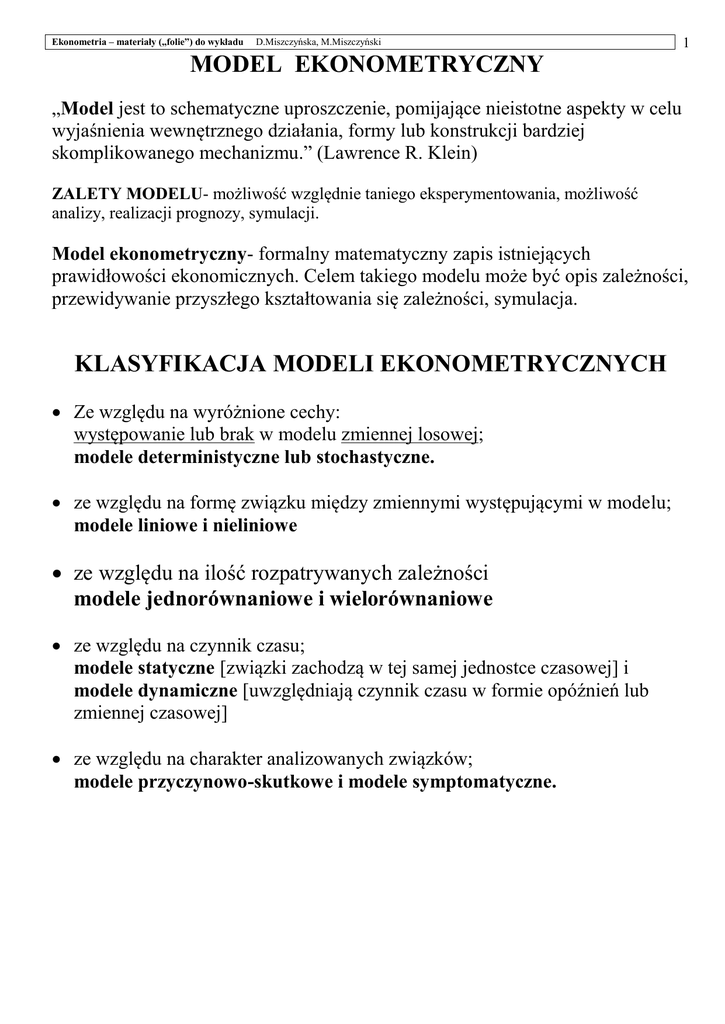 Ekonometria – materiały („folie”) do wykładu D.Miszczyńska, M.Miszczyński 1 MODEL EKONOMETRYCZNY „Model jest to schematyczne uproszczenie, pomijające nieistotne aspekty w celu wyjaśnienia wewnętrznego działania, formy lub konstrukcji bardziej skomplikowanego mechanizmu.” (Lawrence R. Klein) ZALETY MODELU- możliwość względnie taniego eksperymentowania, możliwość analizy, realizacji prognozy, symulacji. Model ekonometryczny- formalny matematyczny zapis istniejących prawidłowości ekonomicznych. Celem takiego modelu może być opis zależności, przewidywanie przyszłego kształtowania się zależności, symulacja. KLASYFIKACJA MODELI EKONOMETRYCZNYCH Ze względu na wyróżnione cechy: występowanie lub brak w modelu zmiennej losowej; modele deterministyczne lub stochastyczne. ze względu na formę związku między zmiennymi występującymi w modelu; modele liniowe i nieliniowe ze względu na ilość rozpatrywanych zależności modele jednorównaniowe i wielorównaniowe ze względu na czynnik czasu; modele statyczne [związki zachodzą w tej samej jednostce czasowej] i modele dynamiczne [uwzględniają czynnik czasu w formie opóźnień lub zmiennej czasowej] ze względu na charakter analizowanych związków; modele przyczynowo-skutkowe i modele symptomatyczne. Ekonometria – materiały („folie”) do wykładu D.Miszczyńska, M.Miszczyński 2 KLASYFIKACJA ZMIENNYCH I PARAMETRÓW WYSTĘPUJĄCYCH W EKONOMETRYCZNYCH MODELACH. Zmienne endogeniczne i egzogeniczne w modelu ekonometrycznym. Zmienne egzogeniczne (zmienne objaśniające w modelu, wśród nich zmienne sterujące będące przedmiotem polityki gospodarczej). Zmienne objaśniane i objaśniające (dot. danego równania ) Zmienne z góry ustalone (zm. egzogeniczne, zmienne endogeniczne z opóźnieniami i z wyprzedzeniami, zmienna czasowa-wyrażająca systematyczne zmiany w czasie zmiennej endogenicznej). Zmienne zerojedynkowe (dla określenia czynników niemierzalnych). Składnik losowy ( zmienna wyrażająca łączny efekt tych czynników, które nie zostały wyspecyfikowane w modelu, a także z błędów wynikających z przyjęcia niewłaściwej postaci funkcyjnej modelu, błędów pomiaru wartości zmiennych. Parametry struktury stochastycznej modelu (parametry rozkładu składnika losowego) Parametry strukturalne modelu (parametry występujące przy kolejnych zmiennych, określające kształtowanie zmiennej objaśnianej). Ekonometria – materiały („folie”) do wykładu D.Miszczyńska, M.Miszczyński 3 ETAPY ANALIZY EKONOMETRYCZNEJ SPECYFIKACJA ZMIENNYCH I DOBÓR POSTACI MODELU USTALENIE PRZEDMIOTU BADANIA, LISTA ZMIENNYCH OBJAŚNIAJĄCYCH I OBJAŚNIANYCH, POSTAĆ FUNKCYJNA MODELU. W OPARCIU O TEORIĘ EKONOMII, ZEBRANE DANE STATYSTYCZNE, KORELACJE. ZEBRANIE DANYCH STATYSTYCZNYCH ZEBRANIE DANYCH, UPORZĄDKOWANIE (SZEREGI CZASOWE, PRZEKROJOWE, PRZEKROJOWO-CZASOWE) I ANALIZA PRZYDATNOŚCI DANYCH. OKREŚLENIE MIERNIKA, PORÓWNYWALNOŚĆ DANYCH. ESTYMACJA PARAMETRÓW WYZNACZENIE OCEN PARAMETRÓW STRUKTURALNYCH ORAZ PARAMETRÓW STRUKTURY STOCHASTYCZNEJ MODELU. NARZĘDZIE - METODA NAJMNIEJSZYCH KWADRATÓW (MNK). WERYFIKACJA MODELU ANALIZA OTRZYMANYCH OCEN PARAMETRÓW STRUKTURALNYCH I STRUKTURY STOCHASTYCZNEJ MODELU. WERYFIKACJA MERYTORYCZNA I STATYSTYCZNA. PRAKTYCZNE WYKORZYSTANIE MODELU ANALIZA PRAWIDŁOWOŚCI ( HISTORYCZNA ). PROGNOZOWANIE Ekonometria – materiały („folie”) do wykładu D.Miszczyńska, M.Miszczyński ESTYMACJA PARAMETRÓW MODELU EKONOMETRYCZNEGO (ESTYMACJA PUNKTOWA) METODA NAJMNIEJSZYCH KWADRATÓW (MNK) Model yt 1 X t1 2 X t 2 k X tk t yt - empiryczna wartość zmiennej objaśnianej w okresie t X tj - empiryczna wartość zmiennej objaśniającej j w okresie t j - nieznany parametr stojący przy zmiennej X j t - zakłócenie w okresie t (składnik losowy) Zapis macierzowy modelu 1 x11 x12 x1k x 21 x 22 x 2k 2 1 y1 y 2 2 α ε X y k n x n1 . x n 2 x nk yn y Xα ε 4 Ekonometria – materiały („folie”) do wykładu D.Miszczyńska, M.Miszczyński Model po oszacowaniu parametrów strukturalnych yt a1 X t1 a2 X t 2 ak X tk et lub yˆt a1 X t1 a2 X t 2 ak X tk yt - empiryczna wartość zmiennej objaśnianej w okresie t ŷt - teoretyczna wartość zmiennej objaśnianej w okresie t X tj - empiryczna wartość zmiennej objaśniającej j w okresie t a j - oszacowany parametr stojący przy zmiennej X j et -realizacja zakłócenia w okresie t (reszta w okresie t) Zapis macierzowy oszacowanego modelu x11 x12 y1 yˆ1 x y yˆ x22 21 2 2 X y yˆ ˆ xn1. xn 2 yn yn a1 a a 2 a k e1 x1k e x2 k e 2 xnk e n y Xa e gdzie lub e y yˆ yˆ Xa 5 Ekonometria – materiały („folie”) do wykładu D.Miszczyńska, M.Miszczyński 6 Wzór MNK (Wyprowadzenie wzoru) Minimalizujemy sumę kwadratów reszt modelu: n t 1 2 et eT e y Xa y Xa T T T T T T y y 2a X y a X Xa min Znajdujemy wartość najmniejszą powyższej funkcji (pochodna po a przyrównana do 0) 2X y 2X Xa 0 T T T X X T X Xa X y T :2 1 lewostronnie Wzór MNK ma postać: 1 a X X X y T T Ekonometria – materiały („folie”) do wykładu D.Miszczyńska, M.Miszczyński WARUNKI STOSOWALNOŚCI MNK 7 1. Zmienna objaśniana y jest zmienną losową, 2. Zmienne objaśniające X nie są zmiennymi losowymi, 3. n>k , tzn. liczba obserwacji n powinna być większa od liczby szacowanych parametrów (zmiennych objaśniających) k 4. zmienne objaśniające nie mogą być współliniowe, tzn wektory obserwacji zmiennych objaśniających (kolumny macierzy X) powinny być liniowo niezależne. 5. składnik losowy musi spełniać następujące założenia: t : N(0, 2 ), E(t )=0, D2 (t )=2 oraz Cov (ij) =0, ij W zapisie macierzowym 4 powyższe założenia sprowadzają się do następującej postaci macierzy wariancji i kowariancji składnika losowego 2 0 2 0 E ( T ) 2 ... ... 0 0 ... 0 ... 0 ... ... 2 ... Przy w/w założeniach MNK daje estymatory: zgodne, nieobciążone i najefektywniejsze. Ekonometria – materiały („folie”) do wykładu D.Miszczyńska, M.Miszczyń