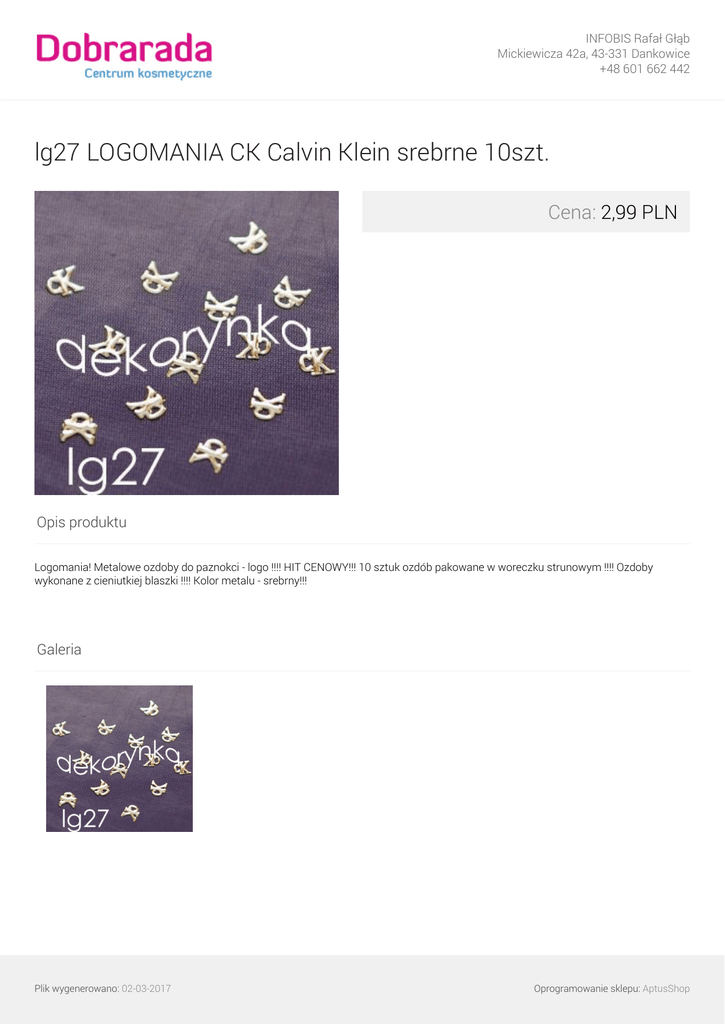INFOBIS Rafał Głąb Mickiewicza 42a, 43-331 Dankowice +48 601 662 442 lg27 LOGOMANIA CK Calvin Klein srebrne 10szt. Cena: 2,99 PLN Opis produktu Logomania! Metalowe ozdoby do paznokci - logo !!!! HIT CENOWY!!! 10 sztuk ozdób pakowane w woreczku strunowym !!!! Ozdoby wykonane z cieniutkiej blaszki !!!! Kolor metalu - srebrny!!! Galeria Plik wygenerowano: 02-03-2017 Powered by TCPDF (www.tcpdf.org) Oprogramowanie sklepu: AptusShop