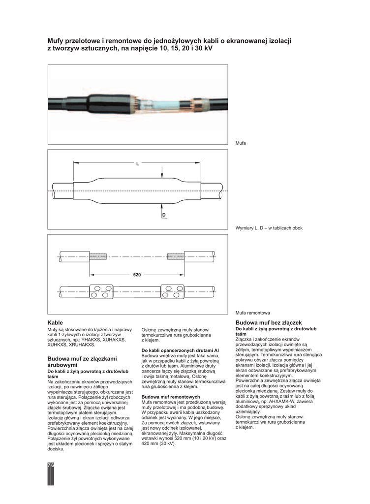 Mufy przelotowe i remontowe do jednożyłowych kabli o ekranowanej izolacji z tworzyw sztucznych, na napięcie 10, 15, 20 i 30 kV Mufa L D Wymiary L, D – w tablicach obok 520 Mufa remontowa Budowa muf bez złączek Kable Mufy są stosowane do łączenia i naprawy kabli 1-żyłowych o izolacji z tworzyw sztucznych, np.: YHAKXS, XUHAKXS, XUHKXS, XRUHAKXS. Budowa muf ze złączkami śrubowymi Do kabli z żyłą powrotną z drutówlub taśm Na zakończeniu ekranów przewodzących izolacji, po nawinięciu żółtego wypełniacza sterującego, obkurczana jest rura sterująca. Połączenie żył roboczych wykonane jest za pomocą uniwersalnej złączki śrubowej. Złączka owijana jest termotopliwym płatem sterującym. Izolację główną i ekran izolacji odtwarza prefabrykowany element koekstruzyjny. Powierzchnia złącza owinięta jest na całej długości ocynowaną plecionką miedzianą. Połączenie żył powrotnych wykonywane jest układem plecionek i sprężyn o stałym docisku. 76 Osłonę zewnętrzną mufy stanowi termokurczliwa rura grubościenna z klejem. Do kabli opancerzonych drutami Al Budowa wnętrza mufy jest taka sama, jak w przypadku kabli z żyłą powrotną z drutów lub taśm. Aluminiowe druty pancerza łączy się złączką śrubową i owija taśmą metalową. Osłonę zewnętrzną mufy stanowi termokurczliwa rura grubościenna z klejem. Budowa muf remontowych Mufa remontowa jest przedłużoną wersją mufy przelotowej i ma podobną budowę. W przypadku awarii kabla uszkodzony odcinek jest wycinany. W jego miejsce, Za pomocą dwóch złączek, wstawiany jest nowy odcinek izolowanej, ekranowanej żyły. Maksymalna długość wstawki wynosi 520 mm (10 i 20 kV) oraz 420 mm (30 kV). Do kabli z żyłą powrotną z drutówlub taśm Złączka i zakończenie ekranów przewodzących izolacji owinięte są żółtym, termotopliwym wypełniaczem sterującym. Termokurczliwa rura sterująca pokrywa obszar złącza pomiędzy ekranami izolacji. Izolacja główna i jej ekran odtwarzane są prefabrykowanym elementem koekstruzyjnym. Powierzchnia zewnętrzna złącza owinięta jest na całej długości ocynowaną plecionką miedzianą. Zestaw mufy do kabli z żyłą powrotną z taśm lub z folią aluminiową, np: AHXAMK-W, zawiera dodatkowy sprężynowy układ uziemiający. Osłonę zewnętrzną mufy stanowi termokurczliwa rura grubościenna z klejem. Mufy przelotowe i remontowe do jednożyłowych kabli o ekranowanej izolacji z tworzyw sztucznych, na napięcie 10, 15, 20 i 30 kV Zestawy muf ze złączkami śrubowymi Mufy przelotowe do kabli z żyłą powrotną z drutów lub taśm Napięcie znamionowe Przekrój żył Typ mufy Kable z żyłą powrotną Uo/U (kV) (mm2) z drutów Kable z żyłą powrotną z taśm lub drutów * Wymiary (mm) L D 6/10 25 – 70 70 – 150 120 – 240 240 – 400 500 630 800 POLJ 12/1x 25- 70 POLJ 12/1x 70-150 POLJ 12/1x120-240 POLJ 12/1x240-400 POLJ 12/1x500 POLJ 12/1x630 POLJ 12/1x800-Al-C** POLJ 12/1x 25- 70-CEE01 POLJ 12/1x 70-150-CEE01 POLJ 12/1x120-240-CEE01 – – – – 450 450 450 500 500 500 550 45 55 65 75 85 85 90 8,7/15 i 12/20 25 – 70 70 – 150 120 – 240 240 – 400 500 630 POLJ 24/1x 25- 70 POLJ 24/1x 70-150 POLJ 24/1x120-240 POLJ 24/1x240-400 POLJ 24/1x500 POLJ 24/1x630 POLJ 24/1x 25- 70-CEE01 POLJ 24/1x 70-150-CEE01 POLJ 24/1x120-240-CEE01 – – – 500 500 500 550 550 550 55 65 70 80 90 90 18/30 35 – 70 70 – 120 120 – 240 300 – 400 500 630 POLJ 42/1x 35- 70 POLJ 42/1x 70-120 POLJ 42/1x120-240 POLJ 42/1x300-400 POLJ 42/1x500 POLJ 42/1x630 POLJ 42/1x 35- 70-CEE01 POLJ 42/1x 70-120-CEE01 POLJ 42/1x120-240-CEE01 – – – 800 850 850 900 900 900 65 70 75 85 95 95 * Zestawy muf są przeznaczone do kabli z żyłą powrotną z taśm miedzianych lub z warstwą Al spojoną z powłoką, np. AHXAMK-W. Mogą być stosowane także do kabli z żyłą powrotną z drutów. Do wykonania połączenia kabli z żyłą powrotną z drutów i kabli z warstwą Al spojoną z powłoką należy stosować mufy do kabli z żyłą powrotną z drutów. ** Zestawy zawierają złączki prasowane DIN do żył aluminiowych. Złączki należy zaprasować narzędziem hydraulicznym, stosując matryce o wyróżniku 58. Dodatkowy zestaw POLJ-SWC/35-70 może być używany do wyprowadzenia i połączenia drutów żył powrotnych 3 kabli 1-żyłowych. Zestaw należy zamawiać oddzielnie. Mufy przelotowe do kabli opancerzonych drutami Al, z żyłą powrotną z drutów lub taśm Napięcie znamionowe Przekrój żył Typ mufy Uo/U (kV) (mm2) Kable z żyłą powrotną z drutów lub taśm Wymiary (mm) L D 6/10 25 – 70 70 – 150 120 – 240 POLJ 12/1x 25- 70-AW POLJ 12/1x 70-150-AW POLJ 12/1x120-240-AW 850 850 850 50 60 70 8,7/15 i 12/20 25 – 70 70 – 150 120 – 240 POLJ 24/1x 25- 70-AW POLJ 24/1x 70-150-AW POLJ 24/1x120-240-AW 900 900 900 60 70 75 18/30 70 – 120 120 – 240 POLJ 42/1x 70-120-AW POLJ 42/1x120-240-AW 1250 1250 75 80 Mufy remontowe do kabli z żyłą powrotną z drutów lub taśm Napięcie znamionowe Przekrój żył Typ mufy Uo/U (kV) (mm2) Długość wstawki mm (maks.) Wymiary (mm) L D 6/10, 8,7/15 i 12/20 25 – 70 70 – 150* 120 – 240 REPJ-24/1x 25- 70 REPJ-24/1x 70-150 REPJ-24/1x120-240 520 520 520 1200 1200 1200 50 55 70 18/30 70 – 120 120 – 240 REPJ-42/1x 70-120 REPJ-42/1x120-240 420 420 1200 1200 55 70 * Kable 10 kV – zakres zastosowania: 95 - 150 mm2 Zestawy muf bez złączek Napięcie znam. Uo/U (kV) Przekrój żył (mm2) (mm2) Typ mufy – kable z żyłą powrotną z drutów z taśm lub drutów * Wymiary (mm) L D i 8,7/15 6/10 kV 50 – 70 95 – 150 185 – 300 400 – 630 800 8,7/15 kV 35 – 50 70 – 120 150 – 240 300 – 500 630 – 800 SXSU 4111 SXSU 4121 SXSU 4131 SXSU 4141 SXSU 5151 SXSU 4111-CEE01 SXSU 4121-CEE01 SXSU 4131-CEE01 SXSU 4141-CEE01 550 600 650 750 750 45 55 65 75 85 12/20 35 – 95 120 – 240 300 – 500 630 – 800 SXSU 5121 SXSU 5131 SXSU 5141 SXSU 5151 SXSU 5121-CEE01 SXSU 5131-CEE01 600 650 750 750 60 70