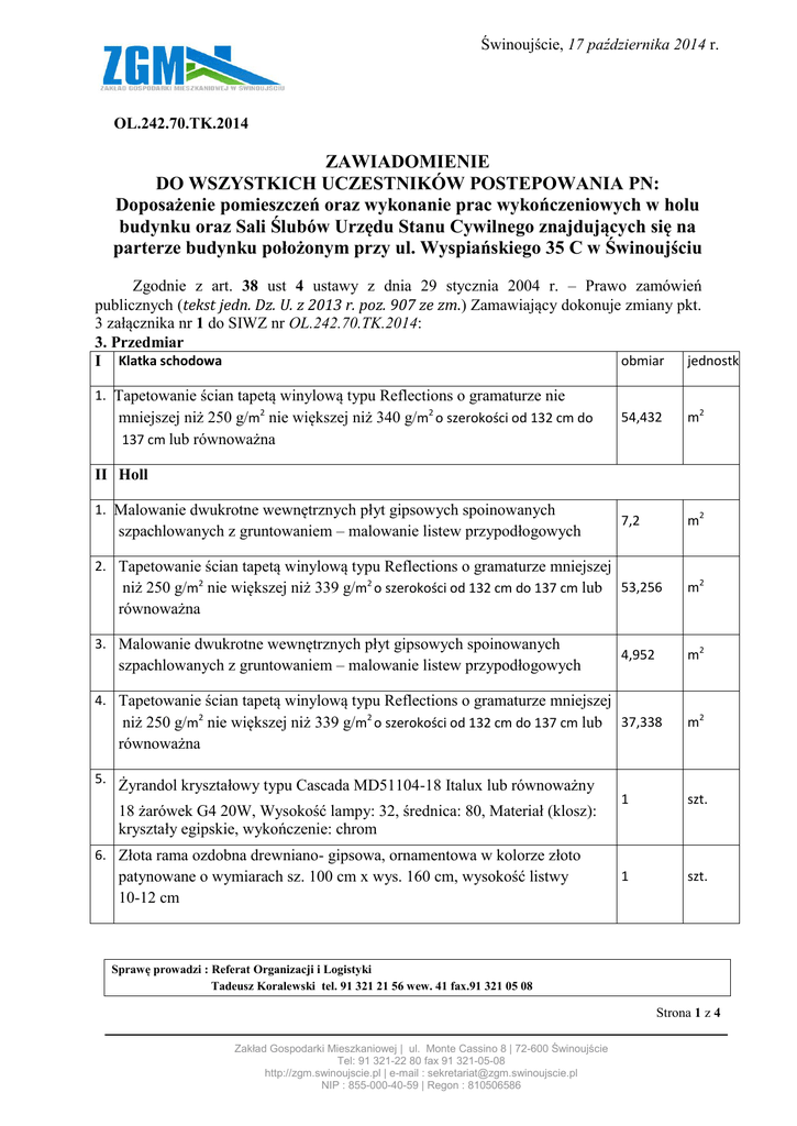 Świnoujście, 17 października 2014 r. OL.242.70.TK.2014 ZAWIADOMIENIE DO WSZYSTKICH UCZESTNIKÓW POSTEPOWANIA PN: Doposażenie pomieszczeń oraz wykonanie prac wykończeniowych w holu budynku oraz Sali Ślubów Urzędu Stanu Cywilnego znajdujących się na parterze budynku położonym przy ul. Wyspiańskiego 35 C w Świnoujściu Zgodnie z art. 38 ust 4 ustawy z dnia 29 stycznia 2004 r. – Prawo zamówień publicznych (tekst jedn. Dz. U. z 2013 r. poz. 907 ze zm.) Zamawiający dokonuje zmiany pkt. 3 załącznika nr 1 do SIWZ nr OL.242.70.TK.2014: 3. Przedmiar obmiar jednostka I Klatka schodowa 1. Tapetowanie ścian tapetą winylową typu Reflections o gramaturze nie mniejszej niż 250 g/m2 nie większej niż 340 g/m2 o szerokości od 132 cm do 137 cm lub równoważna 54,432 m2 7,2 m2 II Holl 1. Malowanie dwukrotne wewnętrznych płyt gipsowych spoinowanych szpachlowanych z gruntowaniem – malowanie listew przypodłogowych 2. Tapetowanie ścian tapetą winylową typu Reflections o gramaturze mniejszej niż 250 g/m2 nie większej niż 339 g/m2 o szerokości od 132 cm do 137 cm lub 53,256 m2 równoważna 3. Malowanie dwukrotne wewnętrznych płyt gipsowych spoinowanych szpachlowanych z gruntowaniem – malowanie listew przypodłogowych m2 4,952 4. Tapetowanie ścian tapetą winylową typu Reflections o gramaturze mniejszej niż 250 g/m2 nie większej niż 339 g/m2 o szerokości od 132 cm do 137 cm lub 37,338 m2 równoważna 5. Żyrandol kryształowy typu Cascada MD51104-18 Italux lub równoważny 18 żarówek G4 20W, Wysokość lampy: 32, średnica: 80, Materiał (klosz): kryształy egipskie, wykończenie: chrom 1 szt. 1 szt. 6. Złota rama ozdobna drewniano- gipsowa, ornamentowa w kolorze złoto patynowane o wymiarach sz. 100 cm x wys. 160 cm, wysokość listwy 10-12 cm Sprawę prowadzi : Referat Organizacji i Logistyki Tadeusz Koralewski tel. 91 321 21 56 wew. 41 fax.91 321 05 08 Strona 1 z 4 Zakład Gospodarki Mieszkaniowej | ul. Monte Cassino 8 | 72-600 Świnoujście Tel: 91 321-22 80 fax 91 321-05-08 http://zgm.swinoujscie.pl | e-mail : [email protected] NIP : 855-000-40-59 | Regon : 810506586 7. Sofa dwuosobowa typu Klippan lub równoważna wykonana z białej ekoskóry o wymiarach: Gł: 88 cm, Wys.: 66 cm, Sz: 180 cm, Gł. siedziska: 1 54 cm, Wys. siedziska: 43 cm, szt. 8. Litery z bolcami montowany na ścianie przy wejściu do Sali ślubów treści: SALA ŚLUBÓW wykonany z blachy ze stali nierdzewnej szczotkowanej gr.2-3 mm ciętej waterjetem szerokość napisu 66 cm, wysokość całego bloku 34 cm wysokość litery S 15 cm 9 Folia samoprzylepna bezbarwna matowa (piaskowana) typu Oracal lub równoważna naklejona w świetle okna w toalecie. 1 kpl. 2,1 m2 7,46 m2 26,082 m2 11,8 m2 17,58 m2 97,5 m2 III Szatnia, sala toastów i zmywalnia 1. Malowanie dwukrotne wewnętrznych płyt gipsowych spoinowanych szpachlowanych z gruntowaniem – malowanie listew przypodłogowych 2. Tapetowanie ścian tapetą winylową typu Reflections o gramaturze mniejszej niż 250 g/m2 nie większej niż 339 g/m2 o szerokości od 132 cm do 137 cm lub równoważna IV Sala ślubów 1. Malowanie dwukrotne wewnętrznych płyt gipsowych spoinowanych szpachlowanych z gruntowaniem – malowanie listew przypodłogowych 2. Malowanie dwukrotne wewnętrznych płyt gipsowych spoinowanych szpachlowanych z gruntowaniem – malowanie listew przypodłogowych 3. Tapetowanie ścian tapetą winylową typu Reflections o gramaturze mniejszej niż 250 g/m2 nie większej niż 339 g/m2 o szerokości od 132 cm do 137 cm lub równoważna IV Sala toastów i szatnia 1. Stół cateringowy z nogami drewnianymi owalny 150 cm X 80 cm melamina 1 dąb luksor, szt 2. Obrus na stół cateringowy z poz. 1 długość do podłoża– biały plisowany (plisa 5 cm) 4 szt 3. Wieszak na ubrania stojący typu WU-18 lub równoważny o wymiarach wys. 181cm x szer. 49 cm x dług. 103 cm 3 szt Sprawę prowadzi : Referat Organizacji i Logistyki Tadeusz Koralewski tel. 91 321 21 56 wew. 41 fax.91 321 05 08 Strona 2 z 4 Zakład Gospodarki Mieszkaniowej | ul. Monte Cassino 8 | 72-600 Świnoujście Tel: 91 321-22 80 fax 91 321-05-08 http://zgm.swinoujscie.pl | e-mail : [email protected] NIP : 855-000-40-59 | Regon : 810506586 4. Wieszak na ubrania- drewniany typu Bumerang lub równoważny 96 szt. 1 szt. Zmywarka do szkła z wyparzaniem z 2 koszami na szkło, 1 koszem na sztućce, 1 stelaż na spodki min 15 szt.o wymiarach (szer.x gł.x wys.): 420x500x655 6. 1 mm, z dozownikiem na płyn myjący i nabłyszczający, automatycznym pobieraniem płynu, z elektronicznym sterowaniem zasilanie 230 V klp. Zlew ze stali nierdzewnej (z zestawem odpływowy)- zmywak wpuszczany 7. jednokomorowy (z otworem na montaż baterii kuchennej z poz. 8) z ociekaczem 1 typu BASIC ET78 78/43,5 len PYRAMIS lub równoważny Klp. Jednouchwytowa bateria kuchenna, średnia wylewka, montaż jednootworowy, 8. głowica ceramiczna 35 mm typ. Grohe Eurostyle Cosmopolitan lub 1 równoważna szt. Zabudowa kuchenna na zamówienie – Korpus szafek i blat z płyty laminowanej w kolorze wiąz adagio (Krono) lub równoważnym. Fronty szafek wiszących 9. pełne. Zlew, lodówka, zmywarka z wyważarką w zabudowie, pod zlewem 1 segregator na śmieci. Zawiasy drzwiczek z samozamykaczami i hamulcami (wg projektu aranżacji stanowiącej zał. do SIWZ) kpl 5 Lodówka do zabudowy o wymiarach (wys. x szer. x gł.) 81,5 x 56 x 55cm, o pojemności chłodziarki ok. 97 l. i zamrażalki ok. 17 l. tylu Elektrolux ERN1200 FOW lub równoważna zasilanie 230 V V Sala ślubów parametry mebli krzesła taborety Krzesło tapicerowane wysokie (98-107 cm) – stelaż wykonany z jasnego drewna lakierowanego w kolorze wiąz adagio (Krono) lub równoważnym. 1. Siedzisko i oparcie tapicerowane materiałem w kolorze granatowym RAL 5013. Oparcie pikowane 5 szt Krzesło tapicerowane wysokie (84-98 cm) – stelaż wykonany z jasnego drewna lakierowanego w kolorze wiąz adagio (Krono) lub równoważnym. Siedzisko i 2. 66 oparcie t