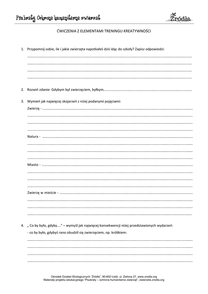 Psubraty. Ochrona humanitarna zwierzat ĆWICZENIA Z ELEMENTAMI TRENINGU KREATYWNOŚCI 1. Przypomnij sobie, ile i jakie zwierzęta napotkałeś dziś idąc do szkoły? Zapisz odpowiedzi: …………………………………………………………………………………………………………………………………………………………………… …………………………………………………………………………………………………………………………………………………………………… …………………………………………………………………………………………………………………………………………………………………… …………………………………………………………………………………………………………………………………………………………………… 2. Rozwiń zdanie: Gdybym był zwierzęciem, byłbym………………………………………………………………………………………. 3. Wymień jak najwięcej skojarzeń z niżej podanymi pojęciami: Zwierzę - …………………………………………………………………………………………………………………………………………………….. ………………………………………………………………………………………………………………………………………………………………….… ………………………………………………………………………………………………………………………………………………………………….… ……………………………………………………………………………………………………………………………………………………………………. Natura - …………………………………………………………………………………………………………………….…………………………….... ………………………………………………………………………………………………………………………………….………………………………… ………………………………………………………………………………………………………………………………….………………………………… ………………………………………………………………………………………………………………………………….………………………………… Miasto - ……………………………………………………………………………………………………………………………………………………… ……………………………………………………………………………………………………………………………………………………………………. ……………………………………………………………….…………………………………………………………………………………………………… ……………………………………………………………….……………………………………………………………………………………………........ Zwierzę w mieście - ……………………………………………………………………………………………………………………………………. ……………………………………………………………………………………………………………………………………………………………………. ………………………………………………………………………………………………………………………………………………………….………… …………………………………………………………….…………………………………………………………………………………………………….. 4. „ Co by było, gdyby….” – wymyśl jak najwięcej konsekwencji niżej przedstawionych wydarzeń: - co by było, gdybyś rano obudził się zwierzęciem, np. królikiem: …………………………………………………………………………………………………………………………………………………….……………… …………………………………………………………………………………………………………………………………………………….……………… …………………………………………………………………………………………………………………………………………………….……………… ……………………………………………………………………………………………………………………………………………………………………. Ośrodek Działań Ekologicznych “Źródła”, 90-602 Łódź, ul. Zielona 27, www.zrodla.org Materiały projektu edukacyjnego “Psubraty – ochrona humanitarna zwierząt”, zwierzeta.zrodla.org Psubraty. Ochrona humanitarna zwierzat - co by było, gdyby nagle z powierzchni ziemi zniknęły wszystkie zwierzęta: ………………………………………………………………………………………………………………………………………………………………….… ……………………………………………………………………………………………………………………………………………………………………. ………………………………………………………………………………………………………………………………………………………………….… ……………………………………………………