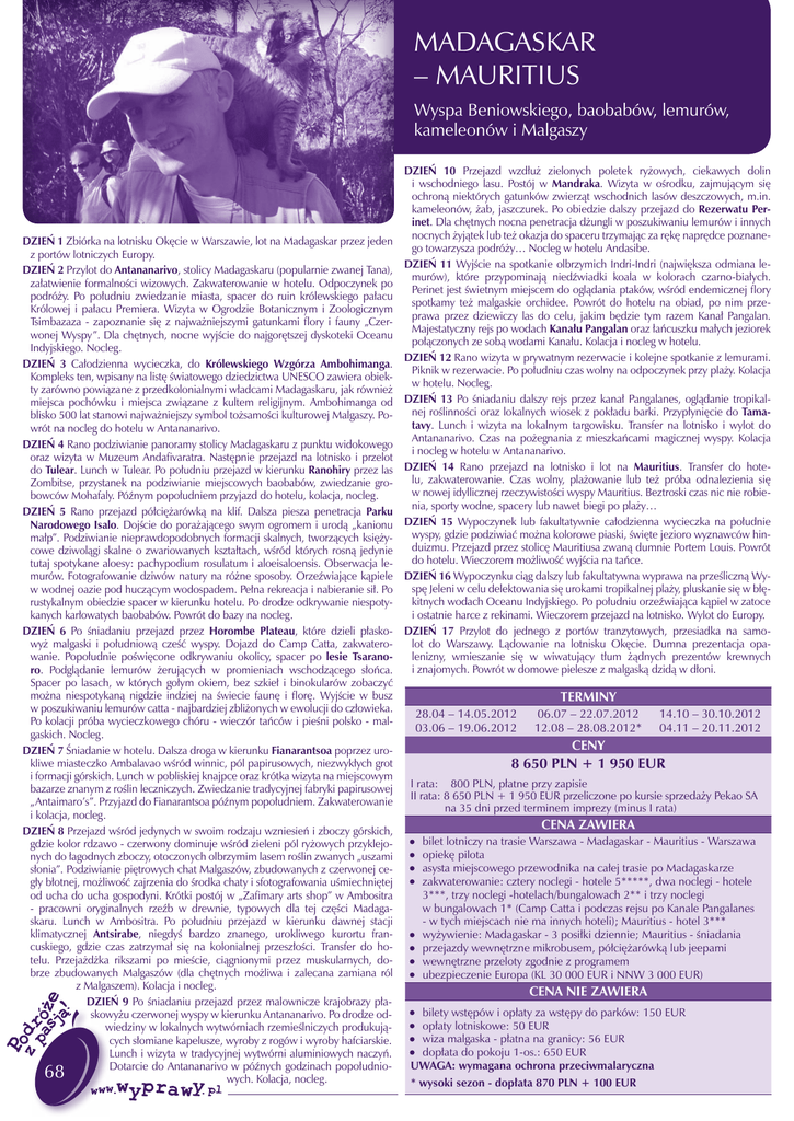 MADAGASKAR – MAURITIUS Wyspa Beniowskiego, baobabów, lemurów, kameleonów i Malgaszy Dzień 1 Zbiórka na lotnisku Okęcie w Warszawie, lot na Madagaskar przez jeden z portów lotniczych Europy. Dzień 2 Przylot do Antananarivo, stolicy Madagaskaru (popularnie zwanej Tana), załatwienie formalności wizowych. Zakwaterowanie w hotelu. Odpoczynek po podróży. Po południu zwiedzanie miasta, spacer do ruin królewskiego pałacu Królowej i pałacu Premiera. Wizyta w Ogrodzie Botanicznym i Zoologicznym Tsimbazaza - zapoznanie się z najważniejszymi gatunkami flory i fauny „Czerwonej Wyspy”. Dla chętnych, nocne wyjście do najgorętszej dyskoteki Oceanu Indyjskiego. Nocleg. Dzień 3 Całodzienna wycieczka, do Królewskiego Wzgórza Ambohimanga. Kompleks ten, wpisany na listę światowego dziedzictwa UNESCO zawiera obiekty zarówno powiązane z przedkolonialnymi władcami Madagaskaru, jak również miejsca pochówku i miejsca związane z kultem religijnym. Ambohimanga od blisko 500 lat stanowi najważniejszy symbol tożsamości kulturowej Malgaszy. Powrót na nocleg do hotelu w Antananarivo. Dzień 4 Rano podziwianie panoramy stolicy Madagaskaru z punktu widokowego oraz wizyta w Muzeum Andafivaratra. Następnie przejazd na lotnisko i przelot do Tulear. Lunch w Tulear. Po południu przejazd w kierunku Ranohiry przez las Zombitse, przystanek na podziwianie miejscowych baobabów, zwiedzanie grobowców Mohafaly. Późnym popołudniem przyjazd do hotelu, kolacja, nocleg. Dzień 5 Rano przejazd półciężarówką na klif. Dalsza piesza penetracja Parku Narodowego Isalo. Dojście do porażającego swym ogromem i urodą „kanionu małp”. Podziwianie nieprawdopodobnych formacji skalnych, tworzących księżycowe dziwolągi skalne o zwariowanych kształtach, wśród których rosną jedynie tutaj spotykane aloesy: pachypodium rosulatum i aloeisaloensis. Obserwacja lemurów. Fotografowanie dziwów natury na różne sposoby. Orzeźwiające kąpiele w wodnej oazie pod huczącym wodospadem. Pełna rekreacja i nabieranie sił. Po rustykalnym obiedzie spacer w kierunku hotelu. Po drodze odkrywanie niespotykanych karłowatych baobabów. Powrót do bazy na nocleg. Dzień 6 Po śniadaniu przejazd przez Horombe Plateau, które dzieli płaskowyż malgaski i południową cześć wyspy. Dojazd do Camp Catta, zakwaterowanie. Popołudnie poświęcone odkrywaniu okolicy, spacer po lesie Tsaranoro. Podglądanie lemurów żerujących w promieniach wschodzącego słońca. Spacer po lasach, w których gołym okiem, bez szkieł i binokularów zobaczyć można niespotykaną nigdzie indziej na świecie faunę i florę. Wyjście w busz w poszukiwaniu lemurów catta - najbardziej zbliżonych w ewolucji do człowieka. Po kolacji próba wycieczkowego chóru - wieczór tańców i pieśni polsko - malgaskich. Nocleg. Dzień 7 Śniadanie w hotelu. Dalsza droga w kierunku Fianarantsoa poprzez urokliwe miasteczko Ambalavao wśród winnic, pól papirusowych, niezwykłych grot i formacji górskich. Lunch w pobliskiej knajpce oraz krótka wizyta na miejscowym bazarze znanym z roślin leczniczych. Zwiedzanie tradycyjnej fabryki papirusowej „Antaimaro’s”. Przyjazd do Fianarantsoa późnym popołudniem. Zakwaterowanie i kolacja, nocleg. Dzień 8 Przejazd wśród jedynych w swoim rodzaju wzniesień i zboczy górskich, gdzie kolor rdzawo - czerwony dominuje wśród zieleni pól ryżowych przyklejonych do łagodnych zboczy, otoczonych olbrzymim lasem roślin zwanych „uszami słonia”. Podziwianie piętrowych chat Malgaszów, zbudowanych z czerwonej cegły błotnej, możliwość zajrzenia do środka chaty i sfotografowania uśmiechniętej od ucha do ucha gospodyni. Krótki postój w „Zafimary arts shop” w Ambositra - pracowni oryginalnych rzeźb w drewnie, typowych dla tej części Madagaskaru. Lunch w Ambositra. Po południu przejazd w kierunku dawnej stacji klimatycznej Antsirabe, niegdyś bardzo znanego, urokliwego kurortu francuskiego, gdzie czas zatrzymał się na kolonialnej przeszłości. Transfer do hotelu. Przejażdżka rikszami po mieście, ciągnionymi przez muskularnych, dobrze zbudowanych Malgaszów (dla chętnych możliwa i zalecana zamiana ról z Malgaszem). Kolacja i nocleg. Dzień 9 Po śniadaniu przejazd przez malownicze krajobrazy płaskowyżu czerwonej wyspy w kierunku Antananarivo. Po drodze odwiedziny w lokalnych wytwórniach rzemieślniczych produkujących słomiane kapelusze, wyroby z rogów i wyroby hafciarskie. Lunch i wizyta w tradycyjnej wytwórni aluminiowych naczyń. Dotarcie do Antananarivo w późnych godzinach popołudniowych. Kolacja, nocleg. 68 Dzień 10 Przejazd wzdłuż zielonych poletek ryżowych, ciekawych dolin i wschodniego lasu. Postój w Mandraka. Wizyta w ośrodku, zajmującym się ochroną niektórych gatunków zwierząt wschodnich lasów deszczowych, m.in. kameleonów, żab, jaszczurek. Po obiedzie dalszy przejazd do Rezerwatu Perinet. Dla chętnych nocna penetracja dżungli w poszukiwaniu lemurów i innych nocnych żyjątek lub też okazja do spaceru trzymając za rękę naprędce poznanego towarzysza podróży… Nocleg w hotelu Andasibe. Dzień 11 Wyjście na spotkanie olbrzymich Indri-Indri (największa odmiana lemurów), które przypominają niedźwiadki koala w kolorach czarno-białych. Perinet jest świetnym miejscem do oglądania ptaków, wśród endemicznej flory spotkamy też malgaskie orchidee. Powrót do hotelu na obiad, po nim przeprawa przez dziewiczy las do celu, jakim będzie tym razem Kanał Pangalan. Majestatyczny rejs po wodach Kanału Pangalan oraz łańcuszku małych jeziorek połączonych ze sobą wodami Kanału. Kolacja i nocleg w hotelu. Dzień 12 Rano wizyta w prywatnym rezerwacie i kolejne spotkanie z lemurami. Piknik w rezerwacie. Po południu czas wolny na odpoczynek przy plaży. Kolacja w hotelu. Nocleg. Dzień 13 Po śniadaniu dalszy rejs przez kanał Pangalanes, oglądanie tropikalnej roślinności oraz lokalnych wiosek z pokładu barki. Przy