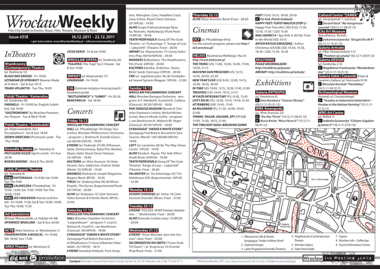 WrocławWeekly IMPART (ul. Mazowiecka 17) Leningrad - Fri 19:00 tion, Afterglow, Clon, Headline Crack, Joao, Echoe, Royal Chest (Various: 25/18PLN) - 19:00 ALIVE Grupa Podwyższonego Ryzyka, Nonsens, Narkolepsja (Punk Rock: 15/8PLN) - 19:00 TEATR PIEŚŃ KOZŁA (Song Of The Goat Theatre / ul. Purkyniego 1) “Songs of Lear – Labyrinth" (Theatre: Free) - 20:00 IMPART (ul. Mazowiecka 17) Lenny Valentino (Pop: 60/50/40PLN) - 20:00 MADNESS Bulbulators, The Headhunters, Pils (Punk: 20PLN) - 20:00 KULTOWA Katedra, Orderless, Strain, Bitter Sand, Clairvoya (10PLN) - 20:00 CRK (ul. Jagiellończyka 10c/d) Pandadread Sound System (Reggae: 10PLN) - 21:00 CIA (Centrum inicjatyw Artystycznych / Sunday 18.12 Sienkiewicza 8a) “Beztlenowce" & “Limbo" - Fri 20:30 Reaktancja - Sat 18:00 WROCŁAW PHILHARMONIC CONCERT HALL Wrocław Baroque Orchestra - program: G.F. Händel/A. Scarlatti/A. Caldara (Classical: 30/20/10PLN) - 18:00 PAN TADEUSZ MUSEUM (Rynek 6) Christian Danowicz (violin), Michał Micker (viola), Marcin Misiak (cello) - program: L.van Beethoven/A. Webern/M. Reger (Classical: 30/20/10PLN) - 18:00 SYNAGOGUE “UNDER A WHITE STORK" (Synagoga Pod Białym Bocianem) Sara Tavares (World: 130/100/80/50PLN) 19:00 LOFT (ul. Łaciarska 28) By The Way (Xmas Carols: 15PLN) - 19:00 ALIVE Random, Rayne, The Side Effect pl. Jana (Funk/Rock: 8/4PLN) - 19:00 Pawła II TEATR PIEŚŃ KOZŁA (Song Of The Goat Theatre) “Songs of Lear – Labyrinth" (Theatre: Free) - 20:00 FALANSTER (ul. Św Antoniego 23) Tim Holehouse (US) (Experimental: 10PLN) - 22:00 Free City Guide to Events, Music, Film, Theatre, Museum & More Issue #318 16.12.2011 - 22.12.2011 > get more online: www.WroclawWeekly.pl > [email protected] InTheaters Współczesny (Contemporary) Theatre (ul. Rzeźnicza 12) Klaus der Grosse - Fri 19:00 Sztandar ze spódnicy (Banner Made of A Skirt) - Sat & Sun 19:15 Trans-Atlantyk - Tue-Thu 19:00 Polski Theatre / Kameralna (ul. Świdnicka 28) Farinelli - Fri 19:00 [w/ English Subtitles]; Sat 19:00 “Gastronomia" by Wrocław Pantomime Theatre - Tue & Wed 19:00 Polski Theatre / Świebodzki (pl. Orląt Lwowskich 20c) Poczekalnia.0 - Sat & Sun 18:00 Ziemia obiecana (Promised Land) - Tue -Thu 19:00 Komedia Theatre (pl. Teatralny 4) Przyjazne dusze (Spirit Level) - Fri-Sun 20:00 Boeing Boeing - Wed & Thu 20:00 Lalek (Puppet) Theatre (pl. Teatralny 4) Kids Pastorałka - Fri 9:00; Sat 15:00; Tue-Thu 9:00 Kids Calineczka (Thumbelina) - Fri 10:00, 12:00; Sat 11:00, 14:00; Tue-Thu 10:00, 12:00 Kids Jaś i Małgosia (Hansel and Gretel) - Fri 10:00, 11:30; Sat & Sun 12:00, 14:00; Tue-Thu 10:00, 11:30 Ad Spectatores (Browar Mieszczański, ul. Hubska 44-48) Opowieść Wigilijna - Sat & Sun 20:00 RCTB (Hala Stulecia, ul. Wystawowa 1) Frankenstein: A Musical - Fri 19:00; SAt 18:00; Sun 17:00 ARKA Theatre (ul. Mennicza 3) Ucisz serce - Fri & Sat 19:00 WROCŁAW OPERA (ul. Świdnicka 35) “Pułapka (The Trap)" by Z. Krauze - Sat & Sun 19:00 Concerts Friday 16.12 WROCŁAW PHILHARMONIC CONCERT HALL (ul. Piłsudskiego 19) Diego Tosi (violin), Wrocław Philharmonic Orchestra - program: J. Brahms/A. Dvořák (Classical: 60/40/25PLN) - 19:00 ŁYKEND (ul. Podwale 37/38) Offreason, Splot, Demonstracja, Ryba Piła, Blanket, Skaza, Halo!, Royal Chest (Various: 25/18PLN) - 19:00 KULTOWA (ul. Wita Stwosza 16) Hate, Disarm, Stos, Addiction, Violent Strike (Metal: 25/20PLN) - 19:00 MADNESS (Hubska 6) Joseph Magazine, Magira (Rock: 8PLN) - 19:30 FIRLEJ (ul. Grabiszyńska 56) 60 Minut Projekt, The Kurws (Experimental/Punk: 20/15PLN) - 20:00 ALIVE (ul. Kolejowa 12) [Jam Session] Oskar Kunicki & Friends (Rock: 8PLN) 21:00 Saturday 17.12 WROCŁAW PHILHARMONIC CONCERT HALL Wrocław Chamber Orchestra “Leopoldinum" - program: F. Liszt/C. Nielsen/A. Corelli/L. van Beethoven (Classical: 30/20PLN) - 18:00 SYNAGOGUE “UNDER A WHITE STORK" (Synagoga Pod Białym Bocianem / ul.Włodkowica 7) Irena Urbańska (Hawdalah: 25/15PLN) - 18:13 ŁYKEND Snowbal Ambush, Pure Incep- Monday 19.12 SCHODY DONIKĄD (pl. Solny 13) [Jam Session] Outsider (Blues: Free) - 21:00 Thursday 22.12 ALIVE Wlazi Acoustic Band (Free) - 20:00 Cinemas DCF (ul. Piłsudskiego 64/a) For the current program, please see http:// dcf.wroclaw.pl/ HELIOS (Kazimierza Wielkiego 19a-21) http://www.heliosnet.pl The Thing (US) 11:00, 13:00, 15:00, 17:00, 19:00, 21:15 Machine Gun Preacher (US) 12:15, 16:45, 20:00, 22:30 New Year’s Eve (US) 9:45, 12:00, 14:15, 16:30, 18:45, 20:30 In Time (US) 10:45, 13:15, 15:30, 17:45, 21:00 Trespass (US) 14:45, 19:15, 21:15 Wyjazd Integracyjny (PL) 9:30, 13:45 Listy do M. (PL) 12:45, 15:15, 19:30, 21:45 Attenberg (GR) 15:45, 17:45 80 Milionów (PL) 11:30, 16:00, 19:45, 22:00 Tinker, Tailor, Soldier, Spy (FR/GB) 11:00, 13:30, 18:15, 21:00 The Twilight Saga: Breaking Dawn Part 1 (US) 10:15, 18:00, 20:45 > For Kids (Polish Dubbed): Happy Feet: Tupot małych stóp 2 / Happy Feet Two (AU) [3D] 9:30, 11:30, 13:30, 17:30 / [2D] 15:30 Mali agenci 4 / Spy Kids 4: All the Time in the World (US) 10:15 Artur ratuje Gwiazdkę / Arthur Christmas (US/GB) [3D] 10:30, 14:30, 18:30 / [2D] 12:30, 16:30 MULTIKINO Cultural Centre “ZAMEK" (pl. Świętojański 1, Leśnica) > Gerard Koch “Na marginesie rysunek" (09.12.11-08.01.12) City Art Museum (StaryRatusz, Rynek) > ankamierzejewska “Drugie De eN A" (02.12.11-15.01.12) Galeria Arttrakt (ul. Ofiar Oświęcimskich 1/1) > “Przełam się sztuką" (02.12.11-20.01.12) Galeria DESIGN Pasaż Grunwaldzki: http://multikino.pl/pasaz/ Arkady: http://multikino.pl/arkady/ Exhibitions Galeria ENTROPIA (ul. Świdnicka 2-4) > Magdalena Frankowska “Wunderkammer" (25.11.11-14.01.12) Galeria Szkła i Ceramiki (Glass & Ceramics Gallery/ pl. Kościuszki 9/10) > Mirosław Kociński “Paradoksy” (24.11.11-28.12.11) Archaeological Museum (ul. Rzeźnicza 4) > Ewa Harabasz “Czarne Obrazy" (09.12.11-03.01.12) BWA Awangarda (Arsenał, ul. Cieszyńskiego) > “Voodoo w malarstwie haitańskim / Voodoo in the Haitian Painting" (15.11.1131.12.11) (