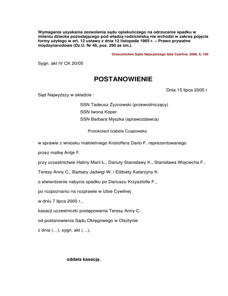 Wymaganie uzyskania zezwolenia sądu opiekuńczego na odrzucenie spadku w imieniu dziecka pozostającego pod władzą rodzicielską nie wchodzi w zakres pojęcia formy użytego w art. 12 ustawy z dnia 12 listopada 1965 r. – Prawo prywatne międzynarodowe (Dz.U. Nr 46, poz. 290 ze zm.). Orzecznictwo Sądu Najwyższego Izba Cywilna, 2006, 6, 106 Sygn. akt IV CK 20/05 POSTANOWIENIE Dnia 15 lipca 2005 r. Sąd Najwyższy w składzie : SSN Tadeusz Żyznowski (przewodniczący) SSN Iwona Koper SSN Barbara Myszka (sprawozdawca) Protokolant Izabela Czapowska w sprawie z wniosku małoletniego Kristoffera Dario F. reprezentowanego przez matkę Antje F. przy uczestnictwie Haliny Marii Ł., Danuty Stanisławy K., Stanisława Wojciecha F., Teresy Anny C., Barbary Jadwigi W. i Elżbiety Katarzyny K. o stwierdzenie nabycia spadku po Dariuszu Krzysztofie F., po rozpoznaniu na rozprawie w Izbie Cywilnej w dniu 7 lipca 2005 r., kasacji uczestniczki postępowania Teresy Anny C. od postanowienia Sądu Okręgowego w Olsztynie z dnia (…), sygn. akt (…), oddala kasację. 2 Uzasadnienie Sąd Rejonowy w Olsztynie – po rozpoznaniu sprawy z wniosku małoletniego Kristoffer`a Dario F., w imieniu i na rzecz którego działała matka Antje Sabine F., przy uczestnictwie Haliny Ł., Danuty K., Stanisława F., Teresy C., Barbary W. i Elżbiety K. o stwierdzenie nabycia spadku – postanowieniem z dnia 16 kwietnia 2004 r. stwierdził, że spadek po Dariuszu Krzysztofie F., zmarłym dnia 10 marca 2002 r. w Leverkusen i tam ostatnio zamieszkałym, na podstawie ustawy, nabył w całości, łącznie z wchodzącym w skład spadku gospodarstwem rolnym położonym w M., syn Kristoffer Dario F. Podstawę orzeczenia stanowiły następujące ustalenia i wnioski. Spadkodawca Dariusz Krzysztof F., będący obywatelem polskim, zmarł dnia 10 marca 2002 r. w miejscu swojego ostatniego zamieszkania w Leverkusen na terenie Niemiec. Był rozwiedziony; z małżeństwa z obywatelką niemiecką Antje Sabine F. miał jedno dziecko – syna Kristoffer`a Dario F. urodzonego w Köln dnia 13 listopada 1998 r. Poza tym miał rodzeństwo: Halinę Łojowską, Danutę Krośnicką, Stanisława F., Teresę C., Barbarę W. i Elżbietę K. Zmarł nie pozostawiając testamentu. W skład spadku wchodzi gospodarstwo rolne położone w Polsce. Po śmierci spadkodawcy Antje Sabine F. przyjęła spadek w imieniu małoletniego syna Kristoffer`a, jednak w dniu 31 maja 2002 r. złożyła przed sądem oświadczenie o uchyleniu objęcia spadku; twierdziła, że przyjęła spadek nie wiedząc o jego zadłużeniu. Postanowieniem z dnia 9 sierpnia 2002 r. Sąd Rejonowy w Siegburg`u zezwolił Antje Sabine F. na „uchylenie objęcia spadku” przez małoletniego syna Kristoffer`a. Uczestniczki Barbara W. i Elżbieta K. złożyły przed Sądem Rejonowym w Leverkusen oświadczenia o odrzuceniu – w imieniu własnym i swoich małoletnich dzieci – spadku przypadającego im po zmarłym Dariuszu Krzysztofie F., natomiast 3 pozostali uczestnicy złożyli w Polsce oświadczenia o przyjęciu spadku z dobrodziejstwem inwentarza. Przed sądem niemieckim nie toczyło ani nie toczy się postępowanie o stwierdzenie nabycia spadku po zmarłym Dariuszu Krzysztofie F. Sąd Rejonowy uznał, że, zgodnie z art. 34 ustawy z dnia 12 listopada 1965 r. – Prawo prywatne międzynarodowe (Dz.U. Nr 46, poz. 290 ze zm. – dalej: „p.p.m.”), w sprawie właściwe jest prawo ojczyste spadkodawcy z chwili jego śmierci, a więc prawo polskie, z art. 2 § 1 p.p.m. wynika bowiem, że jeżeli ustawa przewiduje właściwość prawa ojczystego, obywatel polski podlega prawu polskiemu, chociażby prawo innego państwa uznawało go za obywatela tego państwa. Statutowi spadkowemu określonemu w art. 34 p.p.m. podlegają również takie czynności, jak przyjęcie i odrzucenie spadku, dlatego skuteczność oświadczeń spadkowych składanych przez matkę małoletniego wnioskodawcy podlegać musi ocenie przez pryzmat prawa polskiego. Z art. 101 § 3 k.r.o. wynika, że rodzice nie mogą bez zezwolenia sądu opiekuńczego dokonywać czynności przekraczających zakres zwykłego zarządu. Do takich czynności – jak się powszechnie przyjmuje – należy odrzucenie spadku w imieniu dziecka pozostającego pod władzą rodzicielską rodziców. Czynność prawna dokonana bez zezwolenia, o którym mowa, jest nieważna i nie może być konwalidowana przez uzyskanie późniejszego zatwierdzenia sądu (zob. uchwałę całej Izby Cywilnej Sądu Najwyższego z dnia 24 czerwca 1961 r., 1 CO 16/61, OSNCP 1963, nr 9, poz. 187). Poza tym w świetle prawa polskiego spadkobierca, który uchyla się od skutków prawnych oświadczenia o przyjęciu lub o odrzuceniu spadku, powinien jednocześnie oświadczyć, czy i jak spadek przyjmuje, czy też go odrzuca (art. 1019 § 1 k.c.). Oświadczenie o uchyleniu objęcia spadku złożone przed sądem niemieckim przez matkę małoletniego Kristoffer`a nie odpowiada tym wymaganiom, wobec czego należy przyjąć, stwierdził Sąd Rejonowy, że nie doszło do skutecznego odrzucenia spadku przypadającego małoletniemu po ojcu z ustawy. W tej sytuacji Sąd Rejonowy na podstawie art. 931 § 1 k.c. orzekł, jak w sentencji. Apelacja wniesiona przez uczestniczkę Teresę C. została przez Sąd Okręgowy w Olsztynie oddalona postanowieniem z dnia 21 października 2004 r. 4 Sąd Okręgowy zaaprobował zarówno ustalenia faktyczne, jak i ocenę prawną Sądu pierwszej instancji. Podkreślił, że wymóg zgody czy zezwolenia organu państwowego na dokonanie czynności prawnej należy do materialnoprawnych przesłanek dokonania tej czynności, nie zaś do zakresu formy, o której mowa w art. 12 p.p.m. Stwierdził ponadto, że – wbrew odmiennym zapatrywaniom skarżącej – małoletni Kristoffer Dario F. posiada obywatelstwo polskie od chwili urodzenia, ponieważ, zgodnie z art. 6 ust. 1 ustawy z dnia 15 lutego 1962 r. o obywatelstwie polskim (Dz.U. Nr 10, poz. 49 ze zm.; jedn. teks