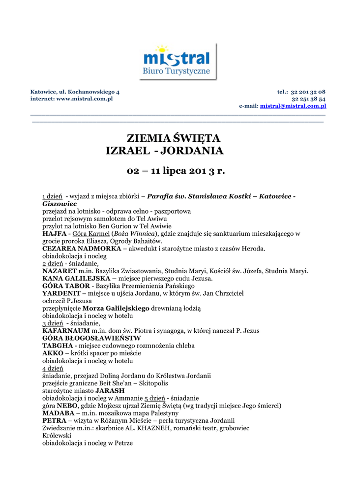 Katowice, ul. Kochanowskiego 4 internet: www.mistral.com.pl tel.: 32 201 32 08 32 251 38 54 e-mail: [email protected] ______________________________________________________________________________ _____________________________________________________________________________ ZIEMIA ŚWIĘTA IZRAEL - JORDANIA 02 – 11 lipca 201 3 r. 1 dzień - wyjazd z miejsca zbiórki – Parafia św. Stanisława Kostki – Katowice Giszowiec przejazd na lotnisko - odprawa celno - paszportowa przelot rejsowym samolotem do Tel Awiwu przylot na lotnisko Ben Gurion w Tel Awiwie HAJFA - Góra Karmel (Boża Winnica), gdzie znajduje się sanktuarium mieszkającego w grocie proroka Eliasza, Ogrody Bahaitów. CEZAREA NADMORKA – akwedukt i starożytne miasto z czasów Heroda. obiadokolacja i nocleg 2 dzień - śniadanie, NAZARET m.in. Bazylika Zwiastowania, Studnia Maryi, Kościół św. Józefa, Studnia Maryi. KANA GALILEJSKA – miejsce pierwszego cudu Jezusa. GÓRA TABOR - Bazylika Przemienienia Pańskiego YARDENIT – miejsce u ujścia Jordanu, w którym św. Jan Chrzciciel ochrzcił P.Jezusa przepłynięcie Morza Galilejskiego drewnianą łodzią obiadokolacja i nocleg w hotelu 3 dzień - śniadanie, KAFARNAUM m.in. dom św. Piotra i synagoga, w której nauczał P. Jezus GÓRA BŁOGOSŁAWIEŃSTW TABGHA - miejsce cudownego rozmnożenia chleba AKKO – krótki spacer po mieście obiadokolacja i nocleg w hotelu 4 dzień śniadanie, przejazd Doliną Jordanu do Królestwa Jordanii przejście graniczne Beit She’an – Skitopolis starożytne miasto JARASH obiadokolacja i nocleg w Ammanie 5 dzień - śniadanie góra NEBO, gdzie Mojżesz ujrzał Ziemię Świętą (wg tradycji miejsce Jego śmierci) MADABA – m.in. mozaikowa mapa Palestyny PETRA – wizyta w Różanym Mieście – perła turystyczna Jordanii Zwiedzanie m.in.: skarbnice AL. KHAZNEH, romański teatr, grobowiec Królewski obiadokolacja i nocleg w Petrze 6 dzień - śniadanie Przejazd DOLINĄ JORDANU do JERYCHA –najstarszego i najniżej położonego miasta świata, wjazd kolejką linową na GÓRĘ KUSZENIA (fakultatywnie 10 USD), miejsce chrztu Jezusa w rzece Jordan. QUMRAN – miejsce odnalezienia zwojów Pisma Św. Wypoczynek nad MORZEM MARTWYM. obiadokolacja i nocleg w hotelu. 7 dzień - śniadanie BETLEJEM m.in. Bazylika Narodzenia z Grotą Narodzenia, Grota Mleczna JEROZOLIMA - m.in. Wieczernik, Grób Króla Dawida, kościół Zaśnięcia NMP, Ściana Płaczu. BETANIA – miejsce, gdzie Jezus wskrzesił Łazarza. obiadokolacja i nocleg w Betlejem 8 dzień - śniadanie, JEROZOLIMA - m.in. Kaplica Wniebowstąpienia, Kościół Ojcze Nasz, Kaplica Dominius Flevit, Bazylika Konania, Ogrody Getsemani, Ogród Oliwny, Droga Krzyżowa Via Dolorosa, Bazylika Grobu Świętego. obiadokolacja i nocleg w Betlejem 9 dzień - śniadanie, EIN KAREM – miejsce narodzenia św. Jana Chrzciciela - Bazylika św. Jana, Kościół Nawiedzenia JEROZOLIMA – Muzeum Holocaust Yad Vashem, Kneset, Menora, dzielnica rządowa. obiadokolacja i nocleg w Betlejem 10 dzień - śniadanie, transfer na lotnisko Ben Gurion w Tel Awiwie przelot samolotem rejsowym transfer z lotniska na miejsce zbiórki powrót na miejsce zbiórki – Katowice - Giszowiec Cena: 4.190,- zł obejmuje: - bilety lotnicze; - transfery na i z lotniska; - opieką pilota; - zakwaterowanie w pokojach 2-osobowych; - śniadania i obiadokolacje; - przejazdy klimatyzowanym autokarem na terenie Izraela i Jordanii; - opiekę polskiego przewodnika; - opłaty wstępów wg programu; - rejs statkiem po Jeziorze Galilejskim; - ubezpieczenie NW i KL; - wizę jordańską. Uwaga: Prosimy o przeznaczenie kwoty 60 USD na napiwki dla miejscowych przewodników, kierowców oraz obsługi hotelowej. Do wjazdu na teren Izraela niezbędny jest paszport ważny co najmniej 6 miesięcy od daty wyjazdu. Serdecznie zapraszamy !