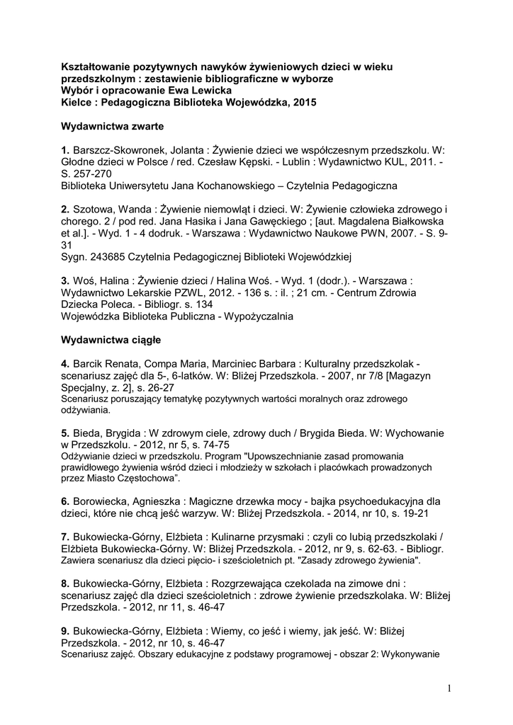 Kształtowanie pozytywnych nawyków żywieniowych dzieci w wieku przedszkolnym : zestawienie bibliograficzne w wyborze Wybór i opracowanie Ewa Lewicka Kielce : Pedagogiczna Biblioteka Wojewódzka, 2015 Wydawnictwa zwarte 1. Barszcz-Skowronek, Jolanta : Żywienie dzieci we współczesnym przedszkolu. W: Głodne dzieci w Polsce / red. Czesław Kępski. - Lublin : Wydawnictwo KUL, 2011. S. 257-270 Biblioteka Uniwersytetu Jana Kochanowskiego – Czytelnia Pedagogiczna 2. Szotowa, Wanda : Żywienie niemowląt i dzieci. W: Żywienie człowieka zdrowego i chorego. 2 / pod red. Jana Hasika i Jana Gawęckiego ; [aut. Magdalena Białkowska et al.]. - Wyd. 1 - 4 dodruk. - Warszawa : Wydawnictwo Naukowe PWN, 2007. - S. 931 Sygn. 243685 Czytelnia Pedagogicznej Biblioteki Wojewódzkiej 3. Woś, Halina : Żywienie dzieci / Halina Woś. - Wyd. 1 (dodr.). - Warszawa : Wydawnictwo Lekarskie PZWL, 2012. - 136 s. : il. ; 21 cm. - Centrum Zdrowia Dziecka Poleca. - Bibliogr. s. 134 Wojewódzka Biblioteka Publiczna - Wypożyczalnia Wydawnictwa ciągłe 4. Barcik Renata, Compa Maria, Marciniec Barbara : Kulturalny przedszkolak scenariusz zajęć dla 5-, 6-latków. W: Bliżej Przedszkola. - 2007, nr 7/8 [Magazyn Specjalny, z. 2], s. 26-27 Scenariusz poruszający tematykę pozytywnych wartości moralnych oraz zdrowego odżywiania. 5. Bieda, Brygida : W zdrowym ciele, zdrowy duch / Brygida Bieda. W: Wychowanie w Przedszkolu. - 2012, nr 5, s. 74-75 Odżywianie dzieci w przedszkolu. Program "Upowszechnianie zasad promowania prawidłowego żywienia wśród dzieci i młodzieży w szkołach i placówkach prowadzonych przez Miasto Częstochowa”. 6. Borowiecka, Agnieszka : Magiczne drzewka mocy - bajka psychoedukacyjna dla dzieci, które nie chcą jeść warzyw. W: Bliżej Przedszkola. - 2014, nr 10, s. 19-21 7. Bukowiecka-Górny, Elżbieta : Kulinarne przysmaki : czyli co lubią przedszkolaki / Elżbieta Bukowiecka-Górny. W: Bliżej Przedszkola. - 2012, nr 9, s. 62-63. - Bibliogr. Zawiera scenariusz dla dzieci pięcio- i sześcioletnich pt. "Zasady zdrowego żywienia". 8. Bukowiecka-Górny, Elżbieta : Rozgrzewająca czekolada na zimowe dni : scenariusz zajęć dla dzieci sześcioletnich : zdrowe żywienie przedszkolaka. W: Bliżej Przedszkola. - 2012, nr 11, s. 46-47 9. Bukowiecka-Górny, Elżbieta : Wiemy, co jeść i wiemy, jak jeść. W: Bliżej Przedszkola. - 2012, nr 10, s. 46-47 Scenariusz zajęć. Obszary edukacyjne z podstawy programowej - obszar 2: Wykonywanie 1 czynności samoobsługowych, obszar 5: Wychowanie zdrowotne i kształtowanie sprawności fizycznej dzieci. Dbałość o zdrowie. Grupa wiekowa - pięciolatki, sześciolatki. 10. Butor, Nina : Jestem bezpieczny, bo wiem... co jem! : scenariusz zajęć dla grupy cztero- i pięciolatków. W: Bliżej Przedszkola. - 2013, nr 6, s. 52-55 Doktor Witaminka. Temat dnia: Witaminkowa wyprawa. Temat dnia: Miś Łakomczuch. Temat dnia: Jedzeniowe wędrówki. Temat dnia: Wiemy, że zdrowo jemy. 11. Charzewska Jadwiga, Chojnowska Zofia : Zasady zdrowego żywienia / Jadwiga Charzewska, Zofia Chojnowska. W: Wychowanie w Przedszkolu. - 2012, nr 10, s. 24-28. - Bibliogr. 12. Chrapońska Urszula, Leszczyńska Agnieszka, Paryż Izabela : Chcę być silny i zdrowy / Urszula Chrapońska, Agnieszka Leszczyńska, Izabela Paryż. W: Wychowanie w Przedszkolu . - 2012, nr 8, s. 46-48 Przedszkole integracyjne. Konkurs wiedzy o zdrowiu. Sposób odżywiania się. 13. Dmitruk-Sierocińska, Katarzyna : O wyższości jabłka i gry w piłkę nad życiem kanapowca ...czyli słów kilka o wychowaniu prozdrowotnym. W: Bliżej Przedszkola. 2011, nr 7/8, s. 18-19 Sposoby na właściwe kształtowanie nawyków prozdrowotnych u małych dzieci. 14. Fall-Ławryniuk, Maria : Smacznie, zdrowo i w przedszkolu. W: Bliżej Przedszkola. - 2009, nr 6, s. 40-41 Prawidłowe żywienie dziecka w wieku przedszkolnym (zbilansowany posiłek, częstotliwość spożywania pokarmów, sposób podawania posiłków). 15. Gawlik Karolina, Grzesik Karolina : Wiem, że zdrowo jem : scenariusz zajęć dla dzieci trzy-, czteroletnich. W: Bliżej Przedszkola. - 2012, nr 5, s. 100 16. Gąsienica, Gabriela : Magiczne drzewka mocy - zabawy i zadania do bajki terapeutycznej. W: Bliżej Przedszkola. - 2014, nr 10, s. 22-23 17. Gorajska Aneta, Zielińska Elżbieta : Jak dbać o zdrowie? W: Bliżej Przedszkola. - 2011, nr 7/8, s. 136-137 Scenariusz turnieju wiedzy o zdrowiu dla najmłodszych dotyczący dbania o swoje zdrowie. 18. Góra, Dominika : Wiem, co jem! : scenariusz zajęć dydaktycznych dla cztero-, pięciolatków. W: Bliżej Przedszkola. - 2013, nr 12, s. 28-29 19. Górecka, Aldona : Kolorowe dni w naszym przedszkolu. W: Wychowanie na Co Dzień. - 2004, nr 10/11, s. XII Propozycja cyklu zajęć w przedszkolu propagująca dietę bogatą w warzywa i owoce. 20. Groele, Barbara, Krauze Mikołaj : Porcja na każdą porę dnia. W: Bliżej Przedszkola. - 2010, nr 4, s. 37 Zbilansowane posiłki w dziennej diecie dziecka w wieku przedszkolnym. 2 21. Groele, Barbara, Krauze Mikołaj : Pyszny i zdrowy duet. W: Bliżej Przedszkola. - 2010, nr 3, s. 46 Prawidłowe żywienie dzieci. Sposoby zachęcenia dzieci w przedszkolu do zdrowego odżywiania. 22. Groele Barbara, Krauze Mikołaj : Witaminowe zabawy : czyli patent na zdrowe odżywianie. W: Bliżej Przedszkola. - 2010, nr 2, s. 46 Porady jak wyrobić w dziecku zdrowe nawyki żywieniowe. 23. Jabłońska, Jolanta : Wspólne gotowanie - zdrowa pizza. W: Wychowanie w Przedszkolu. - 2014, nr 1, s. 46-48 Dzieci przedszkolne przygotowują danie razem z mamami. 24. Jedz dużo witamin, rób zdrowe zapasy - przygotuj się dobrze na zimowe czasy! W: Bliżej Przedszkola. - 2015, nr 9, s. 69-75 Propozycje aktywności pomocne w trakcie planowania pracy wychowawczo-dydaktycznej dla dzieci starszych na miesiąc październik.Wdrażanie dzieci do rozpoznawania i nazywania charakterystycznych cech pór roku oraz zmian zachodzących w przyrodzie. Zasady zdrowego odżywiania się. Konspekt zajęć