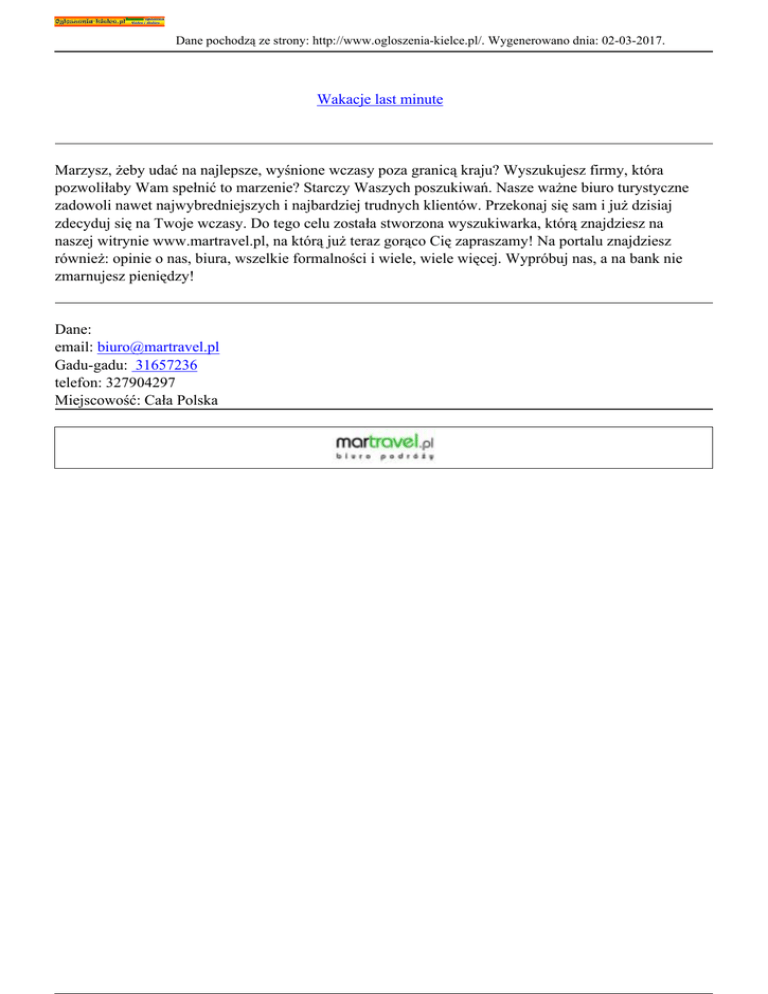 Dane pochodzą ze strony: http://www.ogloszenia-kielce.pl/. Wygenerowano dnia: 02-03-2017. Wakacje last minute Marzysz, żeby udać na najlepsze, wyśnione wczasy poza granicą kraju? Wyszukujesz firmy, która pozwoliłaby Wam spełnić to marzenie? Starczy Waszych poszukiwań. Nasze ważne biuro turystyczne zadowoli nawet najwybredniejszych i najbardziej trudnych klientów. Przekonaj się sam i już dzisiaj zdecyduj się na Twoje wczasy. Do tego celu została stworzona wyszukiwarka, którą znajdziesz na naszej witrynie www.martravel.pl, na którą już teraz gorąco Cię zapraszamy! Na portalu znajdziesz również: opinie o nas, biura, wszelkie formalności i wiele, wiele więcej. Wypróbuj nas, a na bank nie zmarnujesz pieniędzy! Dane: email: [email protected] Gadu-gadu: 31657236 telefon: 327904297 Miejscowość: Cała Polska