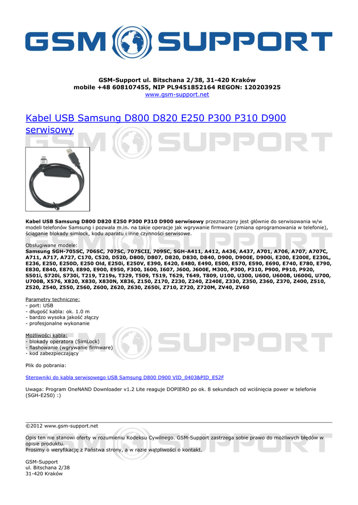 GSM-Support ul. Bitschana 2/38, 31-420 Kraków mobile +48 608107455, NIP PL9451852164 REGON: 120203925 www.gsm-support.net Kabel USB Samsung D800 D820 E250 P300 P310 D900 serwisowy Kabel USB Samsung D800 D820 E250 P300 P310 D900 serwisowy przeznaczony jest głównie do serwisowania w/w modeli telefonów Samsung i pozwala m.in. na takie operacje jak wgrywanie firmware (zmiana oprogramowania w telefonie), ściąganie blokady simlock, kodu aparatu i inne czynności serwisowe. Obsługiwane modele: Samsung SGH-705SC, 706SC, 707SC, 707SCII, 709SC, SGH-A411, A412, A436, A437, A701, A706, A707, A707C, A711, A717, A727, C170, C520, D520, D800, D807, D820, D830, D840, D900, D900E, D900i, E200, E200E, E230L, E236, E250, E250D, E250 Old, E250i, E250V, E390, E420, E480, E490, E500, E570, E590, E690, E740, E780, E790, E830, E840, E870, E890, E900, E950, F300, I600, I607, J600, J600E, M300, P300, P310, P900, P910, P920, S501i, S720i, S730i, T219, T219s, T329, T509, T519, T629, T649, T809, U100, U300, U600, U600B, U600G, U700, U700B, X576, X820, X830, X830N, X836, Z150, Z170, Z230, Z240, Z240E, Z330, Z350, Z360, Z370, Z400, Z510, Z520, Z540, Z550, Z560, Z600, Z620, Z630, Z650i, Z710, Z720, Z720M, ZV40, ZV60 Parametry techniczne: - port: USB - długość kabla: ok. 1.0 m - bardzo wysoka jakość złączy - profesjonalne wykonanie Możliwości kabla: - blokady operatora (SimLock) - flashowanie (wgrywanie firmware) - kod zabezpieczający Plik do pobrania: Sterowniki do kabla serwisowego USB Samsung D800 D900 VID_0403&PID_E52F Uwaga: Program OneNAND Downloader v1.2 Lite reaguje DOPIERO po ok. 8 sekundach od wciśnięcia power w telefonie (SGH-E250) :) ©2012 www.gsm-support.net Opis ten nie stanowi oferty w rozumieniu Kodeksu Cywilnego. GSM-Support zastrzega sobie prawo do możliwych błędów w opisie produktu. Prosimy o weryfikację z Państwa strony, a w razie wątpliwości o kontakt. GSM-Support ul. Bitschana 2/38 31-420 Kraków POLSKA tel. 608107455 e-mail: [email protected] Powered by TCPDF (www.tcpdf.org)