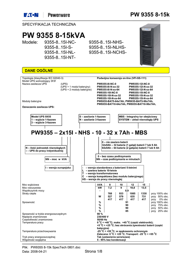 PW 9355 8-15k SPECYFIKACJA TECHNICZNA PW 9355 8-15kVA Modele: 9355-8..15I-NC9355-8..15I-S9355-8..15I-NL9355-8..15I-NT- 9355-8..15I-NHS9355-8..15I-NLHS9355-8..15I-NCHS- DANE OGÓLNE Topologia (klasyfikacja IEC 62040-3) Model UPS wolnostojący 3f/3f Nazwa zasilacza UPS (UPS) (UPS + 1 moduł bateryjny) (UPS + 2 moduły bateryjne) Moduły bateryjne Podwójna konwersja on-line (VFI-SS-111) PW9355-8I-NC-0 PW9355-12I-NC-0 PW9355-8I-N-xx-32 PW9355-12I-N-xx-32 PW9355-8I-N-xx-64 PW9355-12I-N-xx-64 PW9355-10I-NC-0 PW9355-15I-NC-0 PW9355-10I-N-xx-32 PW9355-15I-N-xx-32 PW9355-10I-N-xx-64 PW9355-15I-N-xx-64 PW9X55-BAT5-64x7Ah, PW9X55-BAT5-96x7Ah, PW9X55-BAT10-64x7Ah, PW9X55-BAT10-96x7Ah, Oznaczenie zasilacza UPS: Model UPS 9X55 1 – wyjście 1-fazowe 3 – wyjście 3-fazowe S – zasilanie 1-fazowe N – zasilanie 3-fazowe MBS - Integralny tor obejściowy SYSTEM – układ równoległy UPS PW9355 – 2x15I - NHS - 10 - 32 x 7Ah - MBS 0 – nie zawiera baterii 32x9Ah – 32 baterie (1 gałąź) baterii 7 lub 9 Ah 64x9Ah – 64 baterie (2 gałęzie) baterii 7 lub 9 Ah N – ilość jednostek równoległych -- - UPS do pracy indywidualnej NN – moc w kVA I – wersja europejska Moc wyjściowa Moc rzeczywista Współczynnik mocy Straty ciepła 0 – bez czasu podtrzymania NN – czas podtrzymania w minutach - – wersja standardowa z bateriami 5-letnimi L – zawiera baterie 10-letnie T – wersja transformatorowa C – wersja kompaktowa (bez modułu bateryjnego) HS – wersja do pracy równoległej kVA kW W Sprawność Sprawność w trybie energooszczędnym Napięcie znamionowe Częstotliwość znamionowa Temperatura pracy Temperatura przechowywania Tryb pracy energooszczędnej Wilgotność względna Plik: PW9355 8-15k SpecTech 0801.doc Data: 2008-04-21 8 7,2 10 9 768 527 417 933 579 417 12 10,8 15 13,5 1085 635 417 1330 731 417 0,9 przy 100% obc przy 50% obc. przy 0% obc przy 100% obc. przy 75% obc. przy 50% obc. przy 25% obc % 91 % 90 % 90 % 85 98 % 230/400 V 50/60 Hz 0 0 0 0 C ÷ +40 C; maks. +45 C (część elektroniki); 0 0 +5 C ÷ +25 C; bez skrócenia żywotności baterii (część bateryjna) 0 0 -25 C ÷ +55 C; w opakowaniu ochronnym 0 0 0 0 Zalecana: 0 C ÷ +25 C; Transport: -25 C ÷ +55 C Tak (ustawienia serwisowe) 5 - 95% bez kondensacji Strona 1/8 PW 9355 8-15k Wysokość pracy n.p.m. Poziom hałasu w odl. 1 m Stopień ochrony (EN60529) Kolor Typ połączeń zasilających Znaki bezpieczeństwa Standardy EMC (odporność, emisja) Wibracje ® Technologia ABM przedłużająca żywotność baterii do 50% Opatentowana technologia Hot Sync Maksymalna liczba modułów pracujących równolegle MTTR (czas naprawy) MTBF (MIL 217) Bypass serwisowy Zawartość standardowej dostawy ≤ 1000 m; maksymalnie 2000 m ze zmniejszeniem mocy o 1% na każde +100 m ≤ 50 dBA (pomieszczenie dźwiękochłonne) ≤ 55 dBA (praca bateryjna) IP20 Czarny RAL 9005 Stałe (listwa zaciskowa) CE, GOST IEC/EN 62040-1-1, IEC/EN 62040-1-1, EN 60950 IEC/EN 62040-2, klasa A 2 Maks. 0,3 mm (2 ÷ 9 Hz), maks. 1 m/s (9 ÷ 200 Hz) sinusoidalne Tak Tak (dla systemów równoległych) 4 < 30 min. 150 000 h Tak (opcja) UPS, instrukcja obsługi, 1 kabel szeregowy RS-232, Oprogramowanie Software Suite (CD) PARAMETRY ELEKTRYCZNE - WEJŚCIOWE Napięcie znamionowe prostownika / toru obejściowego Tolerancja napięcia prostownika 3 x 230/400 V 175/305 – 276/480 V (± 20%) przy obciążeniu 100% 115/200 – 276/480 V (-50 %, +20%) przy obciążeniu 50% 196/340 – 253/438 V (-15 %, +10%) 45 – 65 Hz (50 lub 60 Hz ± 5Hz) 3F + PE – wejście prostownika; 3F + N + PE – wejście toru obejściowego kVA 8 10 12 15 A 11,6 14,5 17,4 21,8 A 29 29 29 29 < 5% THDi < 3% THDi przy zniekształceniach napięcia VHD < 1% 0,99 < 100% prądu znamionowego Tolerancja napięcia toru obejściowego Tolerancja częstotliwości Liczba faz Moc znamionowa Prąd znamionowy Prąd maksymalny Odkształcenia prądu wejściowego przy jego wartości znamionowej Wejściowy współczynnik mocy Prąd rozruchowy PARAMETRY ELEKTRYCZNE – WYJŚCIOWE Kształt napięcia (praca normalna) Kształt napięcia (praca autonomiczna) Czas przełączenia z trybu normalnego na bateryjny Czas przerywania / czas załączania Liczba faz Sinusoidalny Sinusoidalny Bez przerwy (0 ms) Bez przerwy (0 ms) 3 Fazy PRACA NORMALNA Napięcie znamionowe Zakres zmian napięcia Częstotliwość znamionowa Wahania częstotliwości Błąd przesunięcia fazowego przy synchronizacji podczas zmiany rodzaju pracy Moc pozorna Moc rzeczywista (obciążenie liniowe) Moc rzeczywista (obciążenie wzorcowe nieliniowe); wsp. mocy=0,9 Moc rzeczywista (obciążenie wzorcowe nieliniowe); wsp. mocy=0,7 Całkowite odkształcenia napięcia (obciążenie liniowe) Całkowite odkształcenia napięcia (obciążenie wzorcowe nieliniowe) Napięcia poszczególnych harmonicznych Zdolność zwarciowa Zdolność przeciążeniowa (bez dostępnego bypassu) Dopuszczalny zakres współczynnika mocy przy obciążeniu liniowym Plik: PW9355 8-15k SpecTech 0801.doc Data: 2008-04-21 230/400 V (domyślnie), 220/380 V lub 240/415 V ± 3 V napięcia nominalnego 50 Hz(domyślnie) lub 60 Hz ±2 (domyślnie), ±0.5, lub ±1 Hz z prędkością narastania 1 Hz/s (domyślnie), 7 Hz/s, 3 Hz/s, 2 Hz/s, lub ±0.5 Hz/s Maksymalnie 8 stopni kVA kW 8 7,2 10 9 12 10,8 15 13,5 kW 7,2 9 10,8 13,5 kW 5,6 7 8,4 10,5 < 3% < 5% Patrz oddzielna deklaracja 55 A, maks. 300 ms > 100…110% obciążenia przez 10 min. > 110…125% obciążenia przez 1 min. > 125…150% obciążenia przez 5 s 0,7 ind. ÷ 0,9 poj. Strona 2/8 PW 9355 8-15k Liczba faz wyjściowych Asymetria napięcia wyjściowego przy wzorcowym obciążeniu asymetrycznym Maksymalna zmiana kąta fazowego Zmiana napięcia wyjściowego podczas przełączania z pracy normalnej na pracę z energii zmagazynowanej i vice versa Zmiana napięcia wyjściowego przy zmianach obciążenia Maksymalna szybkość zmian częstotliwości wyjściowej PRACA AUTONOMICZNA Napięcie znamionowe Zakres zmian napięcia Wartoś