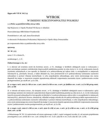 Sygn.akt VII K 767/13 WYROK W IMIENIU RZECZYPOSPOLITEJ POLSKIEJ 1.1.Dnia 14 października 2014 roku Sąd Rejonowy w Opolu Wydział VII Karny w składzie: Przewodniczący SSR Hubert Frankowski Protokolant st .sek. sąd. Anna Kowalczyk w obecności Prokuratora Prokuratury Rejonowej w Opolu Alicja Domaradzka po rozpoznaniu dnia 14 października 2014 roku sprawy W. W. (1), syna J. i S. z domu K., urodzonego (...), U. Oskarżonego o to, że: I. w okresie od września 2006 do kwietnia 2010r., w O., działając w krótkich odstępach czasu w wykonaniu z góry powziętego zamiaru wielokrotnie doprowadził małoletnią poniżej 15 roku życia A. A. (1) do wykonania innych czynności seksualnych w ten sposób, że dotykał w/w pokrzywdzoną po całym ciele, w szczególności w miejscach intymnych tj., piersiach, kroczu, a także obnażał się, oraz prezentował w/w pokrzywdzonej wykonanie czynności seksualnej w postaci własnej masturbacji, w celu zaspokojenia seksualnego, przy czym zarzucanego mu czynu dopuścił się mając w znacznym stopniu ograniczoną zdolność rozpoznania znaczenia czynu i pokierowania swoim postępowaniem, po myśli art. 31 § 2 kk, tj. o czyn z art. 200 § 1 kk w zw. z art. 200 § 2 kk w zw. z art. 31 §2kkw zw. z art. 11 § 2 kk przy zast. art. 12 kk II. w okresie od marca 2012r., do sierpnia 2012r., w O., działając w krótkich odstępach czasu w wykonaniu z góry powziętego zamiaru nie mniej niż z pięciokrotnie doprowadził małoletnią poniżej 15 roku życia A. A. (1) do wykonania innych czynności seksualnych w ten sposób, że dotykał w/w pokrzywdzoną po całym ciele, w szczególności w miejscach intymnych tj., piersiach, kroczu, obnażał się, wkładał swojego członka do ust pokrzywdzonej,a także zaprezentował w/ w pokrzywdzonej wykonanie czynności seksualnej w postaci własnej masturbacji, w celu zaspokojenia seksualnego, przy czym zarzucanego mu czynu dopuścił się mając w znacznym stopniu ograniczoną zdolność rozpoznania znaczenia czynu i pokierowania swoim postępowaniem, po myśli art. 31 § 2 kk, tj. o czyn z art. 200 § 1 kk w zw. z art. 200 § 2 kk w zw. z art. 31 § 2 kk w zw. z art. 11 § 2 kk przy zast. art. 12 kk 1.Oskarżonego W. W. (1) uniewinnia od czynu opisanego w pkt I. części wstępnej wyroku, tj. od zarzutu popełnienia przestępstwa z art. 200§1 kk w zw. z art. 200§4 kk w zw. Z art. 31§2 kk w zw. Z art.11§2 kk i art. 12 kk , 2. Oskarżonego W. W. (1) uznaje winnym czynu opisanego w pkt II. części wstępnej wyroku z tym , że czyn ten kwalifikuje z art. 200§1 kk w zw. z art. 200§4 kk przy zast. art. 11§2 kk i art. 31 §2 kk i art. 12 kk i za to przestępstwo na podstawie art. 200§1 kk przy zast. art. 11§3 kk wymierza mu karę 2 ( dwóch) lat pozbawienia wolności , 3. na podst. art. 69 § 1 i 2 kk i art. 70 § 1 pkt 1 kk wykonanie orzeczonej w pkt 2. Sentencji wyroku kary pozbawienia wolności warunkowo zawiesza oskarżonemu na okres próby 4 ( czterech) lat , 4. na podst. Art. 71§1 kk orzeka wobec oskarżonego grzywnę w wymiarze 100 ( stu) stawek dziennych ustalając wysokość dziennej stawki na kwotę 10 ( dziesięć) złotych, 5. na podst. Art. 41a §1 kk orzeka wobec oskarżonego środek karny w postaci zakazu kontaktowania się bez zgody Sądu z pokrzywdzona A. A. (1) na okres 4 ( czterech) lat 6. na podst. art. 627 kpk zasądza od oskarżonego na rzecz Skarbu Państwa tytułem opłat od orzeczonych kar pozbawienia wolności i grzywny kwotę 400 złotych zwalniając oskarżonego na podst. Art. 624 §1 Kpk od ponoszenia wydatków poniesionych w toku postępowania , którymi obciąża Skarb Państwa. UZASADNIENIE Sąd Rejonowy ustalił w sprawie co następuje: Małoletnia A. A. (1) urodziła się (...) we W.. Wyżej wymieniona jest córką N. A. (ojciec nie jest znany). Matka małoletniej A. A. (1) funkcjonowała w kilku nieformalnych związkach, z których posiada ośmioro dzieci, przy czym nad żadnych dzieckiem, oprócz małoletniej A., N. A. nie sprawowała bezpośredniej opieki. Rodzeństwo A. A. (1) wychowywało się w warunkach placówek opiekuńczo – wychowawczych lub też rodzin zastępczych. Początkowo N. A. wraz z córką zamieszkiwały w Schronisku dla Samotnych Matek we W., po czym wyżej wymienione, po uprzednich pobytach w G., Ż. oraz w Schronisku (...) w W. k/P., przeniosły się do O. i zamieszkały w mieszkaniu położonym przy ulicy (...), należącym do wujka N. A. – R. K.. Przedmiotowe mieszkanie składało się z 2 pokoi, kuchni oraz łazienki, przy czym N. A. wraz z córką zajmowały jeden mały pokój, który był ciemny, brudny i zagracony. Małoletnia A. A. (1) razem z matką spały na materacu, w brudnej pościeli. Dodatkowo mieszkanie to nie było sprzątane, zaś w powietrzu unosił się fetor. W tym też czasie do opisanego powyżej mieszkania przychodził znajomy R. W. W.. Wyżej wymieniony wielokrotnie przynosił naówczas kilkuletniej A. A. (1) słodycze. W. W. (1) nie zostawał jednak sam na sam z małoletnią A. A. (1). Wyżej wymieniony nie zabierał także A. A. (1) poza miejsce jej zamieszkania. Zdarzały się natomiast sytuacje, w których po przyjściu W. W. (1) do mieszkania położonego w O. przy ulicy (...) A. A. (1), bądź to z własnej inicjatywy bądź z inicjatywy W. W. (1), którego nazywała „wujkiem”, siadała mu na kolanach, przy czym w tym też czasie wyżej wymieniony nie dotykał małoletniej A. A. (1), a ta takiemu traktowaniu się nie sprzeciwiała. Małoletnia A. A. (1) pozostawała pod opieką matki do 6 roku życia, po czym uczęszczała ona do przedszkola realizując program klasy zerowej. Wyżej wymieniona rozpoczęła naukę szkolną w 7 roku życia. A. A. (1) początkowo nie miała problemów z nauką, przy czym wygląd zewnętrzny małoletniej oraz jej higiena osobista budziły niepokój nauczycieli oraz stanowiły źródło niewłaściwego traktowania przez rówieśników. W tym też czasie kolegą małoletniej A. A. (1) był Ł