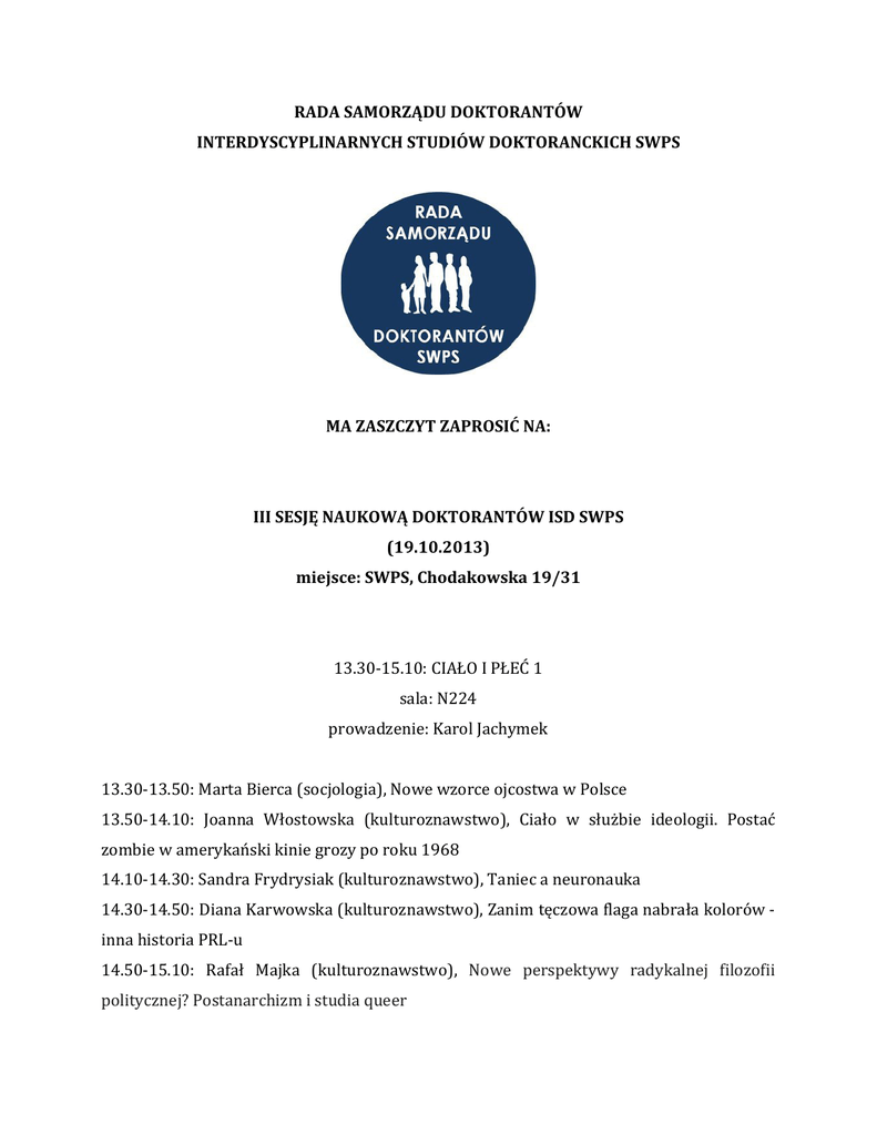 RADA SAMORZĄDU DOKTORANTÓW INTERDYSCYPLINARNYCH STUDIÓW DOKTORANCKICH SWPS MA ZASZCZYT ZAPROSIĆ NA: III SESJĘ NAUKOWĄ DOKTORANTÓW ISD SWPS (19.10.2013) miejsce: SWPS, Chodakowska 19/31 13.30-‐15.10: CIAŁO I PŁEĆ 1 sala: N224 prowadzenie: Karol Jachymek 13.30-‐13.50: Marta Bierca (socjologia), Nowe wzorce ojcostwa w Polsce 13.50-‐14.10: Joanna Włostowska (kulturoznawstwo), Ciało w służbie ideologii. Postać zombie w amerykański kinie grozy po roku 1968 14.10-‐14.30: Sandra Frydrysiak (kulturoznawstwo), Taniec a neuronauka 14.30-‐14.50: Diana Karwowska (kulturoznawstwo), Zanim tęczowa flaga nabrała kolorów -‐ inna historia PRL-‐u 14.50-‐15.10: Rafał Majka (kulturoznawstwo), Nowe perspektywy radykalnej filozofii politycznej? Postanarchizm i studia queer 13.30-‐15.10: POLITYKA, HISTORIA, SPOŁECZEŃSTWO 1 sala: N225 prowadzenie: Michał Boczek 13.30-‐13.50: Agnieszka Kaim (socjologia), Polityka grantowa a relacje między organizacjami pozarządowymi 13.50-‐14.10: Milena Drzewiecka (psychologia), Preferencje wyborców wobec typu przywództwa politycznego według koncepcji Golemana: Badania porównawcze w Polsce i Szwajcarii 14.10-‐14.30: Michał Boczek (prawo), Obowiązek alimentacyjny i pojęcie niealimentacji w polskim prawie karnym 14.30-‐14.50: Mariusz Stupak (prawo), Problematyka przestępstw nieuprawnionego prowadzenia działalności gospodarczej 14.50-‐15.10: Mariusz Jakubik (prawo), Sprawowanie wymiaru sprawiedliwości w sprawach karnych przez obywateli jako wartość procesowa 13.30-‐15.10: MEDIA I POPKULTURA 1 sala: N226 prowadzenie: Joanna Jeśman 13.30-‐13.50: Joanna Jeśman (kulturoznawstwo), Sztuka DNA, czyli kwas deoksyrybonukleinowy jako nośnik pamięci 13.50-‐14.10: Agata Pasikowska (psychologia), Dialog z wyobrażonym i wirtualnym rozmówcą jako forma wsparcia w radzeniu sobie w stresujących sytuacjach 14.10-‐14.30: Weronika Lewandowska (kulturoznawstwo), Przeobrażenia ciała – wędrówka śladami hybrydycznych form i przestrzeni 14.30-‐14.50: Magdalena Grabarczyk-‐Tokaj (socjologia), Prosument w internecie – w jaki sposób działania w social media wpływają na decyzje korporacji. Próba charakterystyki zjawiska 14.50-‐15.10: Anna Dąbrowska (kulturoznawstwo), Netnografia czyli metoda badań internetowych 13.30-‐15.10: EGZYSTENCJA, EMOCJE, PROBLEMY 1 sala: N227 prowadzenie: Dorota Wysok 13.30-‐13.50: Maria Kryńska (psychologia), Postawy wobec Innego w zależności od dystansu kulturowego i języka 13.50-‐14.10: Jędrzej Sudnikowicz (kulturoznawstwo), Od prawdy do użycia – struktura języka jako narzędzie obosieczne 14.10-‐14.30: Beata Piskor-‐Świerad (psychologia), Wpływ narratyzacji wypalenia zawodowego na konstruktywność podejmowanych działań i poczucie jakości życia 14.30-‐14.50: Marta Jaroszewska (psychologia), Czy poznawcze zdolności do radzenia sobie z emocjami mogą być rozwijane dzięki metodzie narratyzacji? 14.50-‐15.10: Mariola Dobrołowicz-‐Konkol (psychologia), Styl narracji a sposób rozwiązywania problemów organizacyjnych 15.10-‐15.40: SESJA POSTEROWA miejsce: korytarz przy salach N224, N225, N226, N227 1. Aleksandra Gradowska (psychologia), Czy warto pisać pamiętniki? Wpływ narracyjnej interpretacji ważnych wyzwań życiowych na jakość życia 2. Aneta Sobol-‐Mikołajczak (psychologia), Podejmowanie decyzji z „adaptacyjnym przybornikiem”. Specjaliści a strategie w podejmowaniu decyzji rekrutacyjnych 3. Anna Małyszko (kulturoznawstwo), Apetyczny czy estetyczny? Pokarm jako przedmiot procesów estetyzacji codzienności 4. Klara Rydzewska (psychologia), The Interaction of Aging and Depression on Impairment of Sequential Decision Making 5. Mariusz Lutkowski (prawo), Przewłaszczenie na zabezpieczenie nieruchomości 6. Monika Rupińska (psychologia), Dehumanizacja grup zawodowo związanych z seksualnością 7. Liliana Naumik (psychologia), Wpływ lęku przed śmiercią na orientację temporalną i zachowania prozdrowotne 8. Dominika Ćwierzyńska (kulturoznawstwo), Ty 9. Aleksander Wasiak-‐Radoszewski (socjologia), Trajektoria stawania się osobą homoseksualną w Polsce. Badania do pracy doktorskiej 10. Kamila Regin (psychologia), Sprężystość psychiczna w systemie rodzinnym 15.40-‐17.20: CIAŁO i PŁEĆ 2 sala: N224 prowadzenie: Dorota Wysok 15.40-‐16.00: Daniel Cysarz (psychologia), Czy warto jest zmieniać płeć ? – raport z badań zadowolenia z obrazu własnego ciała u osób transseksualnych typu K/M na różnych etapach terapii zmiany płci 16.00-‐16.20: Dagmara Gawron (psychologia), Wpływ niechirurgicznych zabiegów upiększających na samoocenę wizerunku ciała i nastrój u kobiet w wieku średnim 16.20-‐16.40: Mateusz Sobecki (kulturoznawstwo), Etyczne i kulturowe kwestie badań nad HIV/AIDS w Polsce 16.40-‐17.00: Marcin Obrębski (psychologia), Monitorowanie stanu psychicznego osób chorych na cukrzycę. Prezentacja Zestawu Psychodiabetologicznego 17.00-‐17.20: Natalia Liszewska (psychologia), Znaczenie praktyk rodzicielskich regulujących dietę dziecka względem masy ciała i diety dziecka. Badania diad rodzic – dziecko 15.40-‐17.40: POLITYKA, HISTORIA, SPOŁECZEŃSTWO 2 sala: N225 prowadzenie: Karol Jachymek 15.40-‐16.00: Urszula Musyl (kulturoznawstwo), Pakistańskie społeczeństwo w filmach akcji Sultana Rahi 16.00-‐16.20: Krzysztof Kasiński (kulturoznawstwo), Wielokulturowość czy asymilacja – teorie integracji etnicznej na przykładzie działalności Ku Klux Klanu i amerykańskich neo-‐ nazistów w latach 1915-‐1945 16.20-‐16.40: Łukasz Klimek (socjologia), Polscy migranci mieszkający w Irlandii, ich strategie akulturacyjne i stosunek wobec integracji 16.40-‐17.00: Grzegorz Marchwiński (kulturoznawstwo), Kanon kultury i naród w polskim dyskursie publicznym (około roku 1900). Konstrukcje, uwarunkowania, znaczenia 17.00-‐17.20: Joanna Zaniewicz (kulturoznawstwo), Rola piosenek powst