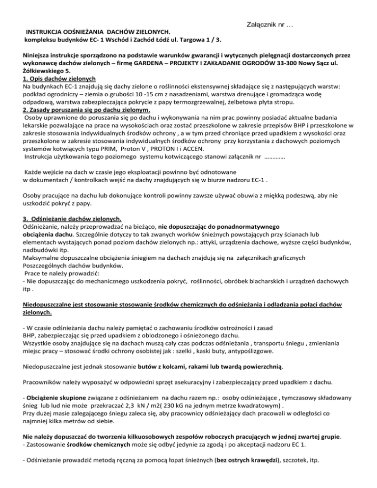 Załącznik nr … INSTRUKCJA ODŚNIEŻANIA DACHÓW ZIELONYCH. kompleksu budynków EC- 1 Wschód i Zachód Łódź ul. Targowa 1 / 3. Niniejsza instrukcje sporządzono na podstawie warunków gwarancji i wytycznych pielęgnacji dostarczonych przez wykonawcę dachów zielonych – firmę GARDENA – PROJEKTY I ZAKŁADANIE OGRODÓW 33-300 Nowy Sącz ul. Żółkiewskiego 5. 1. Opis dachów zielonych Na budynkach EC-1 znajdują się dachy zielone o roślinności ekstensywnej składające się z następujących warstw: podkład ogrodniczy – ziemia o grubości 10 -15 cm z nasadzeniami, warstwa drenujące i gromadząca wodę odpadową, warstwa zabezpieczająca pokrycie z papy termozgrzewalnej, żelbetowa płyta stropu. 2. Zasady poruszania się po dachu zielonym. Osoby uprawnione do poruszania się po dachu i wykonywania na nim prac powinny posiadać aktualne badania lekarskie pozwalające na prace na wysokościach oraz zostać przeszkolone w zakresie przepisów BHP i przeszkolone w zakresie stosowania indywidualnych środków ochrony , a w tym przed chroniące przed upadkiem z wysokości oraz przeszkolone w zakresie stosowania indywidualnych środków ochrony przy korzystania z dachowych poziomych systemów kotwiących typu PRIM, Proton V , PROTON I i ACCEN. Instrukcja użytkowania tego poziomego systemu kotwiczącego stanowi załącznik nr …………. Każde wejście na dach w czasie jego eksploatacji powinno być odnotowane w dokumentach / kontrolkach wejść na dachy znajdujących się w biurze nadzoru EC-1 . Osoby pracujące na dachu lub dokonujące kontroli powinny zawsze używać obuwia z miękką podeszwą, aby nie uszkodzić pokryć z papy. 3. Odśnieżanie dachów zielonych. Odśnieżanie, należy przeprowadzać na bieżąco, nie dopuszczając do ponadnormatywnego obciążenia dachu. Szczególnie dotyczy to tak zwanych worków śnieżnych powstających przy ścianach lub elementach wystających ponad poziom dachów zielonych np.: attyki, urządzenia dachowe, wyższe części budynków, nadbudówki itp. Maksymalne dopuszczalne obciążenia śniegiem na dachach znajdują się na załącznikach graficznych Poszczególnych dachów budynków. Prace te należy prowadzić: - Nie dopuszczając do mechanicznego uszkodzenia pokryć, roślinności, obróbek blacharskich i urządzeń dachowych itp . Niedopuszczalne jest stosowanie stosowanie środków chemicznych do odśnieżania i odladzania połaci dachów zielonych. - W czasie odśnieżania dachu należy pamiętać o zachowaniu środków ostrożności i zasad BHP, zabezpieczając się przed upadkiem z oblodzonego i ośnieżonego dachu. Wszystkie osoby znajdujące się na dachach muszą cały czas podczas odśnieżania , transportu śniegu , zmieniania miejsc pracy – stosować środki ochrony osobistej jak : szelki , kaski buty, antypoślizgowe. Niedopuszczalne jest jednak stosowanie butów z kolcami, rakami lub twardą powierzchnią. Pracowników należy wyposażyć w odpowiedni sprzęt asekuracyjny i zabezpieczający przed upadkiem z dachu. - Obciążenie skupione związane z odśnieżaniem na dachu razem np.: osoby odśnieżające , tymczasowy składowany śnieg lub lud nie może przekraczać 2,3 kN / m2( 230 kG na jednym metrze kwadratowym) . Przy dużej masie zalegającego śniegu zaleca się, aby pracownicy odśnieżający dach pracowali w odległości co najmniej kilka metrów od siebie. Nie należy dopuszczać do tworzenia kilkuosobowych zespołów roboczych pracujących w jednej zwartej grupie. - Zastosowanie środków chemicznych może się odbyć jedynie za zgodą i po akceptacji nadzoru EC 1. - Odśnieżanie prowadzić metodą ręczną za pomocą łopat śnieżnych (bez ostrych krawędzi), szczotek, itp. Nie wolno transportować śniegu po powierzchniach nieodśnieżonych. - Z uwagi na fakt że roztapiający się śnieg może tworzyć bryły lodowe mogące ulegać cyklicznym roztopieniom i zamarzaniom, dach należy odśnieżać pozostawiając warstwę minimum 10 cm zmarzłego lub ubitego śniegu , która chroni rośliny oraz instalacji elektrycznej przed uszkodzeniami mechanicznymi podgrzewania. Aby nie dopuścić do uszkodzeń roślin, warstwy żwiru na ścieżkach oraz pokryć dachowych, wysokość pozostawionej warstwy śniegu winna mieć z grubość minimum 10 cm. .- Spływająca woda z roztapiającego śniegu może tworzyć skupiska zlodowaciałego śniegu (o znacznie większym ciężarze niż normatywy) w najniższych punktach dachu, gdzie znajdują się odpływy wody. Należy zadbać o to aby odpływy te były drożne i stale rozmrożone, a woda mogła swobodnie spływać. - Odśnieżanie dachu powinno być wykonywane w sposób wykluczający pryzmowanie śniegu, gdyż grozi to lokalnym uszkodzeniem roślin i przeciążeniem konstrukcji. - Dach odśnieżać pasami rozpoczynając od kalenicy / najwyższego punktu sukcesywnie usuwając śnieg poza dach. Nie dopuszczalne jest zrzucanie śniegu na elementy wystające z elewacji ścian jak: kamery , lampy , daszki, rozdzielnia elektryczna itp. Przed zrzucaniem śniegu na strefy zrzutu należy je skutecznie w sposób widoczny wygrodzić i przez cały okres zrzutu nie dopuścić ruchu pieszego lub parkowania samochodów. Z chodników –dojść do biur należy zrzucony śnieg wywozić bez zbędnej zwłoki. W przypadku wystąpienia sopli, nawisów śnieżnych i lodowych na krawędzi dachu należy je usunąć. - Używanie sprzętu mechanicznego do wywozu śniegu zrzuconego na ziemię jest dopuszczone wyłącznie na powierzchniach utwardzonych ( nie należy niszczyć trawników i krzewów). Strefy przeznaczone do zrzucania śniegu zostały wskazane przez Zamawiającego na załącznikach graficznych . Firma odśnieżająca dach powinna stworzyć schemat kolejności odśnieżania dachu, przed przystąpieniem do prac i uzyskać akceptację osoby uprawnionej ze strony Zamawiającego . 4. Uszkodzenie pokryć obróbek blacharskich, rynien i elementów dachu i elewacji. Technologie prac :