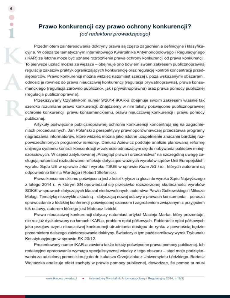 6 Prawo konkurencji czy prawo ochrony konkurencji? (od redaktora prowadzącego) Przedmiotem zainteresowania doktryny prawa są często zagadnienia definicyjne i klasyfikacyjne. W obszarze tematycznym internetowego Kwartalnika Antymonopolowego i Regulacyjnego (iKAR) za istotne może być uznane rozróżnienie prawa ochrony konkurencji od prawa konkurencji. To pierwsze uznać można za węższe – obejmuje ono bowiem swoim zakresem publicznoprawną regulację zakazów praktyk ograniczających konkurencję oraz regulację kontroli koncentracji przedsiębiorców. Prawo konkurencji można widzieć natomiast szerzej i, poza wskazanymi obszarami, odnosić je również do prawa nieuczciwej konkurencji (regulacja prywatnoprawna), prawa konsumenckiego (regulacja zarówno publiczno-, jak i prywatnoprawna) oraz prawa pomocy publicznej (regulacja publicznoprawna). Przekazywany Czytelnikom numer 9/2014 iKAR-a obejmuje swoim zakresem właśnie tak szeroko rozumiane prawo konkurencji. Znajdziemy w nim teksty poświęcone publicznoprawnej ochronie konkurencji, prawu konsumenckiemu, prawu nieuczciwej konkurencji i prawu pomocy publicznej. Artykuły poświęcone publicznoprawnej ochronie konkurencji koncentrują się na zagadnieniach proceduralnych. Jan Polański z perspektywy prawnoporównawczej przedstawia programy nagradzania informatorów, które widzieć można jako istotne uzupełnienie znacznie bardziej rozpowszechnionych programów leniency. Dariusz Aziewicz poddaje analizie planowaną reformę unijnego systemu kontroli koncentracji w zakresie odnoszącym się do nabywania pakietów mniejszościowych. W części zatytułowanej „Przegląd prawa i orzecznictwa” na szczególną uwagę zasługują natomiast rozbudowane refleksje dotyczące ważnych wyroków sądów Unii Europejskich: wyroku Sądu UE w sprawie Intel i wyroku TSUE w sprawie Kone AG i in., których autorami są odpowiednio Emilia Wardęga i Robert Stefanicki. Prawu konsumenckiemu poświęcona jest z kolei krytyczna glosa do wyroku Sądu Najwyższego z lutego 2014 r., w którym SN opowiedział się przeciwko rozszerzonej skuteczności wyroków SOKiK w sprawach dotyczących klauzul niedozwolonych, autorstwa Pawła Gutkowskiego i Miłosza Malagi. Tematykę niezwykle aktualną – dotyczącą nowej ustawy o prawach konsumenta – porusza sprawozdanie z łódzkiej konferencji poświęconej szansom i zagrożeniom związanym z przyjęciem tek ustawy, autorem którego jest Mateusz Izbicki. Prawa nieuczciwej konkurencji dotyczy natomiast artykuł Macieja Marka, który prezentuje, nie raz już dyskutowany na łamach iKAR-a, problem opłat półkowych. Pobieranie opłat półkowych jako przejaw czynu nieuczciwej konkurencji utrudniania dostępu do rynku z pewnością będzie przedmiotem dalszego zainteresowania doktryny. Świadczy o tym październikowy wyrok Trybunału Konstytucyjnego w sprawie SK 20/12. Prezentowany numer iKAR-a zawiera także teksty poświęcone prawu pomocy publicznej. Ich redakcyjne opracowanie wymaga specjalistycznej wiedzy z tego obszaru – stąd moje podziękowania za udzieloną pomoc kieruję do dr. Łukasza Grzejdziaka z Uniwersytetu Łódzkiego. Bartosz Wojtaczka analizuje efekt zachęty w prawie pomocy publicznej, dowodząc, że pomoc ta musi www.ikar.wz.uw.edu.pl internetowy Kwartalnik Antymonopolowy i Regulacyjny 2014, nr 9(3) 7 Maciej Bernatt Prawo konkurencji czy prawo ochrony konkurencji? służyć polityce gospodarczej państwa, nie zaś tylko poprawie sytuacji finansowej beneficjenta wsparcia. Justyna Kulawik-Dutkowska w swoim artykule proponuje poprawną definicję pojęcia MŚP. Tematykę pomocy publicznej zamyka omówienie wyroku Sądu UE w sprawie ABN Amro Group autorstwa Wojciecha Podlasina. Numer otwiera Wspomnienie o dr Monice Zielińskiej. Społeczność polskiego prawa konkurencji i regulacji poniosła wielką stratę. Przygotowanie niniejszego numeru nie byłoby możliwe bez pomocy recenzentów. Dlatego też serdecznie dziękuję za przekazane uwagi, które niejednokrotnie zmuszały autorów artykułów do doskonalenia swoich tekstów. Koniec roku to czas odpoczynku i przyjemności. Osobom, które nie mają jeszcze pomysłu na prezent świąteczny (dla bliskich bądź dla siebie) polecam omówienie przewodnika po popkulturze antytrustu. Zapraszamy do lektury. dr Maciej Bernatt www.ikar.wz.uw.edu.pl internetowy Kwartalnik Antymonopolowy i Regulacyjny 2014, nr 9(3)