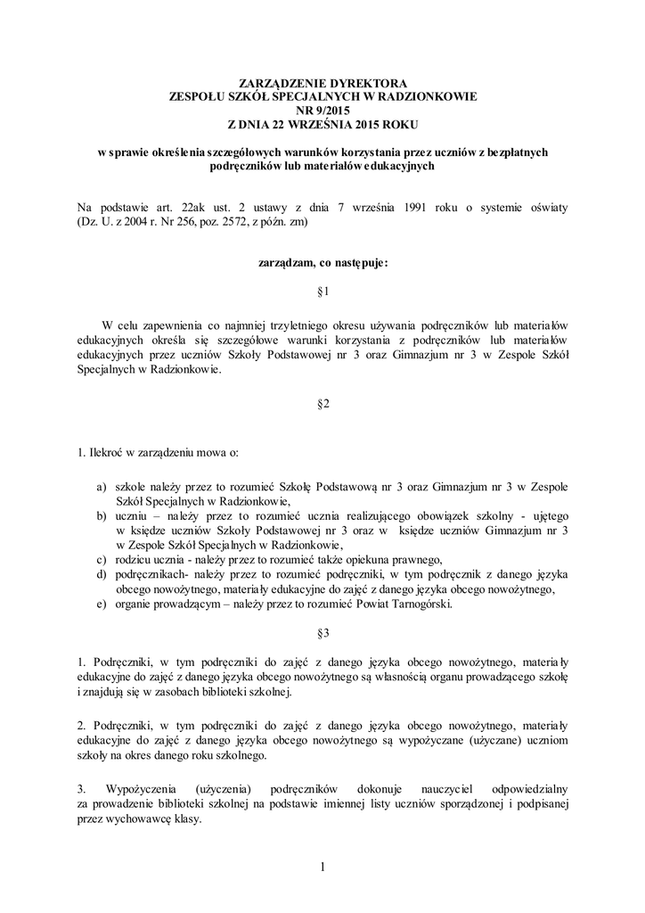 ZARZĄDZENIE DYREKTORA ZESPOŁU SZKÓŁ SPECJALNYCH W RADZIONKOWIE NR 9/2015 Z DNIA 22 WRZEŚNIA 2015 ROKU w sprawie określenia szczegółowych warunków korzystania przez uczniów z bezpłatnych podręczników lub materiałów edukacyjnych Na podstawie art. 22ak ust. 2 ustawy z dnia 7 września 1991 roku o systemie oświaty (Dz. U. z 2004 r. Nr 256, poz. 2572, z późn. zm) zarządzam, co następuje: §1 W celu zapewnienia co najmniej trzyletniego okresu używania podręczników lub materiałów edukacyjnych określa się szczegółowe warunki korzystania z podręczników lub materiałów edukacyjnych przez uczniów Szkoły Podstawowej nr 3 oraz Gimnazjum nr 3 w Zespole Szkół Specjalnych w Radzionkowie. §2 1. Ilekroć w zarządzeniu mowa o: a) szkole należy przez to rozumieć Szkołę Podstawową nr 3 oraz Gimnazjum nr 3 w Zespole Szkół Specjalnych w Radzionkowie, b) uczniu – należy przez to rozumieć ucznia realizującego obowiązek szkolny - ujętego w księdze uczniów Szkoły Podstawowej nr 3 oraz w księdze uczniów Gimnazjum nr 3 w Zespole Szkół Specjalnych w Radzionkowie, c) rodzicu ucznia - należy przez to rozumieć także opiekuna prawnego, d) podręcznikach- należy przez to rozumieć podręczniki, w tym podręcznik z danego języka obcego nowożytnego, materiały edukacyjne do zajęć z danego języka obcego nowożytnego, e) organie prowadzącym – należy przez to rozumieć Powiat Tarnogórski. §3 1. Podręczniki, w tym podręczniki do zajęć z danego języka obcego nowożytnego, materia ły edukacyjne do zajęć z danego języka obcego nowożytnego są własnością organu prowadzącego szkołę i znajdują się w zasobach biblioteki szkolnej. 2. Podręczniki, w tym podręczniki do zajęć z danego języka obcego nowożytnego, materiały edukacyjne do zajęć z danego języka obcego nowożytnego są wypożyczane (użyczane) uczniom szkoły na okres danego roku szkolnego. 3. Wypożyczenia (użyczenia) podręczników dokonuje nauczyciel odpowiedzialny za prowadzenie biblioteki szkolnej na podstawie imiennej listy uczniów sporządzonej i podpisanej przez wychowawcę klasy. 1 4. Rodzice uczniów, którym wypożyczane (użyczane) są podręczniki podpisują listę potwierdzającą ten fakt. Dla każdego rodzaju podręczników przygotowywana jest osobna lista. 5. Podręczniki na dany rok szkolny są wypożyczane w dniu i w godzinach uzgodnionych pomiędzy nauczycielem odpowiedzialnym za prowadzenie biblioteki szkolnej a wychowawcą klasy. Zapis ten stosuje się również do zwrotu podręczników. 6. Podręczniki są wypożyczane (użyczane) uczniom nie późnie j niż do dnia 14 września danego roku szkolnego. 7. Wypożyczenie podręcznika może nastąpić również w innym terminie, w trakcie danego roku szkolnego. 8. Za zebranie od rodziców podpisów na listach odbioru odpowiada nauczyciel wychowawca, a następnie przekazuje je do biblioteki szkolnej. §4 Podręczniki podlegają zwrotowi do biblioteki szkolnej w przypadku skreślenia ucznia z księgi uczniów, przeniesienia ucznia do innej szkoły lub w przypadku innych zdarzeń losowych. §5 1. Po zakończeniu zajęć dydaktycznych w szkole uczniowie zwracają podręczniki do biblioteki szkolnej. Zwrot następuję nie później niż do 15 lipca danego roku. Uczniowie przystępujący do egzaminu komisyjnego zwracają podręcznik nie później niż do końca sierpnia danego roku. 2. Nadzór nad zadaniem, o którym mowa w ust.1 realizuje wychowawca ucznia oraz nauczyciel odpowiedzialny za prowadzenie biblioteki szkolnej. 3. Podczas zwrotu podręcznika do biblioteki- nauczyciele, o których mowa w ust.2 dokonują oględzin podręcznika, określając stopień jego zużycia. 4. W przypadku zgubienia podręcznika, znacznego zużycia, wykraczającego poza jego zwykle używanie, bądź jego zniszczenia, rodzice są zobowiązani do zwrotu kosztów zakupu nowego podręcznika.. Szczegółowe wytyczne znajdują się w załączniku nr 1 do niniejszego zarządzenia. 5. Zapisu ustępu 4 nie stosuje się w przypadku zwrotu podręcznika po jego trzyletnim użytkowaniu. §6 1. Uczniowie są zobowiązani do używania podręcznika zgodnie z jego przeznaczeniem, do zachowania troski o jego walor użytkowy i estetyczny, do chronienia go przed zniszczeniem bądź zagubieniem. 2 2. W przypadku zniszczenia lub zagubienia podręcznika uczeń lub rodzic jest zobowiązany poinformować nauczyciela wychowawcę i nauczyciela odpowiedzialnego za prowadzenie biblioteki szkolnej. §7 Zobowiązuje się nauczycieli wychowawców do zapoznania uczniów i ich rodziców z niniejszym zarządzeniem. §8 1. Zarządzenie ma zastosowanie: a) w roku szkolnym 2015/2016 do uczniów klas 1,2 i 4 szkoły podstawowej oraz 1 gimnazjum c) w roku szkolnym 2016/2017 do uczniów klas 1 - 5 szkoły podstawowej oraz 1-2 gimnazjum 2. Począwszy od roku szkolnego 2017/2018 zarządzenie ma zastosowanie do uczniów wszystkich klas szkoły podstawowej oraz wszystkich gimnazjum. §9 Zarządzenie podlega ogłoszeniu na szkolnej tablicy ogłoszeń oraz na stronie internetowej szkoły. §10 Traci moc zarządzenie Dyrektora Zespołu Szkół Specjalnych w Radzionkowie nr 11/2014 z dnia 01 września 2014 roku. §11 Zarządzenie wchodzi w życie z dniem 01 września 2015 roku. 3 Załącznik nr 1 Zarządzenia nr 9/2015 Dyrektora Zespołu Szkół Specjalnych w Radzionkowie z dnia 22.09.2015 r. Wytyczne w sprawie opłat ponoszonych prze z rodzicó w w związku z us zkodzenie m, znis zczenie m lub niezwróceniem podręczników zakupionych z dotacji W przypadku uszkodzenia, zniszczenia lub niezwrócenia: 1. Podręcznika do klasy I i II zapewnionego przez Ministra Edukacji Narodowej szkoła może żądać od rodziców ucznia zwrotu: kwoty 4,34 zł za każdą z czterech części „Naszego elementarza” do klasy I szkoły podstawowej kwoty 4,21 zł za każdą z dziewięciu części podręcznika „Nasza szkoła” do klasy II szkoły podstawowej Kwota ta stanowi dochód budżetu pań