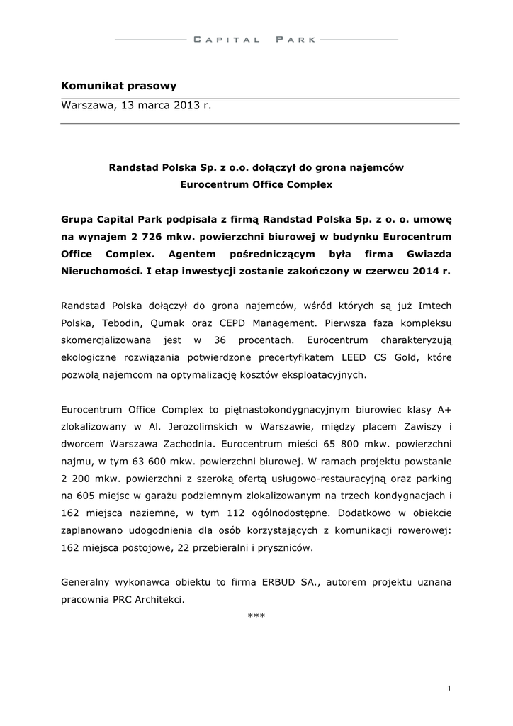 Komunikat prasowy Warszawa, 13 marca 2013 r. INFORMACJA PRASOWA Randstad Polska Sp. z o.o. dołączył do grona najemców Eurocentrum Office Complex Grupa Capital Park podpisała z firmą Randstad Polska Sp. z o. o. umowę na wynajem 2 726 mkw. powierzchni biurowej w budynku Eurocentrum Office Complex. Agentem pośredniczącym była firma Gwiazda Nieruchomości. I etap inwestycji zostanie zakończony w czerwcu 2014 r. Randstad Polska dołączył do grona najemców, wśród których są już Imtech Polska, Tebodin, Qumak oraz CEPD Management. Pierwsza faza kompleksu skomercjalizowana jest w 36 procentach. Eurocentrum charakteryzują ekologiczne rozwiązania potwierdzone precertyfikatem LEED CS Gold, które pozwolą najemcom na optymalizację kosztów eksploatacyjnych. Eurocentrum Office Complex to piętnastokondygnacyjnym biurowiec klasy A+ zlokalizowany w Al. Jerozolimskich w Warszawie, między placem Zawiszy i dworcem Warszawa Zachodnia. Eurocentrum mieści 65 800 mkw. powierzchni najmu, w tym 63 600 mkw. powierzchni biurowej. W ramach projektu powstanie 2 200 mkw. powierzchni z szeroką ofertą usługowo-restauracyjną oraz parking na 605 miejsc w garażu podziemnym zlokalizowanym na trzech kondygnacjach i 162 miejsca naziemne, w tym 112 ogólnodostępne. Dodatkowo w obiekcie zaplanowano udogodnienia dla osób korzystających z komunikacji rowerowej: 162 miejsca postojowe, 22 przebieralni i pryszniców. Generalny wykonawca obiektu to firma ERBUD SA., autorem projektu uznana pracownia PRC Architekci. *** 1 Dodatkowe informacje: Eurocentrum Office Complex w liczbach Klasyfikacja biurowca Powierzchnia całkowita najmu Powierzchnia biurowa Powierzchnia handlowo-usługowa Liczba miejsc parkingowych Liczba kondygnacji klasa A+ 65 800 mkw. 63 600 mkw. 2 200 mkw. 605 podziemnych: 162 naziemnych, w tym 112 ogólnodostępnych (parkomaty) 15 naziemnych, 3 podziemne Dojazd transportem publicznym Linie autobusowe Dworzec Zachodni 127, 130, 136, 154, 157,158, 167, 172, 184, 186, 187, 191, 208, 382, 414, 517, 523, 717 • Kolej PKP, • kolejka WKD oraz SKM Inwestor Grupa Capital Park aktywnie działa na polskim rynku nieruchomości od 2003 roku, inwestując wspólnie z międzynarodowym funduszem private equity Patron Capital Partners, zarządzającym kapitałem w kwocie ponad 2,3 mld EUR. Od początku działalności Grupa Capital Park stworzyła portfel inwestycyjny obejmujący 70 aktywów o łącznej ukończonej oraz planowanej powierzchni około 300 000 mkw. brutto, z czego ponad 80 procent zlokalizowanych jest w Warszawie, czyli na jednym z najbardziej perspektywicznych rynków w Polsce. Grupa Capital Park jest jedną z czołowych i najbardziej dynamicznie rozwijających się firm inwestycyjnych działających na rynku nieruchomości w Polsce. Grupa jest jednym z największych deweloperów na polskim rynku nieruchomości biurowych oraz liderem rynku high-street w Polsce. Capital Park buduje i zarządza również nieruchomościami typu street mall, w ramach programu Vis a Vis oraz innymi powierzchniami handlowymi. Portfel nieruchomości Grupy obejmuje również kilka projektów mieszkaniowych. Grupa koncentruje się na nabywaniu nieruchomości ze znacznym potencjałem budowy wartości poprzez m.in. zmianę warunków zagospodarowania przestrzennego, uzyskanie pozwoleń na budowę, budowę nowych obiektów, przebudowę istniejących, lub też poprawę zarządzania istniejącymi budynkami. *** Biuro prasowe Capital Park Joanna Cybulska tel. 0 48 22 642 24 16, + 48 609 716 113 email: [email protected] 2