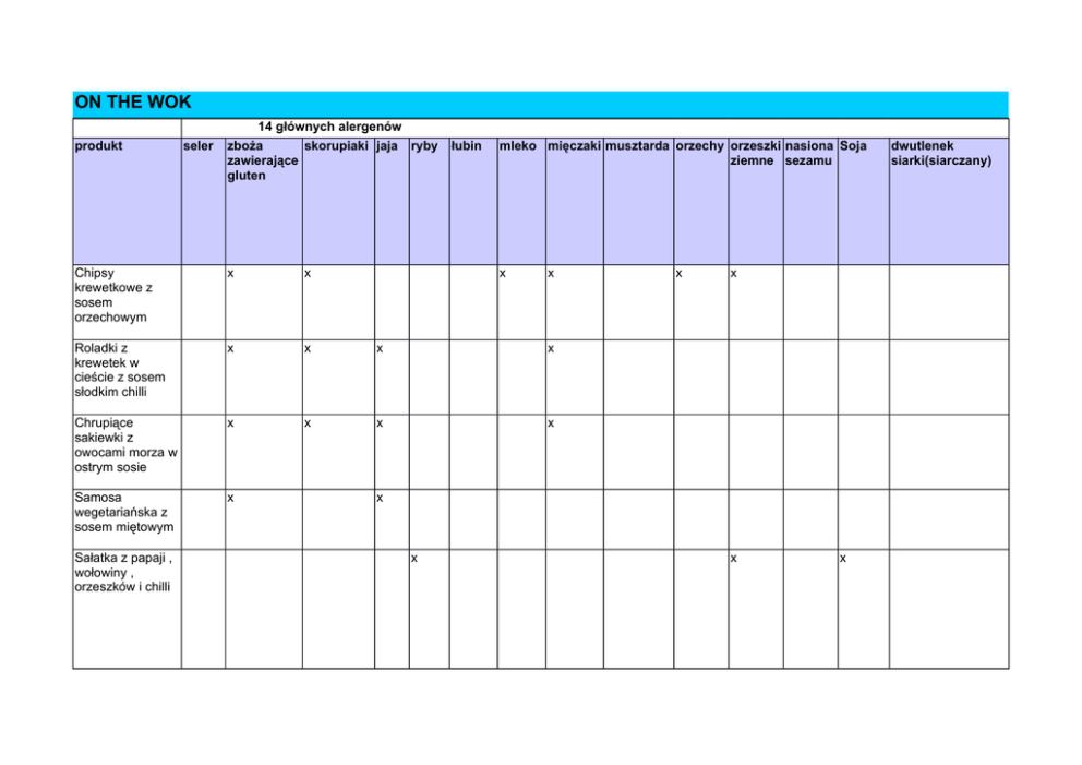 ON THE WOK produkt seler 14 głównych alergenów zboża skorupiaki jaja ryby zawierające gluten łubin mleko mięczaki musztarda orzechy orzeszki nasiona Soja ziemne sezamu Chipsy krewetkowe z sosem orzechowym x x Roladki z krewetek w cieście z sosem słodkim chilli x x x x Chrupiące sakiewki z owocami morza w ostrym sosie x x x x Samosa wegetariańska z sosem miętowym x Sałatka z papaji , wołowiny , orzeszków i chilli x x x x x x x x dwutlenek siarki(siarczany) produkt Sałatka z makaronu z kurczakiem , kolendą i limonka Zupa z mleka kokosowego z kurczakiem Tom kha Gai seler zboża skorupiaki jaja zawierające gluten x ryby x x x x x Ostra zupa z krewetkami i trawą cytrynowa Tom yum kung Tajska zupa rybna z imbirem i warzywami x łubin mleko mięczaki musztarda orzechy orzeszki nasiona Soja ziemne sezamu x x x x x x x x dwutlenek siarki(siarczany) produkt Kurczak w stylu kung pao z orzeszkami i chilli seler zboża skorupiaki jaja zawierające gluten x x Wołowina w sosie z czarnego pieprzu z papryka i groszkiem x Kaczka w sosie Pekin z imbirowymi warzywami z woka x Wieprzowina w sosie thai bbq z zieloną fasolką i czosnkiem x ryby x łubin mleko mięczaki musztarda orzechy orzeszki nasiona Soja ziemne sezamu x x x x x dwutlenek siarki(siarczany) produkt seler zboża skorupiaki jaja zawierające gluten ryby łubin mleko mięczaki musztarda orzechy orzeszki nasiona Soja ziemne sezamu Krewetki w sosie ostrygowym z zielonymi warzywami ( x – skorupiaki i mieczaki i soja ) Krewetki tygrysie w sosie masal z pomidorkami wiśniowymi x Krewetki tygrysie w sosie bazyliowym chilli z bok choi x x x x x x dwutlenek siarki(siarczany) ON THE WOK produkt seler 14 głównych alergenów zboża skorupiaki jaja ryby zawierające gluten Krewetki tygrysie z chrupiącym czosnkiem i kolendrą x Sos curry z kurczakeim x Sos curry z krewetkami x x x x x x łubin mleko mięczaki musztarda orzechy orzeszki nasiona Soja ziemne sezamu x x x x x x x ryż jaśminowy Sałatka z ogórka x Sałatka z kapusty Makaron ryżowy „Pad Thai” z krewetkami lub kurczakiem z orzeszkami i tofu x x dwutlenek siarki(siarczany) produkt Makaron ryżowy” Duck noodels „z kaczka ,warzywami ,bazylią na ostro seler zboża skorupiaki jaja ryby zawierające gluten x x łubin mleko mięczaki musztarda orzechy orzeszki nasiona Soja ziemne sezamu x Makaron sojowy z kurczakiem ,cukinią i kolendra x x x Makaron udon z kurczakiem i warzywami z sosem ostrygowym x x x Makaron soba z tofu wędzonym, imbirem i warzywami x x x dwutlenek siarki(siarczany) produkt Ryż smażony z warzywami i tofu Ryż smażony z kaczką , ananasem i kiełkami seler zboża skorupiaki jaja ryby zawierające gluten x x łubin mleko mięczaki musztarda orzechy orzeszki nasiona Soja ziemne sezamu x Ryż smażony z kurczakiem i bazylia na ostro x x x x Ryz smażony z krewetkami i chrupiącą cebulką x x x x dwutlenek siarki(siarczany) ON THE WOK produkt Ryz kokosowy z mango Kulki ryżowe z orzechami w sosie karmelowym z sezamem Banany gotowane w kremowym mleku kokosowym seler 14 głównych alergenów zboża skorupiaki jaja ryby zawierające gluten łubin mleko mięczaki musztarda orzechy orzeszki nasiona Soja ziemne sezamu x x x dwutlenek siarki(siarczany)