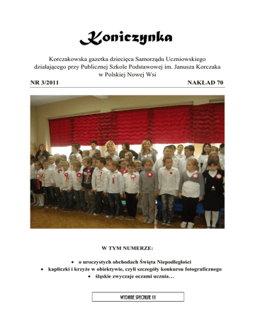 Koniczynka Korczakowska gazetka dziecięca Samorządu Uczniowskiego działającego przy Publicznej Szkole Podstawowej im. Janusza Korczaka w Polskiej Nowej Wsi NR 3/2011 NAKŁAD 70 W TYM NUMERZE: o uroczystych obchodach Święta Niepodległości kapliczki i krzyże w obiektywie, czyli szczegóły konkursu fotograficznego śląskie zwyczaje oczami ucznia… WYDANIE SPECJALNE !!! ŚWIĘTO NIEPODLEGŁOŚCI 11 listopada, jak co roku o tej porze, świętowaliśmy radosną rocznicę odzyskania przez Polskę niepodległości. Wspominaliśmy szczęśliwy rok 1918, który po 123 latach zaborów przyniósł nam upragnioną wolność i odbudowę polskiej państwowości. W tym roku szkolnym klasy V i VI, pod opieką Pani Małgorzaty Romanowicz i przy wsparciu Pań Mirosławy Woźniak oraz Marzeny Biedroń, przygotowały ciekawy i podniosły występ, inspirowany tym ważnym wydarzeniem. Zanim jednak 10 listopada, w przeddzień uroczystości, zebraliśmy się w szkolnej sali gimnastycznej, jakże odmienionej, bo przystrojonej w białe i czerwone barwy narodowe, zrobiliśmy własnoręcznie piękne kotyliony. Dzieci wraz z wychowawcami odbyły przy tej okazji nietypową, a przy tym ciekawą lekcję patriotyzmu, wykazując się dużym zaangażowaniem i radosnym skupieniem. Niepodległości. Cała szkoła w skupieniu obejrzała prezentację multimedialną oraz montaż słowno-muzyczny przygotowany przez najstarsze koleżanki i kolegów. Szczególne uznanie wzbudził tego dnia uczeń klasy VI, Dawid Smarzlik, który zagrał na flecie nostalgiczny utwór pt. Zakwitały pąki białych róż. Jakoś inaczej tego dnia brzmiał nasz hymn narodowy oraz znane pieśni legionowe śpiewne przez dużych i małych. Szkolną salę wypełniła pozytywna energia, lecz nie zabrakło też zadumy nad trudną historią naszej ojczyzny. Po wyprowadzeniu sztandaru szkoły, poszczególne klasy otrzymały flagi narodowe i wyruszyły – przypinając swe kotyliony na kurtki i płaszcze – w radosny pochód. W ten sposób Marsz Niepodległości zawitał także do Polskiej Nowej Wsi. Na tym zakończyliśmy obchody tego wyjątkowego święta. Dzieci zabrały kotyliony i dobre emocje do swoich rodzinnych domów. Opracowała: Ewa Pawleta Na część oficjalną obchodów Świeta Niepodległości złożyły się uroczysta akademia oraz lokalny Marsz 2 KRZYŻE I KAPLICZKI Uczniowie naszej szkoły, pod opieką Pani Dyrektor Zofii Kotońskiej, nauczyciela historii, wzięli udział w XVI Konkursie Fotograficznym „Zabytkowa architektura wsi opolskiej – 2011”, którego współorganizatorem jest Muzeum Wsi Opolskiej w Opolu. zabytki, od gołębników i pomp począwszy, a na domach, stodołach, młynach czy remizach kończąc. Nasi uczniowie zdecydowali się na dokumentowanie lokalnej architektury sakralnej. Na swoich zdjęciach uwiecznili kapliczki przydrożne, krzyże oraz kapliczki na domach. Okazało się, że mieszkańcy Polskiej Nowej Wsi dbają o swoje zabytki. Konkurs ma za zadanie chronić zabytki budownictwa wiejskiego poprzez bezpośredni kontakt z nimi, przez dostrzeżenie ich fizycznej obecności. Inne cele, jakie założyli sobie organizatorzy, to gromadzenie i prezentacja materiałów dokumentujących zabytki wsi opolskiej, a przy okazji rozwijanie przez dzieci osobistych zainteresowań, wrażliwości estetycznej oraz indywidualnych zdolności w zakresie fotografii. Ciekawi jesteśmy wyników konkursu. Wernisaż połączony z odczytaniem wyników i wręczeniem nagród, już w piątek, 25 listopada, w Muzeum Wsi Opolskiej w OpoluBierkowicach. Czekamy z niecierpliwością i trzymamy kciuki za nasze koleżanki oraz kolegów. Może jakaś nagroda przypadnie w udziale Rafałowi Knosali z klasy V, którego zdjęcia podziwiać możecie w tym artykule? Prace przedstawiać konkursowe mogły najbardziej różnorodne 3 ZE ŚLĄSKIEM NA TY… Uczniowie klasy V, pod opieką Pani Ewy Pawlety, wzięli udział w konkursie „Ze Śląskiem na Ty”, który od lat organizuje Łubniański Ośrodek Działalności Kulturalnej. Za zadanie mieli napisać pracę na temat zwyczajów i obyczajów w swojej rodzimej miejscowości. Poniżej jedna z konkursowych wypowiedzi. Dożynki, żniwniok, święto plonów. To nazwy uroczystości, która od pokoleń istnieje w naszej kulturze. Ludzie w ten sposób dziękowali i dziękują za plony zebrane z pól i sadów – dawniej bogom, teraz Bogu. Jest to również okazja, aby odwdzięczyć się za urodzaj i błogosławieństwo. W tym dniu także prosi się o dobrobyt w roku następnym. W naszej parafii święto plonów ma długą tradycję. Moja prababcia, która liczy sobie osiemdziesiąt trzy lata, jest dla mnie skarbnicą wiedzy na ten temat. Pamięta ona dożynki z kilkudziesięciu lat, a sama pierwszy raz uczestniczyła w tej uroczystości jako kilkuletnia dziewczynka. Każdego roku organizowaniem tego święta zajmowała się grupa wybrana przez księdza proboszcza. Z reguły byli to gospodarze z kilku mniejszych uliczek lub część ulicy Lipowej, gdyż jest to ulica licząca najwięcej mieszkańców. Kobiety zbierały się w grupy i tuż przed żniwami ścinały najpiękniejsze kłosy z każdego gatunku zboża. Kłosy te były podstawowym materiałem na koronę dożynkową, która jest najważniejszym symbolem w tym dniu. Pozostałe elementy wieńca żniwnego wykonywano z ziół, kwiatów, warzyw i owoców. Plecenie i zdobienie korony to zajęcie czasochłonne i trwało nawet parę tygodni. Kobiety spotykały się dawniej w strojach ludowych i przy pracy śpiewały śląskie pieśni. Obecnie nowoczesne gospodynie ubrane w spodnie i koszulki po prostu sobie plotkują. Wszyscy mieszkańcy wioski wykonywali ozdoby z płodów roli i umieszczali je na płotach i domach. Ważnymi osobami w tym dniu byli starostowie dożynek – to małżeństwo rolników z grupy wybranej przez proboszcza. To z ich posesji ruszała procesja do kościoła z koroną na czele. […] Po uroczystej mszy świętej uroczystość pr