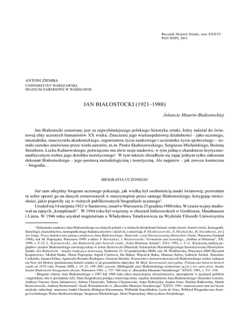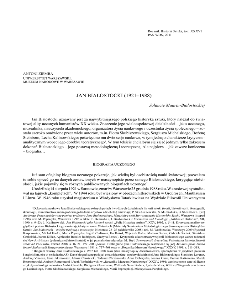157 Rocznik Historii Sztuki, tom XXXVI PAN WDN, 2011 ANTONI ZIEMBA UNIWERSYTET WARSZAWSKI, MUZEUM NARODOWE W WARSZAWIE JAN BIAŁOSTOCKI (1921–1988) Jolancie Maurin-Białostockiej Jan Białostocki uznawany jest za najwybitniejszego polskiego historyka sztuki, który należał do światowej elity uczonych humanistów XX wieku. Znaczenie jego wieloaspektowej działalności – jako uczonego, muzealnika, nauczyciela akademickiego, organizatora życia naukowego i uczestnika życia społecznego – zostało szeroko omówione przez wielu autorów, m.in. Piotra Skubiszewskiego, Sergiusza Michalskiego, Bożenę Steinborn, Lecha Kalinowskiego; poświęcono mu dwie sesje naukowe, w tym jedną o charakterze krytycznoanalitycznym wobec jego dorobku teoretycznego1. W tym tekście chciałbym się zająć jednym tylko zakresem dokonań Białostockiego – jego postawą metodologiczną i teoretyczną. Ale najpierw – jak zawsze konieczna – biografia… BIOGRAFIA UCZONEGO Już sam oficjalny biogram uczonego pokazuje, jak wielką był osobistością nauki światowej; pozwalam tu sobie oprzeć go na danych zestawionych w maszynopisie przez samego Białostockiego, korygując nieścisłości, jakie pojawiły się w różnych publikowanych biografiach uczonego2. Urodził się 14 sierpnia 1921 w Saratowie, zmarł w Warszawie 25 grudnia 1988 roku. W czasie wojny studiował na tajnych „kompletach”. W 1944 roku był więziony w obozach hitlerowskich w Großrosen, Mauthausen i Linzu. W 1946 roku uzyskał magisterium u Władysława Tatarkiewicza na Wydziale Filozofii Uniwersytetu Dokonania naukowe Jana Białostockiego na różnych polach i w różnych dziedzinach historii sztuki (teorii, historii teorii, ikonografii, ikonologii, muzealnictwa, monograficznego badania artystów i dzieł etc.) omawiają: P. S k u b i sz e w sk i , S. M i c h a l sk i , B. S t e i n b o r n , [w:] Ars longa. Prace dedykowane pamięci profesora Jana Białostockiego, Materiały z sesji Stowarzyszenia Historyków Sztuki, Warszawa listopad 1998), red. M. Poprzęcka, Warszawa 1999; a także: F. Be r n a b e i , J. B i a l o st o c k i : Formalizm and Iconology, „Artibus et Historiae”, XII, 1990, s. 9–23; L. Kalinowski, Jan Białostocki jako historyk sztuki, „Folia Historiae Atrium”, XXV, 1992, s. 5–11. Krytyczną analizę poglądów i postaw Białostockiego zawierają teksty w tomie Białostocki (Materiały Seminarium Metodologicznego Stowarzyszenia Historyków Sztuki: Jan Białostocki – między tradycją a innowacją, Nieborów 23–25 października 2008), red. M. Wróblewska, Warszawa 2009 (Ryszard Kasperowicz, Michał Haake, Maria Poprzęcka, Ingrid Ciulisová, Ján Bakoš, Wojciech Bałus, Mateusz Salwa, Gabriela Świtek, Stanisław Czekalski, Joanna Kilian, Agnieszka Rosales Rodriguez, Grażyna Bastek). Krytycznie o konserwatywnej roli Białostockiego wobec rodzącej się New Art History (polemicznej historii sztuki) w jej poznańskim odprysku: M. Bryl, Suwerenność dyscypliny. Polemiczna historia historii sztuki od 1970 roku, Poznań 2008, s. 16–21, 199–200 i passim. Bibliografie prac Białostockiego zestawione są [w:] Ars auro prior. Studia Ioanni Białostocki Sexagenario dicata, Warszawa 1981, s. 757–768 oraz w „Roczniku Muzeum Narodowego” XXXV, 1991, s. 311–318. 2 Biogram własny Jana Białostockiego z 1987 lub 1988 roku (dwa maszynopisy dwustronicowe, sporządzone w językach polskim i angielskim, oba w posiadaniu AZ). Dane biograficzne podają i omawiają różne aspekty działalności Jana Białostockiego: Stanisław Lorentz, Andrzej Vincenz, Irena Jakimowicz, Juliusz Chrościcki, Tadeusz Chrzanowski, Anna Dobrzycka, Joanna Guze, Paulina Ratkowska, Marek Rostworowski, Andrzej Rottermund i Jacek Woźniakowski w „Roczniku Muzeum Narodowego” XXXV, 1991; zamieszczono tam też liczne artykuły–nekrologi autorstwa André Chastela, Rüdigera Klessmanna, Wilibalda Sauerländera, Lycle de Vries, Wilfried Wieganda oraz Jerzego Łozińskiego, Piotra Skubiszewskiego, Sergiusza Michalskiego, Marii Poprzęckiej, Mieczysława Porębskiego. 1 158 ANTONI ZIEMBA Jan Białostocki Wg A. Małkiewicz, Z dziejów polskiej historii sztuki. Studia i szkice, Kraków 2005 Warszawskiego, w 1950 doktorat z historii sztuki w tej uczelni, oficjalnie pod opieką Stanisława Lorentza, w istocie przygotowany pod kierunkiem Walickiego. Edukację pogłębił za granicą, podczas pobytów w Paryżu w 1948 roku oraz na uniwersytecie w Princeton w roku 1958 (Ford Foundation). Całe życie związany był z dwiema instytucjami: Instytutem Historii Sztuki Uniwersytetu Warszawskiego oraz Muzeum Narodowym w Warszawie. Na uniwersytecie pracował od października 1945 do 1950 roku jako asystent Michała Walickiego w Zakładzie Historii Sztuki Średniowiecznej, potem, po przerwie spowodowanej usunięciem i aresztowaniem Walickiego z powodów politycznych, od roku 1959 do 1961 jako docent w Instytucie Historii Sztuki, od 1962 roku jako profesor nadzwyczajny, a od 1972 jako profesor zwyczajny. W Muzeum Narodowym podjął pracę jesienią 1945 roku, początkowo wykonując prace zlecone, potem zatrudniony był na stałym etacie jako asystent Walickiego, od 1955 roku był kustoszem, a od 1956 kuratorem Galerii Sztuki Obcej; od 1961 redaktorem naczelnym Bulletin du Musée National de Varsovie. Funkcje profesorską w Instytucie Historii Sztuki oraz kuratorską w muzeum piastował do śmierci. Prowadził wykłady na uczelniach polskich i zagranicznych3. W latach 1973 i 1983 był członkiem rezydentem renomowanego Institute for Advanced Study w Princeton. Ponadto wygłaszał pojedyncze wykłady na bardzo wielu uniwersytetach europejskich, amerykańskich i australijskich – w Anglii, Austrii, Australii, Bułgarii, Czechosłowacji, Danii, Francji, Grecji, Holandii, Jugosławii, Meksyku, NRD, Niemczech Zachodnich, Rosji (ZSRR), Stanach Zjednoczonych, Szwecji, na Węgrzech, we Włoszech. Rozchwytywany za granicą, znajdował chętnie czas na wyg