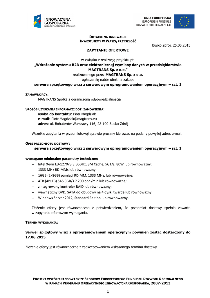 DOTACJE NA INNOWACJE INWESTUJEMY W WASZĄ PRZYSZŁOŚĆ Busko Zdrój, 25.05.2015 ZAPYTANIE OFERTOWE w związku z realizacją projektu pt. „Wdrożenie systemu B2B oraz elektronicznej wymiany danych w przedsiębiorstwie MAGTRANS Sp. z o.o.” realizowanego przez MAGTRANS Sp. z o.o. ogłasza się nabór ofert na zakup: serwera sprzętowego wraz z serwerowym oprogramowaniem operacyjnym – szt. 1 ZAMAWIAJĄCY: MAGTRANS Spółka z ograniczoną odpowiedzialnością SPOSÓB UZYSKANIA INFORMACJI DOT. ZAMÓWIENIA: osoba do kontaktu: Piotr Magdziak e-mail: [email protected] adres: ul. Bohaterów Warszawy 116, 28-100 Busko-Zdrój Wszelkie zapytania w przedmiotowej sprawie prosimy kierować na podany powyżej adres e-mail. OPIS PRZEDMIOTU DOSTAWY: serwera sprzętowego wraz z serwerowym oprogramowaniem operacyjnym – szt. 1 wymagane minimalne parametry techniczne: − Intel Xeon E3-‐1270v3 3.50GHz, 8M Cache, 5GT/s, 80W lub równoważny; − 1333 MHz RDIMMs lub równoważny; − 16GB (2x8GB) pamięci RDIMM, 1333 MHz, lub równoważne; − 4TB (4x1TB) SAS 6GB/s 7 200 obr./min lub równoważne; − zintegrowany kontroler RAID lub równoważny; − wewnętrzny DVD, SATA do obudowy na 4 dyski twarde lub równoważny; − Windows Server 2012, Standard Edition lub równoważny. Złożenie oferty jest równoznaczne z potwierdzeniem, że przedmiot dostawy spełnia zawarte w zapytaniu ofertowym wymagania. TERMIN WYKONANIA: Serwer sprzętowy wraz z oprogramowaniem operacyjnym powinien zostać dostarczony do 17.06.2015. Złożenie oferty jest równoznaczne z zaakceptowaniem wskazanego terminu dostawy. PROJEKT WSPÓŁFINANSOWANY ZE ŚRODKÓW EUROPEJSKIEGO FUNDUSZU ROZWOJU REGIONALNEGO W RAMACH PROGRAMU OPERACYJNEGO INNOWACYJNA GOSPODARKA, 2007-2013 1 KRYTERIA OCENY: DOTACJE NA INNOWACJE INWESTUJEMY W WASZĄ PRZYSZŁOŚĆ nazwa kryterium CENA NETTO waga 100% punktacja za kryterium CENA NETTO – obliczona wg następującego wzoru: (cena netto w ofercie najtańszej / cena netto w ofercie badanej) x 100 = liczba punktów łącznie oferent może uzyskać maksymalnie 100 punktów. W oparciu o ustalone kryteria z zachowaniem zasad jawności, przejrzystości i uczciwej konkurencji, bezstronności i obiektywności oraz efektywności Zamawiający wybierze najkorzystniejszą ofertę, która uzyska najwyższą ilość punktów w oparciu o ustalone kryteria i podpisze umowę z wybranym oferentem. MIEJSCE I TERMIN SKŁADANIA OFERT: Oferty można składać drogą elektroniczną na adres [email protected], osobiście w siedzibie przedsiębiorstwa przy ul. Bohaterów Warszawy 116, 28-100 Busko Zdrój lub drogą pocztową, do 10 czerwca 2015 r. włącznie. Nie dopuszcza się składania ofert częściowych. Zamawiający zastrzega sobie możliwość żądania od oferentów wyjaśnień dotyczących treści złożonych ofert. Zamawiający zastrzega sobie prawo do unieważnienia wyboru ofert bez podania przyczyn. Zapytanie ofertowe zostało zamieszczone również w siedzibie Zamawiającego. PROJEKT WSPÓŁFINANSOWANY ZE ŚRODKÓW EUROPEJSKIEGO FUNDUSZU ROZWOJU REGIONALNEGO W RAMACH PROGRAMU OPERACYJNEGO INNOWACYJNA GOSPODARKA, 2007-2013 2