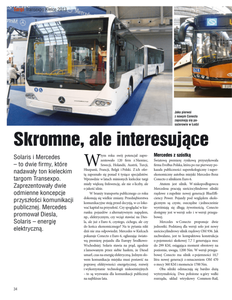 Targi Transexpo Kielce 2013 Jako pierwsi z nowym Conecto zapoznają się pasażerowie w Łodzi Skromne, ale interesujące Solaris i Mercedes – to dwie firmy, które nadawały ton kieleckim targom Transexpo. Zaprezentowały dwie odmienne koncepcje przyszłości komunikacji publicznej. Mercedes promował Diesla, Solaris – energię elektryczną. 34 W tym roku swój potencjał zaprezentowało 120 firm z Niemiec, Szwecji, Holandii, Austrii, Turcji, Hiszpanii, Francji, Belgii i Polski. Z ich ofertą zapoznało się ponad 4 tysiące specjalistów. Wprawdzie w latach minionych kieleckie targi miały większą frekwencję, ale nie o liczby, ale o jakość idzie. W branży transportu publicznego co roku dokonują się wielkie zmiany. Przedsiębiorstwa komunikacyjne stoją przed decyzją, w co lokować kapitał na przyszłość. Czy spoglądać w kierunku pojazdów z alternatywnym napędem, np., elektrycznym, czy wciąż stawiać na Diesla, ale już z Euro 6, czystego, cichego, ale czy do końca ekonomicznego? Na te pytania nikt dziś nie zna odpowiedzi. Mercedes w Kielcach pokazuje Conecto z Euro 6, ogłaszając światową premierę pojazdu dla Europy ŚrodkowoWschodniej. Solaris stawia na prąd, zgodnie z lansowanym przez siebie hasłem, że Diesel umarł, czas na energię elektryczną. Jednym słowem komunikacja miejska musi postawić na poprawę efektywności energetycznej, rozwój i wykorzystanie technologii niskoemisyjnych – to są wyzwania dla komunikacji publicznej na najbliższe lata. Mercedes z szóstką Światową premierę rynkową przyszykowała firma EvoBus Polska, która po raz pierwszy pokazała publiczności superekologiczny i superekonomiczny autobus miejski Mercedes-Benz Conecto z silnikiem Euro 6. Atutem jest silnik. W niskopodłogowcu Mercedesa pracują sześciocylindrowe silniki rzędowe z zupełnie nowej generacji BlueEfficiency Power. Pojazdy pod względem ekologicznym są czyste, oszczędne i jednocześnie wyróżniają się długą żywotnością. Conecto dostępny jest w wersji solo i w wersji przegubowej. Mercedes w Conecto proponuje dwie jednostki. Podstawą dla wersji solo jest nowy sześciocylindrowy silnik rzędowy OM 936. Jak zachwalano, jest to kompaktowa konstrukcja o pojemności skokowej 7,7 l generująca moc do 299 KM, osiągająca moment obrotowy na poziomie, uwaga, 1200 Nm. W wersji przegubowej Conecto ma silnik o pojemności 10,7 litra nowej generacji z oznaczeniem OM 470 o mocy 360 KM i momencie 1700 Nm. Oba silniki odznaczają się bardzo dużą wytrzymałością. Dwa położone u góry wałki rozrządu, układ wtryskowy Common-Rail, Na stoisku Solarisa królował autobus z „ładowarką”. Chodzi o pojazd z automatycznym, zlokalizowanym na dachu systemem ładowania pojazdu z elektryczną osią ZF wysokie ciśnienie wtrysku do 2400 bar (OM 936) oraz 2100 bar (OM 470) to tylko kilka z ich cech. Do technicznych ciekawostek nowo zaprojektowanych silników należy regulowany wydechowy wałek rozrządu kompaktowego OM 936 i elastyczny system wtryskowy X-PULSE z układem zwiększającym ciśnienie w większej jednostce OM 470. Przeniesienie napędu na tylny most portalowy odbywa się w obu silnikach za pośrednictwem oszczędnych przekładni automatycznych znanych producentów. W kwestii obróbki spalin oba silniki bazują na technologii BlueTec-6 opracowanej przez Mercedes-Benz: zamknięty filtr cząstek stałych działający w połączeniu ze stosowanym już z powodzeniem od sześciu lat mercedesowskim systemem SCR i katalizatorem oksydacyjnym. System uzupełnia ponadto chłodzony układ recyrkulacji spalin. Emisje cząstek stałych i tlenków azotu redukowane są dzięki połączeniu tych wszystkich systemów do poziomu znajdującego się wręcz na granicy wykrywalności, a tym samym znacznie poniżej wartości granicznych normy. Oba silniki pracują nie tylko czysto lecz także zużywają mniej paliwa niż ich poprzednicy. Swój wkład w te osiągnięcia mają elektronicznie regulowana dwustopniowa sprężarka powietrza oraz regulowane podzespoły pomocnicze z układem sterowania akumulatorami i generatorami. Wraz z przejściem na Euro 6 oprócz spalania znacząco zmniejszyło się także zużycie AdBlue i oleju silnikowego. Kolejne korzyści dla zakładów komunikacji to długie interwały serwisowe i długa żywotność podzespołów. Kierowcy zyskują na dobrym przyspieszeniu dzięki wysokiemu momentowi obrotowemu już przy prędkościach obrotowych poniżej 1000/min i sprawności silników. Pasażerowie odczuwają przede wszystkim spokojną i cichą pracę zespołów napędowych. Zasługą tego jest nie tylko konstrukcja silników, lecz także nowa izolacja podłogi z płyt typu sandwich. Składa się ona z dwóch zewnętrznych płyt i znajdującej się między nimi warstwy izolacyjnej. Jako pierwsi z nowym Conecto zapoznają się pasażerowie w Łodzi. Tam bowiem w pierwszej kolejności polski dystrybutor zamierza skierować nowy model do testów. Pantograf znaczy elektryczna mobilność Kilka lat temu w Hanowerze Krzysztof Olszewski zapowiedział, że Diesel umarł, niech żyje elektryczność. Było to niejako głośno wypowiedziane credo Solarisa na kilka najbliższych lat Efekty poznaliśmy jesienią 2011 roku podczas targów Transexpo w Kielcach. Solaris zaprezentował całkowicie elektryczny autobus miejski. Był pojazd w wersji niskowejściowej o długości 8,9 metra. Rok później zaprezentowano pierwszy autobus elektryczny w wersji całkowicie niskopodłogowej o długości 12 metrów. W pełni elektryczny autobus – Solaris Urbino electric – znalazł już pierwszych na- AMZ Kutno pokazało 8,5-metrowego City Smile 35 Targi Transexpo Kielce 2013 Czesi z SOR zaprezentowali elektrycznego 10,5-metrowego SOR EBN bywców. Kupił go austriacki Klagenfurt oraz niemieckie Düsseldorf oraz Brunszwik. – Na przestrzeni ostatnich dwóch lat firma dokonała niebywałego postępu w obszarze mobilności elektrycznej, zarówno w odniesieniu do rozwo