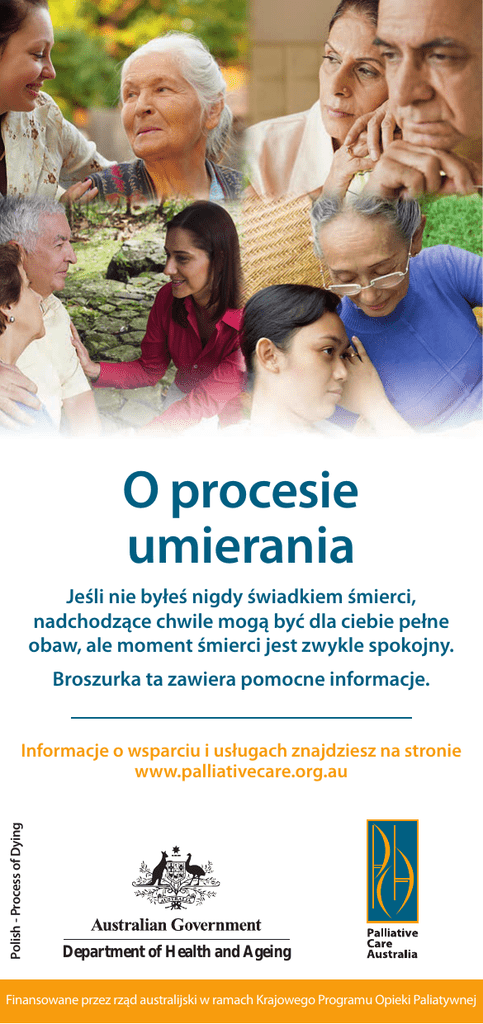 O procesie umierania Jeśli nie byłeś nigdy świadkiem śmierci, nadchodzące chwile mogą być dla ciebie pełne obaw, ale moment śmierci jest zwykle spokojny. Broszurka ta zawiera pomocne informacje. Polish - Process of Dying Informacje o wsparciu i usługach znajdziesz na stronie www.palliativecare.org.au Department of Health and Ageing Finansowane przez rząd australijski w ramach Krajowego Programu Opieki Paliatywnej Opieka nad osobą w ostatnich tygodniach lub dniach jej życia może być stresująca i męcząca. Pojawia się w tym okresie wiele różnorodnych odczuć i emocji. Niniejsza broszurka powinna pomóc ci w zrozumieniu, przewidzeniu i poradzeniu sobie z niektórymi oznakami zbliżającej się śmierci. Opiekunowie często martwią się, że śmierć jest doświadczeniem bolesnym dla chorego, jednak moment przed śmiercią jest zwykle czasem spokojnym. Zauważa się łagodne odchodzenie, trwające niekiedy kilka dni. Życie „ulatnia się” z organizmu. Na konwulsje przedśmiertne stosować można leki. Nie wszystkie objawy śmierci omawiane w ulotce występują u każdego, nie pojawiają się one też w żadnym szczególnym porządku. Czasami oznaki pojawiają się na kilka godzin przed śmiercią, czasami na parę dni. Te fizyczne objawy są częścią normalnego, naturalnego procesu, w którym organizm ludzki stopniowo zwalnia swoje funkcjonowanie. Poza oznakami opisanymi tutaj, możesz zauważyć inne niepokojące zmiany. Zespół opieki paliatywnej służyć ci będzie pomocą przez cały czas, poprzez oferowanie informacji i wsparcia. Proś o pomoc bez wahania. Zespół spodziewa się, że częstotliwość kontaktu z tobą wzrośnie w ostatnich stadiach życia chorego. Podopiecznemu można pomóc bardzo poprzez spędzenie z nim czasu, potrzymanie go za rękę i rozmowę spokojnym i zrównoważonym głosem. Nawet, jeśli chory nie reaguje, możliwe, że cię słyszy. Doceń wartość takich prostych gestów. Twoja obecność może okazać się ważniejsza, niż jakiekolwiek działania. Zauważalne zmiany, i co można zrobić, aby pomóc Apetyt i pragnienie Apetyt i pragnienie chorego może ulec redukcji, a chęć jedzenia i picia może także zmniejszyć się. Wielu opiekunów przejmuje się tym, ale proces ten jest naturalny i nie wywołuje u chorego bólu. Małe łyki wody lub nawilżenie ust może przynieść ulgę. Możesz poprosić pielęgniarki, aby pokazały ci, jak pielęgnować usta chorego. Próby karmienia osoby, która nie jest w stanie połykać mogą spowodować u niej dolegliwości. Sen i przytomność Zmiany zachodzące w organizmie chorego mogą powodować senność, ospałość i trudności z budzeniem się. Najlepiej rozmawiać z nim, gdy wydaje się być najbardziej przytomny, pozwalając mu usnąć, gdy zachce mu się spać. Nie trzeba chorego potrząsać, ani głośno do niego mówić. Najlepiej zwracać się do niego głosem wyciszonym i brzmiącym naturalnie. Temperatura Temperatura ciała także może ulec zmianie. Dotykając chorego, może okazać się, że dłonie, stopy i nogi chorego ulegają chwilowemu ochłodzeniu, w innym momencie zaś stają się gorące i spocone. Czasami zmienia się kolor części ciała chorego, stając się nierówny lub ciemniejszy. Dzieje się tak, gdyż przepływ krwi ulega spowolnieniu, co jest normalną częścią procesu umierania. Jeśli choremu jest zimno, przykryj go lekką pościelą, aby go ogrzać. Zbyt ciężka pościel lub koc elektryczny może go przegrzać lub spowodować dyskomfort. Zapewnij dobrą wentylację. Wiatrak umożliwi nawiew, a chłodny wilgotny ręcznik może pomóc, jeśli choremu jest gorąco. Nietrzymanie moczu Ilość moczu wytwarzana przez organizm zmniejsza się z powodu mniejszej ilości płynów spożywanych przez chorego. Kolor i stężenie moczu mogą także ulec zmianie. Wiele opiekunów obawia się, że chory straci panowanie nad kałem i moczem. Nie u wszystkich osób ma to miejsce, ale w takich przypadkach stosuje się podkładki, łatwe w użyciu wyposażenie oraz specjalne wchłaniające prześcieradła, dzięki którym zachowuje się komfort i higienę. Pracownik zespołu paliatywnego poinformuje cię, co będzie potrzebne. Wydzieliny Ponieważ odruchy wykrztuśne i połykania ulęgają osłabieniu, ślina i śluz mogą zbierać się w tylnej części gardła chorego, powodując między innymi bulgoczące i chlupoczące odgłosy. Mogą być one źródłem niepokoju u opiekunów, ale nie powodują one zwykle dolegliwości u chorego. W takiej sytuacji głowę chorego można podnieść, i podłożyć pod nią poduszki, odwracając głowę w jedną stronę. Można też podawać leki do spowalniania produkcji śliny i śluzu, co może z kolei poprawić komfort chorego. Oddech Sposób oddychania może ulec zmianie. Oddech może ulec przyśpieszeniu, niekiedy natomiast pomiędzy oddechami pojawiają się spore przerwy. Oddech może być płytki lub głośny. To także spowodowane jest spowolnieniem obiegu krwi i nadprodukcją materii ustrojowych. Nie jest to dla chorego bolesne ani niepokojące. Stan napięcia Ze względu na spowolnienie przepływu krwi do mózgu oraz inne zmiany zachodzące w organizmie, u chorego może wystąpić stan napięcia lub drgawki. Aby go uspokoić, zwracaj się do niego w sposób naturalny, głosem wyciszonym, lekko masując mu rękę lub czoło albo grając cicho znane mu utwory muzyczne. Daj znać pracownikowi zespołu opieki paliatywnej, jeśli chory stanie się nadpobudliwy lub nerwowy. Istnieją leki, które można mu w takiej sytuacji podać. Skąd wiadomo, ze nastąpił zgon? • Oddech ustał • Nie da się wyczuć bicia serca i pulsu • Nie da się chorego obudzić • Powieki mogą być półotwarte • Czasami usta mogą również pozostać otwarte • Źrenice pozostają bez ruchu Co należy zrobić? Nie musisz kontaktować się z nikim natychmiast, chyba że sobie tego życzysz. Ważne jest, abyś wszystko robił w swoim własn