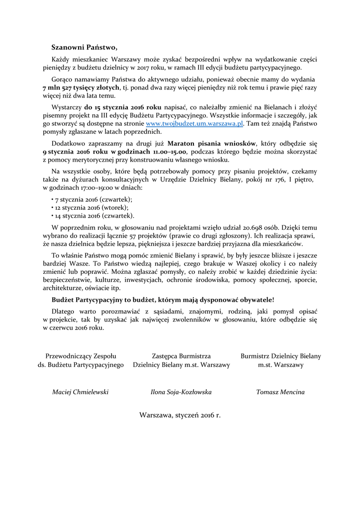 Szanowni Państwo, Każdy mieszkaniec Warszawy może zyskać bezpośredni wpływ na wydatkowanie części pieniędzy z budżetu dzielnicy w 2017 roku, w ramach III edycji budżetu partycypacyjnego. Gorąco namawiamy Państwa do aktywnego udziału, ponieważ obecnie mamy do wydania 7 mln 527 tysięcy złotych, tj. ponad dwa razy więcej pieniędzy niż rok temu i prawie pięć razy więcej niż dwa lata temu. Wystarczy do 15 stycznia 2016 roku napisać, co należałby zmienić na Bielanach i złożyć pisemny projekt na III edycję Budżetu Partycypacyjnego. Wszystkie informacje i szczegóły, jak go stworzyć są dostępne na stronie www.twojbudzet.um.warszawa.pl. Tam też znajdą Państwo pomysły zgłaszane w latach poprzednich. Dodatkowo zapraszamy na drugi już Maraton pisania wniosków, który odbędzie się 9 stycznia 2016 roku w godzinach 11.00–15.00, podczas którego będzie można skorzystać z pomocy merytorycznej przy konstruowaniu własnego wniosku. Na wszystkie osoby, które będą potrzebowały pomocy przy pisaniu projektów, czekamy także na dyżurach konsultacyjnych w Urzędzie Dzielnicy Bielany, pokój nr 176, I piętro, w godzinach 17:00–19:00 w dniach: • 7 stycznia 2016 (czwartek); • 12 stycznia 2016 (wtorek); • 14 stycznia 2016 (czwartek). W poprzednim roku, w głosowaniu nad projektami wzięło udział 20.698 osób. Dzięki temu wybrano do realizacji łącznie 57 projektów (prawie co drugi zgłoszony). Ich realizacja sprawi, że nasza dzielnica będzie lepsza, piękniejsza i jeszcze bardziej przyjazna dla mieszkańców. To właśnie Państwo mogą pomóc zmienić Bielany i sprawić, by były jeszcze bliższe i jeszcze bardziej Wasze. To Państwo wiedzą najlepiej, czego brakuje w Waszej okolicy i co należy zmienić lub poprawić. Można zgłaszać pomysły, co należy zrobić w każdej dziedzinie życia: bezpieczeństwie, kulturze, inwestycjach, ochronie środowiska, pomocy społecznej, sporcie, architekturze, oświacie itp. Budżet Partycypacyjny to budżet, którym mają dysponować obywatele! Dlatego warto porozmawiać z sąsiadami, znajomymi, rodziną, jaki pomysł opisać w projekcie, tak by uzyskać jak najwięcej zwolenników w głosowaniu, które odbędzie się w czerwcu 2016 roku. Przewodniczący Zespołu ds. Budżetu Partycypacyjnego Zastępca Burmistrza Dzielnicy Bielany m.st. Warszawy Burmistrz Dzielnicy Bielany m.st. Warszawy Maciej Chmielewski Ilona Soja-Kozłowska Tomasz Mencina Warszawa, styczeń 2016 r.