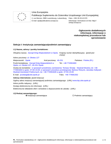 Unia Europejska Publikacja Suplementu do Dziennika Urzędowego Unii Europejskiej 2, rue Mercier, 2985 Luxembourg, Luksemburg Faks: +352 29 29 42 670 E-mail: [email protected] Informacje i formularze on-line: http:// simap.europa.eu Ogłoszenie dodatkowych informacji, informacje o niekompletnej procedurze lub sprostowanie Sekcja I: Instytucja zamawiająca/podmiot zamawiający I.1) Nazwa, adresy i punkty kontaktowe: Oficjalna nazwa: Zarząd Dróg Wojewódzkich w Opolu Krajowy numer identyfikacyjny: (jeżeli jest znany) _____ Adres pocztowy: ul. Oleska 127 Miejscowość: Opole Kod pocztowy: 45-231 Punkt kontaktowy: Zarząd Dróg Wojewódzkich w Opolu, ul. Oleska 127, 45-231 Opole Państwo: Polska (PL) Tel.: +48 774591800 Osoba do kontaktów: w sprawach przedmiotu zamówienia: Tomasz Śmiały - Wydział Mostów, tel. +48 774591833 w godz. 07:00-15:00; w sprawach procedury przetargowej: Bartosz Różycki, Jarosław Sołtysek Wydział Zamówień Publicznych, tel. +48 774591828 w godz. 07:00-15:00 E-mail: [email protected] Faks: +48 774581352 Adresy internetowe: (jeżeli dotyczy) Ogólny adres instytucji zamawiającej/ podmiotu zamawiającego: (URL) www.bip.zdw.opole.pl Adres profilu nabywcy: (URL) _____ Dostęp elektroniczny do informacji: (URL) _____ Elektroniczne składanie ofert i wniosków o dopuszczenie do udziału: (URL) _____ I.2) Rodzaj zamawiającego: Instytucja zamawiająca Podmiot zamawiający PL Formularz standardowy 14 - Ogłoszenie dodatkowych informacji, informacje o niekompletnej procedurze lub sprostowanie 1/5 Sekcja II: Przedmiot zamówienia II.1.1) Nazwa nadana zamówieniu: BUDOWA NOWEGO WIADUKTU DROGOWEGO NAD LINIĄ KOLEJOWĄ W CIĄGU DROGI WOJEWÓDZKIEJ NR 426 WRAZ Z BUDOWĄ TEJ DROGI W NOWYM ŚLADZIE NA ODCINKU OD KM 15+831,78 DO KM 16+279,11 W M. STRZELCE OPOLSKIE II.1.2) Krótki opis zamówienia lub zakupu: (podano w pierwotnym ogłoszeniu) przedmiotem zamówienia jest budowa nowego wiaduktu drogowego nad linią kolejową w ciągu drogi wojewódzkiej nr 426 wraz z budową tej drogi w nowym śladzie na odcinku od km 15+831,78 do km 16+279,11 w m. Strzelce Opolskie zgodnie z warunkami specyfikacji istotnych warunków zamówienia. Kod i nazwa Wspólnego Słownika Zamówień: 45.23.30.00-9 - roboty w zakresie konstruowania, fundamentowania oraz wykonywania nawierzchni autostrad, dróg; 45.22.20.00-9 - roboty budowlane w zakresie robót inżynieryjnych, z wyjątkiem mostów, tuneli, szybów i kolei podziemnej; 45.23.10.00-5 - roboty budowlane w zakresie budowy rurociągów, ciągów komunikacyjnych i linii energetycznych. Zakres zamówienia obejmuje: a) rozbudowę drogi na długości około 460 m, b) rozbudowę lub budowę skrzyżowań drogi wojewódzkiej nr426 z drogami publicznymi, c) przebudowę i budowę chodników, d) budowę ciągu pieszo rowerowego, e) budowę rowu retencyjnego, drogowego, wpustów ulicznych, f) budowę wiaduktu, g) przebudowę przepustu pod droga wojewódzka nr 426, h) budowę ekranu akustycznego, i) przebudowę i budowę oświetlenia ulicznego, j) budowę kanalizacji deszczowej, k) przebudowę lub zabezpieczenie sieci uzbrojenia terenu kolidującego z planowana rozbudową, l) roboty rozbiórkowe II.1.3) Wspólny Słownik Zamówień (CPV) Główny przedmiot Dodatkowe przedmioty Słownik główny 45233000 45222000 45231000 Słownik uzupełniający (jeżeli dotyczy) PL Formularz standardowy 14 - Ogłoszenie dodatkowych informacji, informacje o niekompletnej procedurze lub sprostowanie 2/5 Sekcja IV: Procedura IV.1)Rodzaj procedury (podano w pierwotnym ogłoszeniu) Otwarta Ograniczona Ograniczona przyspieszona Negocjacyjna Negocjacyjna przyspieszona Dialog konkurencyjny Negocjacyjna z uprzednim ogłoszeniem Negocjacyjna bez uprzedniego ogłoszenia Negocjacyjna z publikacją ogłoszenia o zamówieniu Negocjacyjna bez publikacji ogłoszenia o zamówieniu Udzielenie zamówienia bez uprzedniej publikacji ogłoszenia o zamówieniu w Dzienniku Urzędowym Unii Europejskiej IV.2)Informacje administracyjne IV.2.1)Numer referencyjny: (podano w pierwotnym ogłoszeniu) WP.3211.21.2015 IV.2.2)Dane referencyjne ogłoszenia w przypadku ogłoszeń przesłanych drogą elektroniczną: Pierwotne ogłoszenie przesłane przez eNotices TED eSender Login: ENOTICES_B6 Dane referencyjne ogłoszenia: 2015-063014 rok i numer dokumentu IV.2.3)Ogłoszenie, którego dotyczy niniejsza publikacja: Numer ogłoszenia w Dz.U.: 2015/S 094-168088 z dnia: 16/05/2015 (dd/mm/rrrr) IV.2.4)Data wysłania pierwotnego ogłoszenia: 12/05/2015 (dd/mm/rrrr) PL Formularz standardowy 14 - Ogłoszenie dodatkowych informacji, informacje o niekompletnej procedurze lub sprostowanie 3/5 Sekcja VI: Informacje uzupełniające VI.1) Ogłoszenie dotyczy: Procedury niepełnej Sprostowania Informacji dodatkowych VI.2) Informacje na temat niepełnej procedury udzielenia zamówienia: Postępowanie o udzielenie zamówienia zostało przerwane Postępowanie o udzielenie zamówienia uznano za nieskuteczne Zamówienia nie udzielono Zamówienie może być przedmiotem ponownej publikacji VI.3) Informacje do poprawienia lub dodania : VI.3.1) Zmiana oryginalnej informacji podanej przez instytucję zamawiającą Publikacja w witrynie TED niezgodna z oryginalną informacją, przekazaną przez instytucję zamawiającą Oba przypadki VI.3.2) W ogłoszeniu pierwotnym W odpowiedniej dokumentacji przetargowej (więcej informacji w odpowiedniej dokumentacji przetargowej) W obu przypadkach (więcej informacji w odpowiedniej dokumentacji przetargowej) VI.3.3) Tekst, który należy poprawić w pierwotnym ogłoszeniu Miejsce, w którym znajduje się Zamiast: zmieniany tekst: VI.3.4) Daty, które należy poprawić w pierwotnym ogłoszeniu Miejsce, w którym znajdują się Zamiast: zmieniane daty: 29/06/2015 Godzina: 11:00 IV.3.3) Warunki otrzymania (dd/mm/rrrr) specyfikacji, dokumentów dodatkowych lub dokumentu opisowego Powinno być: Powinno być: 01/07/2015 Godzina: 09:00 (dd/mm/rrrr) Miejsce, w którym znajdują się Zamiast: zmien
