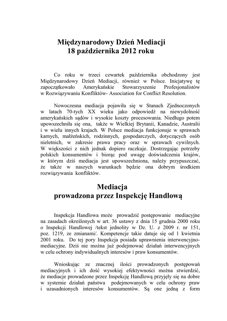 Międzynarodowy Dzień Mediacji 18 października 2012 roku Co roku w trzeci czwartek października obchodzony jest Międzynarodowy Dzień Mediacji, również w Polsce. Inicjatywę tę zapoczątkowało Amerykańskie Stowarzyszenie Profesjonalistów w Rozwiązywaniu Konfliktów- Association for Conflict Resolution. Nowoczesna mediacja pojawiła się w Stanach Zjednoczonych w latach 70-tych XX wieku jako odpowiedź na niewydolność amerykańskich sądów i wysokie koszty procesowania. Niedługo potem upowszechniła się ona, także w Wielkiej Brytanii, Kanadzie, Australii i w wielu innych krajach. W Polsce mediacja funkcjonuje w sprawach karnych, małżeńskich, rodzinnych, gospodarczych, dotyczących osób nieletnich, w zakresie prawa pracy oraz w sprawach cywilnych. W większości z nich jednak dopiero raczkuje. Dostrzegając potrzeby polskich konsumentów i biorąc pod uwagę doświadczenia krajów, w którym dziś mediacja jest upowszechniona, należy przypuszczać, że także w naszych warunkach będzie ona dobrym środkiem rozwiązywania konfliktów. Mediacja prowadzona przez Inspekcję Handlową Inspekcja Handlowa może prowadzić postępowanie mediacyjne na zasadach określonych w art. 36 ustawy z dnia 15 grudnia 2000 roku o Inspekcji Handlowej /tekst jednolity w Dz. U. z 2009 r. nr 151, poz. 1219, ze zmianami/. Kompetencje takie datuje się od 1 kwietnia 2001 roku. Do tej pory Inspekcja posiada uprawnienia interwencyjnomediacyjne. Dziś nie można już podejmować działań interwencyjnych w celu ochrony indywidualnych interesów i praw konsumentów. Wnioskując ze znacznej ilości prowadzonych postępowań mediacyjnych i ich dość wysokiej efektywności można stwierdzić, że mediacje prowadzone przez Inspekcję Handlową przyjęły się na dobre w systemie działań państwa podejmowanych w celu ochrony praw i uzasadnionych interesów konsumentów. Są one jedną z form tzw. alternatywnych metod rozwiązywania sporów /z języka angielskiego ADR: Alternative Dispute Resolution/, których zasady funkcjonowania zostały określone w sposób ramowy w Zaleceniu Komisji Europejskiej z dnia 4 kwietnia 2001 r. w sprawie zasad dotyczących organów pozasądowych uczestniczących w polubownym rozstrzyganiu sporów konsumenckich /2001/310/WE/. 1. Czym jest mediacja? Zgodnie z definicją określoną przez Społeczną Radę ds. Alternatywnych Metod Rozwiązywania Konfliktów i Sporów przy Ministrze Sprawiedliwości, „przez mediację rozumie się dobrowolny i poufny proces, w którym fachowo przygotowana, niezależna i bezstronna osoba, za zgodą stron, pomaga im poradzić sobie z konfliktem”. Mediacja pozwala jej uczestnikom określić kwestie sporne, zmniejszyć bariery komunikacyjne, opracować propozycje rozwiązań i, jeśli taka jest wola stron, zawrzeć wzajemnie satysfakcjonujące porozumienie. 2. W jakich sprawach Inspekcja Handlowa może wszcząć postępowanie mediacyjne? Inspekcja Handlowa ma kompetencje do prowadzenia mediacji w zakresie sporu cywilnoprawnego powstałego między konsumentem, a przedsiębiorcą, np. na tle sposobu załatwienia reklamacji towaru lub usługi przez przedsiębiorcę. Zgodnie z art. 22¹ Kodeksu cywilnego, „za konsumenta uważa się osobę fizyczną dokonującą czynności prawnej niezwiązanej bezpośrednio z jej działalnością gospodarczą lub zawodową”. W takiej sytuacji nie jest konsumentem ten, kto dokonuje zakupu na rzecz firmy lub w celu wykonywania swojego zawodu. Nie posiadamy uprawnień do wszczynania mediacji w sporach między osobami fizycznymi, tzn. gdy obie strony są osobami prywatnymi, lub w sporach między przedsiębiorcami. W takich przypadkach zainteresowani mogą poszukiwać rozwiązań polubownych w ramach sądowej mediacji cywilnej, a w ostateczności dochodzić swoich roszczeń na drodze sądowej. W ustawie o Inspekcji Handlowej znajdziemy zapisy wyłączające stosowanie przepisów tego aktu prawnego, co oznacza, że nie można prowadzić mediacji w sprawach dotyczących: - banków oraz prowadzonej przez nie działalności bankowej, - ubezpieczeń i działalności ubezpieczeniowej, - usług pocztowych i telekomunikacyjnych, - usług pośrednictwa finansowego, usług informatycznych, - usług naukowo-badawczych, - usług w zakresie edukacji, - usług w zakresie ochrony zdrowia i opieki społecznej, - nawozów i środków wspomagających uprawę roślin, -przedsiębiorców produkujących energię elektryczną, lub prowadzących hurtowy, detaliczny handel energią, -przedsiębiorców produkujących paliwa, -przedsiębiorców działających na terenach zamkniętych, podlegających ministrowi właściwemu do spraw wewnętrznych, Ministrowi Obrony Narodowej i Ministrowi Sprawiedliwości. W w/w sprawach konsument może zwrócić się o pomoc do powiatowego lub miejskiego rzecznika konsumentów, organizacji konsumenckich, np. Stowarzyszenia Konsumentów Polskich, czy Federacji Konsumentów, lub w konkretnych dziedzinach do Rzecznika Ubezpieczonych, Bankowego Arbitra Konsumenckiego, Rzecznika Praw Pacjenta, Rzecznika Odbiorców Paliw i Energii lub do innych właściwych instytucji, np. Urzędu Komunikacji Elektronicznej. 3.Jakie są ogólne warunki wszczęcia postępowania mediacyjnego przez Wojewódzkiego Inspektora Inspekcji Handlowej? Wojewódzki Inspektor Inspekcji Handlowej wszczyna postępowanie mediacyjne, jeżeli przemawia za tym charakter sprawy, z reguły na wniosek konsumenta. Wszczęcie mediacji z urzędu jest również możliwe, jeżeli wymaga tego ochrona uzasadnionego interesu konsumenta. Bez zgody konsumenta nie dojdzie jednak ona do skutku. 4.Gdzie można o mediację? otrzymać formularz wniosku Formularz wniosku konsumenta o wszczęcie procedury mediacji jest dostępny w siedzibie każdego Wojewódzkiego Inspektoratu Inspekcji Handlowej lub można go znaleźć na stronach internetowych poszczególnych wojewódzkich inspektoratów Inspekcji Handlowej. Gdy zajdzie taka potrzeba, pracownicy Wydziału Ochrony