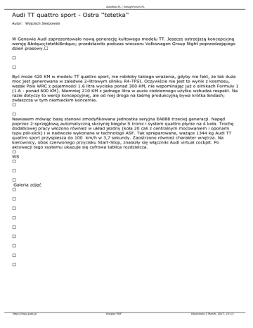 AutoRok.PL / DesignForum.PL Audi TT quattro sport - Ostra ''tetetka'' Autor: Wojciech Sierpowski W Genewie Audi zaprezentowało nową generację kultowego modelu TT. Jeszcze ostrzejszą koncepcyjną wersję „tetetki” przedstawiło podczas wieczoru Volkswagen Group Night poprzedzającego dzień prasowy. Być może 420 KM w modelu TT quattro sport, nie robiłoby takiego wrażenia, gdyby nie fakt, że tak duża moc jest generowana w zaledwie 2-litrowym silniku R4-TFSI. Oczywiście nie jest to wynik z kosmosu, wszak Polo WRC z pojemności 1.6 litra wyciska ponad 300 KM, nie wspominając już o silnikach Formuły 1 (1.6 - ponad 600 KM). Niemniej 210 KM z jednego litra w aucie codziennego użytku wzbudza respekt. Na razie dotyczy to wersji koncepcyjnej, ale od niej droga na taśmę produkcyjną bywa krótka – zwłaszcza w tym niemieckim koncernie. Nawiasem mówiąc bazę stanowi zmodyfikowana jednostka seryjna EA888 trzeciej generacji. Napęd poprzez 2-sprzęgłową automatyczną skrzynię biegów S tronic i system quattro płynie na 4 koła. Trochę dodatkowej pracy włożono również w układ jezdny (koła 20 cali z centralnym mocowaniem i oponami typu pół-slick) i w nadwozie wykonane w technologii ASF. Tak spreparowane, ważące 1344 kg Audi TT quattro sport przyspiesza do 100 km/h w 3,7 sekundy. Zaostrzono również charakter wnętrza. Na kierownicy, obok czerwonego przycisku Start-Stop, znalazły się włączniki Audi virtual cockpit. Po aktywacji tego systemu ukazuje się cyfrowa tablica rozdzielcza. WS Galeria zdjęć http://mas.auto.pl Kreator PDF Utworzono 2 March, 2017, 15:13