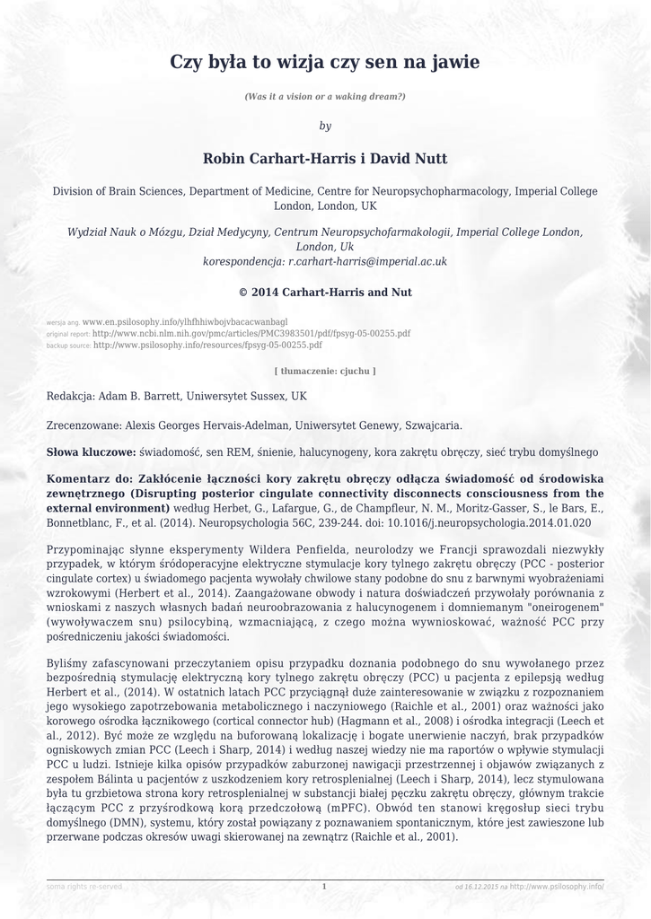 Czy była to wizja czy sen na jawie (Was it a vision or a waking dream?) by Robin Carhart-Harris i David Nutt Division of Brain Sciences, Department of Medicine, Centre for Neuropsychopharmacology, Imperial College London, London, UK Wydział Nauk o Mózgu, Dział Medycyny, Centrum Neuropsychofarmakologii, Imperial College London, London, Uk korespondencja: [email protected] © 2014 Carhart-Harris and Nut wersja ang. www.en.psilosophy.info/ylhfhhiwbojvbacacwanbagl original report: http://www.ncbi.nlm.nih.gov/pmc/articles/PMC3983501/pdf/fpsyg-05-00255.pdf backup source: http://www.psilosophy.info/resources/fpsyg-05-00255.pdf [ tłumaczenie: cjuchu ] Redakcja: Adam B. Barrett, Uniwersytet Sussex, UK Zrecenzowane: Alexis Georges Hervais-Adelman, Uniwersytet Genewy, Szwajcaria. Słowa kluczowe: świadomość, sen REM, śnienie, halucynogeny, kora zakrętu obręczy, sieć trybu domyślnego Komentarz do: Zakłócenie łączności kory zakrętu obręczy odłącza świadomość od środowiska zewnętrznego (Disrupting posterior cingulate connectivity disconnects consciousness from the external environment) według Herbet, G., Lafargue, G., de Champfleur, N. M., Moritz-Gasser, S., le Bars, E., Bonnetblanc, F., et al. (2014). Neuropsychologia 56C, 239-244. doi: 10.1016/j.neuropsychologia.2014.01.020 Przypominając słynne eksperymenty Wildera Penfielda, neurolodzy we Francji sprawozdali niezwykły przypadek, w którym śródoperacyjne elektryczne stymulacje kory tylnego zakrętu obręczy (PCC - posterior cingulate cortex) u świadomego pacjenta wywołały chwilowe stany podobne do snu z barwnymi wyobrażeniami wzrokowymi (Herbert et al., 2014). Zaangażowane obwody i natura doświadczeń przywołały porównania z wnioskami z naszych własnych badań neuroobrazowania z halucynogenem i domniemanym "oneirogenem" (wywoływaczem snu) psilocybiną, wzmacniającą, z czego można wywnioskować, ważność PCC przy pośredniczeniu jakości świadomości. Byliśmy zafascynowani przeczytaniem opisu przypadku doznania podobnego do snu wywołanego przez bezpośrednią stymulację elektryczną kory tylnego zakrętu obręczy (PCC) u pacjenta z epilepsją według Herbert et al., (2014). W ostatnich latach PCC przyciągnął duże zainteresowanie w związku z rozpoznaniem jego wysokiego zapotrzebowania metabolicznego i naczyniowego (Raichle et al., 2001) oraz ważności jako korowego ośrodka łącznikowego (cortical connector hub) (Hagmann et al., 2008) i ośrodka integracji (Leech et al., 2012). Być może ze względu na buforowaną lokalizację i bogate unerwienie naczyń, brak przypadków ogniskowych zmian PCC (Leech i Sharp, 2014) i według naszej wiedzy nie ma raportów o wpływie stymulacji PCC u ludzi. Istnieje kilka opisów przypadków zaburzonej nawigacji przestrzennej i objawów związanych z zespołem Bálinta u pacjentów z uszkodzeniem kory retrosplenialnej (Leech i Sharp, 2014), lecz stymulowana była tu grzbietowa strona kory retrosplenialnej w substancji białej pęczku zakrętu obręczy, głównym trakcie łączącym PCC z przyśrodkową korą przedczołową (mPFC). Obwód ten stanowi kręgosłup sieci trybu domyślnego (DMN), systemu, który został powiązany z poznawaniem spontanicznym, które jest zawieszone lub przerwane podczas okresów uwagi skierowanej na zewnątrz (Raichle et al., 2001). soma rights re-served 1 od 16.12.2015 na http://www.psilosophy.info/ czy była to wizja czy sen na jawie www.psilosophy.info/ylhfhhiwbojvbacacwanbagl Po przeczytaniu raportu Herbet et al., uderzyły nas podobieństwa między subiektywnymi raportami zdanymi po stymulacji PCC i zaobserwowanymi po kontrolowanym podaniu klasycznego halucynogenu, psilocybiny (Carhart-Harris et al., 2012; Muthukumaraswamy et al., 2013). Jak omawia Herbert et al., stymulacja wiązki PCC/zakrętu obręczy prawdopodobnie zahamowała aktywność w tym regionie i przerwała komunikację między mPFC a PCC. Co ważne, odmieniona aktywność PCC (tj. zmniejszony przepływ krwi i moc oscylacyjna oraz łączność funkcjonalna mPFC-PCC) były najbardziej wyraźnym i wiarygodnym wnioskiem naszych badań obrazowania psilocybiny a ochotnicy sprawozdali doświadczanie stanu podobnego do snu i barwnych wyobrażeń wzrokowych (Carhart-Harris et al., 2012, 2014; Muthukumaraswamy et al., 2013). Ponadto, po psilocybinie sprawozdane zostały trwałe poprawy dobrego samopoczucia (Griffiths et al., 2006) oraz długotrwałe spadki w objawach depresyjnych (Grob et al., 2011) i niezwykłym było przeczytanie opisu pacjenta Herberta et al. opisującego brak rozmyślania i "absolutne szczęście" przez dłuższy okres po resekcji PCC. Czy możliwe, że psilocybina wytwarza długotrwałe zmiany w aktywności PCC i/lub DMN, co mogłoby wyjaśniać jej domniemany potencjał terapeutyczny (Carhart-Harris et al., 2014)? Jest to coś, co zamierzamy sprawdzić w zbliżającym się badaniu psilocybiny w leczeniu poważnej depresji (Roiser i Rees, 2012). Ostatecznie, teoretyczne implikacje raportu Herberta et al., są gruntowne. Autorzy zauważają, że mózgowy przepływ krwi PCC jest zmniejszony we śnie z szybkimi ruchami gałek ocznych (REM) w stosunku do jawy (Braun et al., 1997) i snu nie-REM (Maquet et al., 1996). Od dawna intrygującą dla nas kwestią było to, że LSD podane tuż przed rozpoczęciem snu (Muzio et al., 1996) lub dożylnie podczas snu (Torda, 1968) wyraźnie pobudza sen REM. Klasyczne halucynogeny serotonergiczne, LSD, psilocybina i dimetylotryptamina znane są z wytwarzania barwnej i złożonej wyobrażeniowości, zwłaszcza przy zamkniętych oczach, które są często opisywane jako podobne do snu (Grinspoon i Bakalar, 1979). Kolejną wspólną cechą snu REM i lekowych stanów halucynogennych jest zmiana w aktywności przyśrodkowych płatów skroniowych (MTLs - Medial Temporal Lobes). Na przykład, MTLs są hiperaktywne we śnie REM (Maquet et al., 1996; Braun et al., 1997; Miyauchi et al., 2009) i wykazują po psilocybinie zwięk