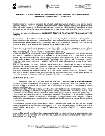 Aktywność w czasie studiów, czyli jak zwiększyć swoje szanse na rynku pracy oraz jak odpowiednio zaprezentować to pracodawcy Wszelkie raporty i wskaźniki pokazują, że sytuacja współczesnych absolwentów jest bardzo ciężka. Ogromny odsetek osób z wyższym wykształceniem, coraz wyższe wymagania pracodawców, niedostosowane programy studiów to tylko niektóre z czynników, które powodują, że wejście na rynek pracy jawi się jako coraz trudniejsze zadanie/wyzwanie jakie stoi przed współczesnym absolwentem. Możemy zatem zadać sobie pytanie: CO ZROBIĆ, ŻEBY NIE OBAWIAĆ SIĘ WEJŚCIA NA RYNEK PRACY? Nie ma jednej – dobrej odpowiedzi. W czasie poszukiwania pracy liczy się bowiem wiele czynników. Z jednej strony kwestie związane z wykształceniem, doświadczeniem i kwalifikacjami, z drugiej kwestie osobowościowe, które wpływają bezpośrednio na naszą autoprezentację, ułatwiając bądź utrudniając nawiązanie relacji z pracodawcą m.in. w czasie rozmowy kwalifikacyjnej. Trudno też o wartościowanie poszczególnych elementów – w jednym przypadku o sukcesie na rozmowie kwalifikacyjnej zaważyć może fakt, że ukończyliśmy dodatkowe szkolenie, w innym, fakt że mamy predyspozycje osobowościowe do wykonywania danej pracy. W artykule chciałabym skupić się na poszczególnych czynnikach – elementach, nad którymi możemy pracować – doskonalić - związanych z szeroko rozumianą aktywnością podejmowaną w trakcie studiów. Bez względu bowiem na nasz charakter i usposobienie współczesny rynek pracy wymusza na nas podejmowanie rozlicznych aktywności. Pracodawcy nie wystarczy już przysłowiowy „papier”. Teraz liczy się nasza inicjatywa – wszelka działalność poza zdobywaniem wiedzy i zdawaniem egzaminów. Mam w tym miejscu na myśli praktyki, staże, wolontariat, członkostwo w kołach naukowych, organizacjach studenckich oraz wszelkich organizacjach pozarządowych, fundacjach, wyjazdy na wymiany zagraniczne – wymiany studenckie, warsztaty, szkolenia i treningi. W artykule postaram się wskazać miejsca, w których można uzyskać potrzebne informacje, porady oraz zdobyć wiedzę i umiejętności potrzebne później na rynku pracy oraz udzielić kilku wskazówek odnośnie konstruowania dokumentów aplikacyjnych CV i listu motywacyjnego. Akademickie biura karier Pierwszym miejscem do którego warto się udać jest z pewnością akademickie biuro karier. Można tu uzyskać informacje na temat bieżących trendów i sytuacji na rynku pracy, zapoznać się z ofertami praktyk/pracy/staży, skonsultować swoje dokumenty aplikacyjne czy przygotować się do rozmowy kwalifikacyjnej . Pracownikami Biur Karier są doradcy zawodowi, trenerzy i szkoleniowcy, którzy poprzez różne formy współpracy wspierają studentów w podejmowaniu decyzji zawodowych, zdobywaniu wiedzy oraz doskonaleniu umiejętności, które w znacznym stopniu pomagają w płynnym wejściu na rynek pracy. Komunikacja, współpraca w zespole, umiejętność negocjacji, asertywność – to tylko niektóre tematy podejmowane na szkoleniach i warsztatach. W niewielkich, kilkunasto osobowych grupach szlifujemy umiejętności interpersonalne, oswajamy się z wystąpieniami publicznymi oraz mamy okazję nawiązać nowe kontakty. Biuro karier to również miejsce konsultacji z doradcą zawodowym. Spotkania mają na celu między innymi przygotowanie dokumentów aplikacyjnych (CV i listu motywacyjnego), wyznaczanie ścieżki kariery - celu zawodowego oraz uzyskanie informacji na temat możliwości podnoszenia swoich kwalifikacji. Jedną z głównych ról biura karier jest nawiązywanie i utrzymywanie kontaktów z pracodawcami, stąd takie inicjatywy jak prezentacje firm, spotkania ze studentami, szkolenia prowadzone przez trenerów zewnętrznych oraz targi pracy. Napisanie artykułu sfinansowane zostało ze środków Unii Europejskiej w ramach Europejskiego Funduszu Społecznego Większość biur karier posiada swoją stronę internetową, na której umieszczane są najnowsze oferty pracy/praktyk/staży, informacje o inicjatywach podejmowanych przez pracodawców, projektach realizowanych przez biuro karier, targach pracy, konkursach oraz szkoleniach i warsztatach. Wymiany studenckie – wyjazdy zagraniczne Coraz częściej zauważanym zjawiskiem jest mobilność studentów w trakcie studiów. Studenci mają możliwość studiowania zarówno na różnych uczelniach w kraju , jak również na uczelniach zagranicznych. Studia za granicą powoli stają się codziennością. Programy realizowane przez uczelnie (np. ERASMUS) umożliwiają studiowanie i poznawanie innych kultur i języka jednocześnie. Jest to doskonała okazja aby szlifować języki obce, poznać kulturę innych krajów, pracować w międzynarodowych grupach projektowych oraz nawiązać nowe kontakty. Okazuje się również, że studia i udział w międzynarodowych projektach studenckich mogą być twardym argumentem podczas „negocjacji” z potencjalnymi pracodawcami, zwłaszcza kiedy oprócz realizowania programu studiów podejmowaliśmy dodatkowe aktywności. Praktyki i staże u pracodawców Przeglądając oferty pracy coraz częściej napotykamy na informację w wymaganiach – oczekiwane doświadczenie zawodowe na wyżej wymienionym stanowisku. Można zadać pytanie, kiedy? Odpowiedź jest prosta. PRAKTYKUJ! Tu jednak warto się zastanowić i odpowiednio przygotować do podjęcia współpracy z pracodawcą. Nie chodzi bowiem o to aby zdobywać doświadczenie gdziekolwiek. Po pierwsze warto wiedzieć czego chcemy się nauczyć, jakie umiejętności chcielibyśmy zdobyć. Przed rozmową z pracodawcą zaplanuj jakie pytania chcesz zadać, czym chciałbyś się zajmować podczas praktyki czy stażu. Nie bój się mówić wprost o swoich oczekiwaniach. Czas spędzony u pracodawcy to czas który powinieneś wykorzystać maksymalnie. Po drugie, w trakcie praktyk wykazuj się inicjatywą i aktywnością. Nie daj się wtł