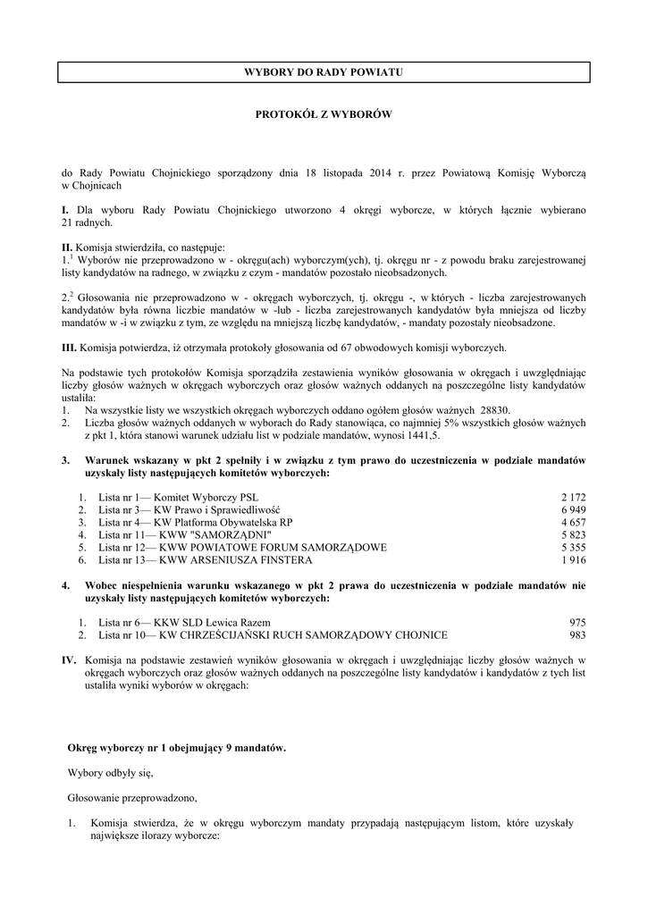 WYBORY DO RADY POWIATU PROTOKÓŁ Z WYBORÓW do Rady Powiatu Chojnickiego sporządzony dnia 18 listopada 2014 r. przez Powiatową Komisję Wyborczą w Chojnicach I. Dla wyboru Rady Powiatu Chojnickiego utworzono 4 okręgi wyborcze, w których łącznie wybierano 21 radnych. II. Komisja stwierdziła, co następuje: 1.1 Wyborów nie przeprowadzono w - okręgu(ach) wyborczym(ych), tj. okręgu nr - z powodu braku zarejestrowanej listy kandydatów na radnego, w związku z czym - mandatów pozostało nieobsadzonych. 2.2 Głosowania nie przeprowadzono w - okręgach wyborczych, tj. okręgu -, w których - liczba zarejestrowanych kandydatów była równa liczbie mandatów w -lub - liczba zarejestrowanych kandydatów była mniejsza od liczby mandatów w -i w związku z tym, ze względu na mniejszą liczbę kandydatów, - mandaty pozostały nieobsadzone. III. Komisja potwierdza, iż otrzymała protokoły głosowania od 67 obwodowych komisji wyborczych. Na podstawie tych protokołów Komisja sporządziła zestawienia wyników głosowania w okręgach i uwzględniając liczby głosów ważnych w okręgach wyborczych oraz głosów ważnych oddanych na poszczególne listy kandydatów ustaliła: 1. Na wszystkie listy we wszystkich okręgach wyborczych oddano ogółem głosów ważnych 28830. 2. Liczba głosów ważnych oddanych w wyborach do Rady stanowiąca, co najmniej 5% wszystkich głosów ważnych z pkt 1, która stanowi warunek udziału list w podziale mandatów, wynosi 1441,5. 3. Warunek wskazany w pkt 2 spełniły i w związku z tym prawo do uczestniczenia w podziale mandatów uzyskały listy następujących komitetów wyborczych: 1. 2. 3. 4. 5. 6. 4. Lista nr 1— Komitet Wyborczy PSL Lista nr 3— KW Prawo i Sprawiedliwość Lista nr 4— KW Platforma Obywatelska RP Lista nr 11— KWW "SAMORZĄDNI" Lista nr 12— KWW POWIATOWE FORUM SAMORZĄDOWE Lista nr 13— KWW ARSENIUSZA FINSTERA 2 172 6 949 4 657 5 823 5 355 1 916 Wobec niespełnienia warunku wskazanego w pkt 2 prawa do uczestniczenia w podziale mandatów nie uzyskały listy następujących komitetów wyborczych: 1. 2. Lista nr 6— KKW SLD Lewica Razem Lista nr 10— KW CHRZEŚCIJAŃSKI RUCH SAMORZĄDOWY CHOJNICE 975 983 IV. Komisja na podstawie zestawień wyników głosowania w okręgach i uwzględniając liczby głosów ważnych w okręgach wyborczych oraz głosów ważnych oddanych na poszczególne listy kandydatów i kandydatów z tych list ustaliła wyniki wyborów w okręgach: Okręg wyborczy nr 1 obejmujący 9 mandatów. Wybory odbyły się, Głosowanie przeprowadzono, 1. Komisja stwierdza, że w okręgu wyborczym mandaty przypadają następującym listom, które uzyskały największe ilorazy wyborcze: 2 1 mandat dla listy nr 1 - Komitet Wyborczy PSL 2 mandaty dla listy nr 3 - KW Prawo i Sprawiedliwość 2 mandaty dla listy nr 4 - KW Platforma Obywatelska RP 1 mandat dla listy nr 11 - KWW "SAMORZĄDNI" 1 mandat dla listy nr 12 - KWW POWIATOWE FORUM SAMORZĄDOWE 2 mandaty dla listy nr 13 - KWW ARSENIUSZA FINSTERA Radnymi zostali wybrani: 1) FINSTER Arseniusz Jerzy z listy nr 13 KWW ARSENIUSZA FINSTERA 2) KACZMAREK Małgorzata Maria z listy nr 12 KWW POWIATOWE FORUM SAMORZĄDOWE 3) REDZIMSKI Leszek Andrzej z listy nr 4 KW Platforma Obywatelska RP 4) SKAJA Stanisław Feliks z listy nr 11 KWW "SAMORZĄDNI" 5) STANKE Piotr Jerzy z listy nr 3 KW Prawo i Sprawiedliwość 6) ZAWADZKI Leszek Andrzej z listy nr 1 Komitet Wyborczy PSL 7) MRÓWCZYŃSKI Aleksander Mikołaj z listy nr 3 KW Prawo i Sprawiedliwość 8) PALUCH Mariusz Zbigniew z listy nr 13 KWW ARSENIUSZA FINSTERA 9) SZCZEPAŃSKI Marek z listy nr 4 KW Platforma Obywatelska RP 2.3 W związku z tym, iż -kandydatów otrzymało równą liczbę głosów uprawniającą do przyznania im mandatu z listy nr -radnym(ą) został(a) - , który(a) otrzymał(a)największą liczbę głosów w większej liczbie obwodów głosowania. 3.3 W związku, z tym, iż także liczba obwodów, w której kandydaci uzyskali największą liczbę głosów była równa, radnym(ą) w wyniku losowania został(a) został(a) 4. Komisja stwierdza, że - mandat(y) nie został(y) obsadzony(e), bowiem liczba kandydatów umieszczonych na: - liście nr - (-) jest mniejsza niż liczba mandatów przypadających na tę listę (-). 5.4 Komisja stwierdza, że - mandat(y) nie został(y) obsadzony(e) bowiem liczba kandydatów umieszczonych na zarejestrowanej(ych) liscie/listach w okręgu, którzy uzyskali mandaty radnych bez przeprowadzania głosowania (-) była mniejsza od liczby mandatów w okręgu (-). 6.4 Komisja stwierdza, że wobec niezarejestrowania żadnej listy kandydatów na radnych w okręgu pozostaje nieobsadzonych 0 mandatów 3 Okręg wyborczy nr 2 obejmujący 4 mandatów. Wybory odbyły się, Głosowanie przeprowadzono, 1. Komisja stwierdza, że w okręgu wyborczym mandaty przypadają następującym listom, które uzyskały największe ilorazy wyborcze: 1 mandat dla listy nr 3 - KW Prawo i Sprawiedliwość 1 mandat dla listy nr 4 - KW Platforma Obywatelska RP 1 mandat dla listy nr 11 - KWW "SAMORZĄDNI" 1 mandat dla listy nr 12 - KWW POWIATOWE FORUM SAMORZĄDOWE Radnymi zostali wybrani: 1) KIJEK Krystyna z listy nr 12 KWW POWIATOWE FORUM SAMORZĄDOWE 2) PRUSKI Mieczysław Józef z listy nr 11 KWW "SAMORZĄDNI" 3) STĘPIEŃ Bożena Grażyna z listy nr 4 KW Platforma Obywatelska RP 4) WIRKUS Eugeniusz Józef z listy nr 3 KW Prawo i Sprawiedliwość 2.3 W związku z tym, iż -kandydatów otrzymało równą liczbę głosów uprawniającą do przyznania im mandatu z listy nr -radnym(ą) został(a) - , który(a) otrzymał(a)największą liczbę głosów w większej liczbie obwodów głosowania. 3.3 W związku, z tym, iż także liczba obwodów, w której kandydaci uzyskali największą liczbę głosów była równa, radnym(ą) w wyniku losowania został(a) został(a) 4. Komisja stwierdza, że - mandat(y) nie został(y) obsadzony(e), bowiem liczba kandydatów umieszczonych na: - liście nr - (-) jest mniejsza niż liczba 